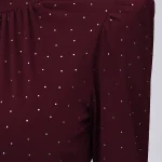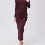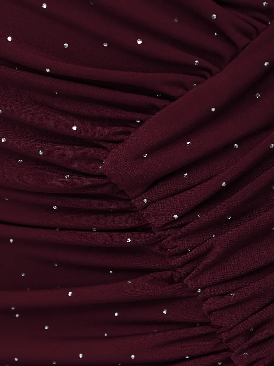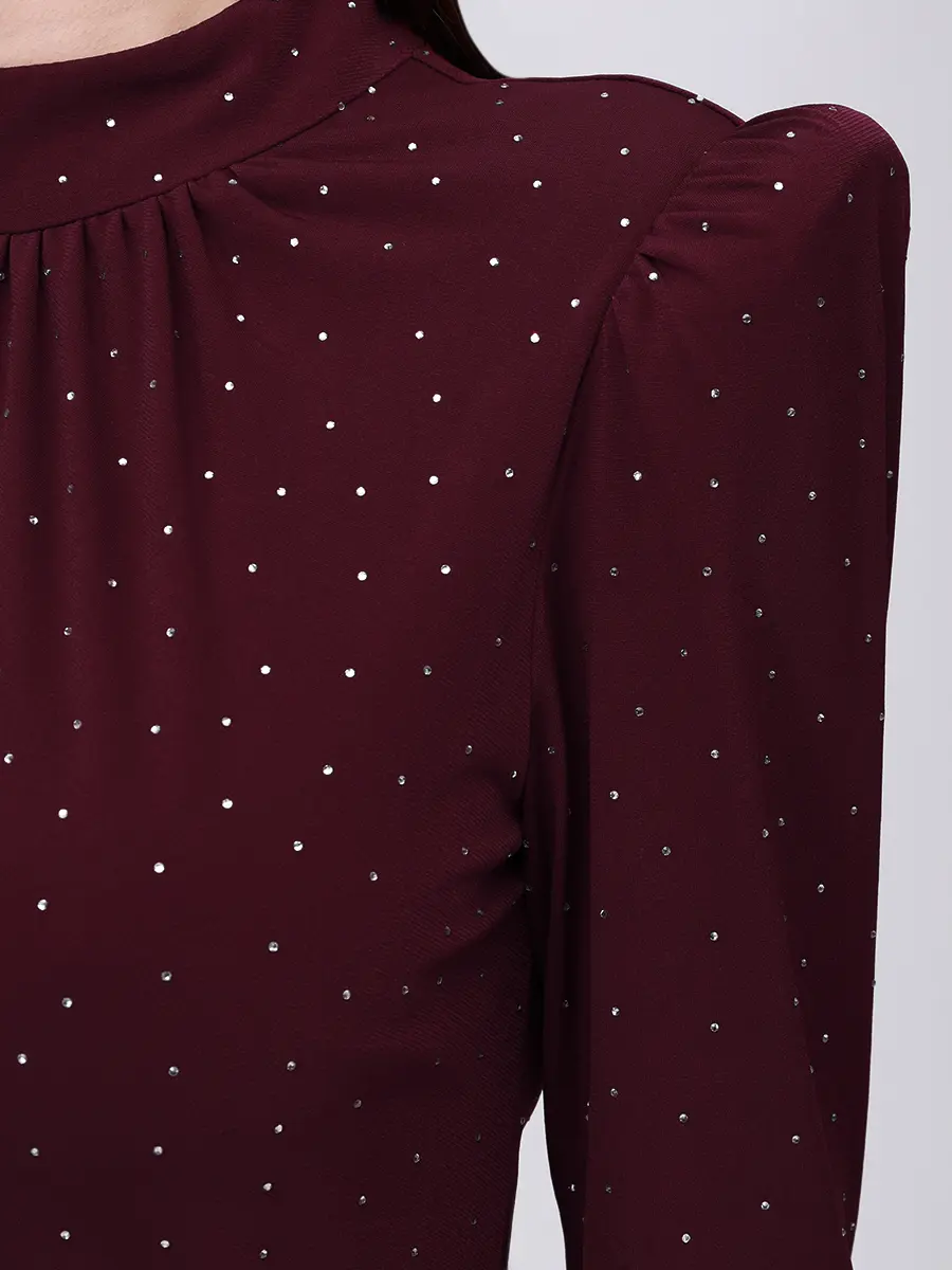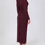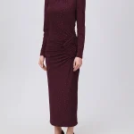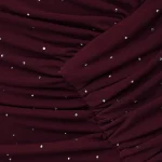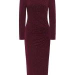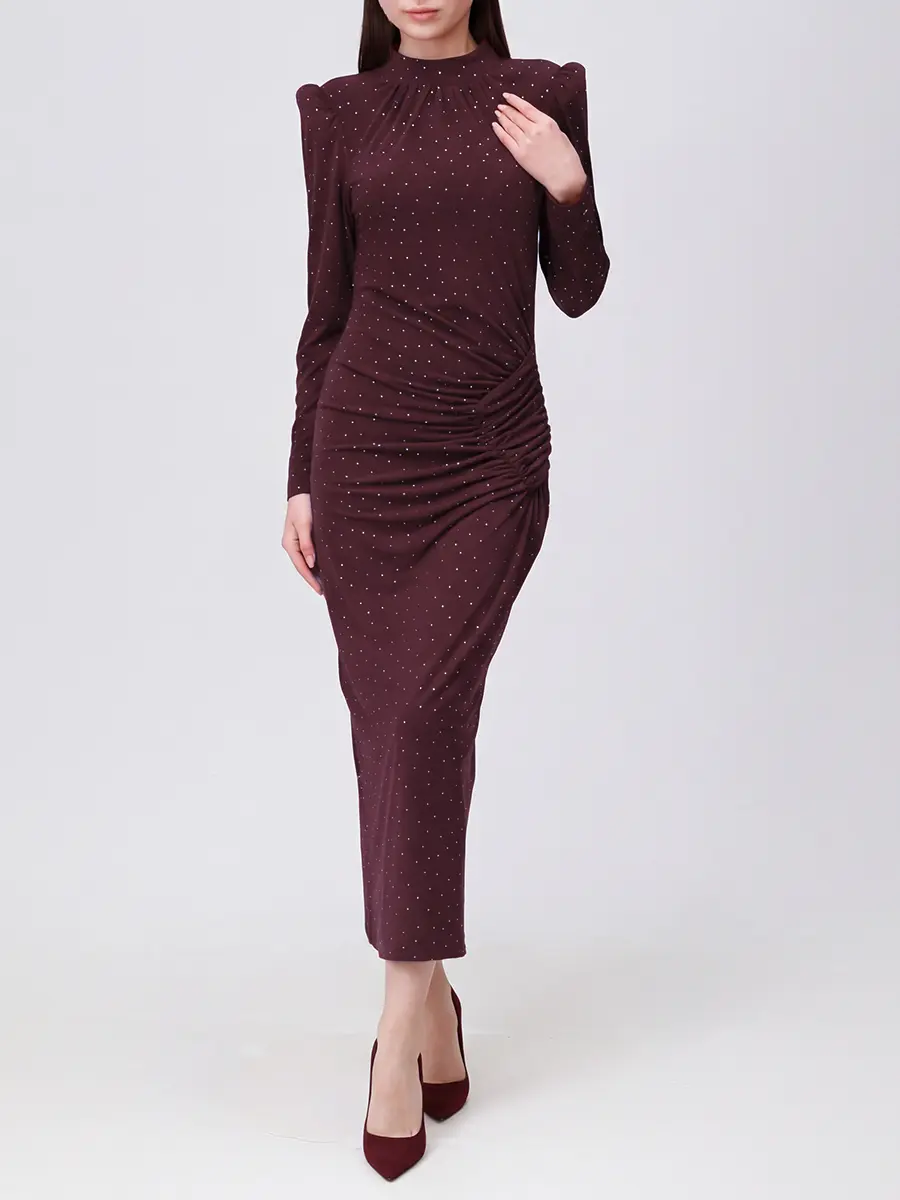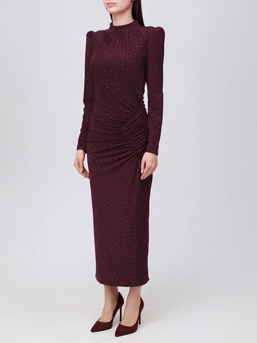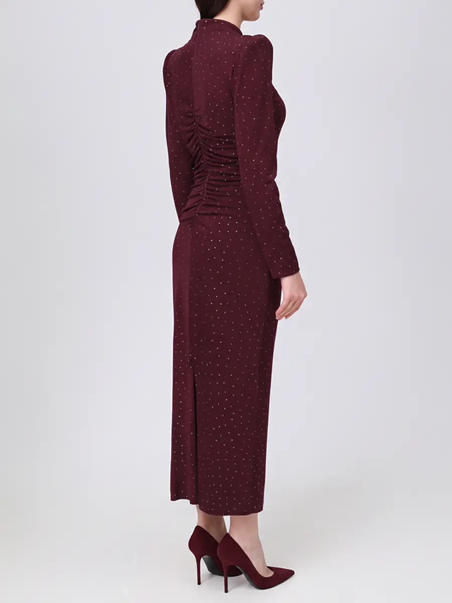 -Бордовое платье-миди от NISSA. -Модель приталенного силуэта с длинными рукавами, невысоким воротником-стойкой, драпировкой на талии, разрезом сзади и застежкой на молнию на спинке. -Полотно полностью расшито мелкими кристаллами, и их рассеянное сияние делает фактуру живой, будто мерцающей изнутри. -Лаконичное платье, в котором нет ничего лишнего уместно дополнит коктейльные или вечерние мероприятия.