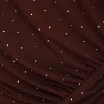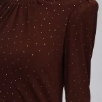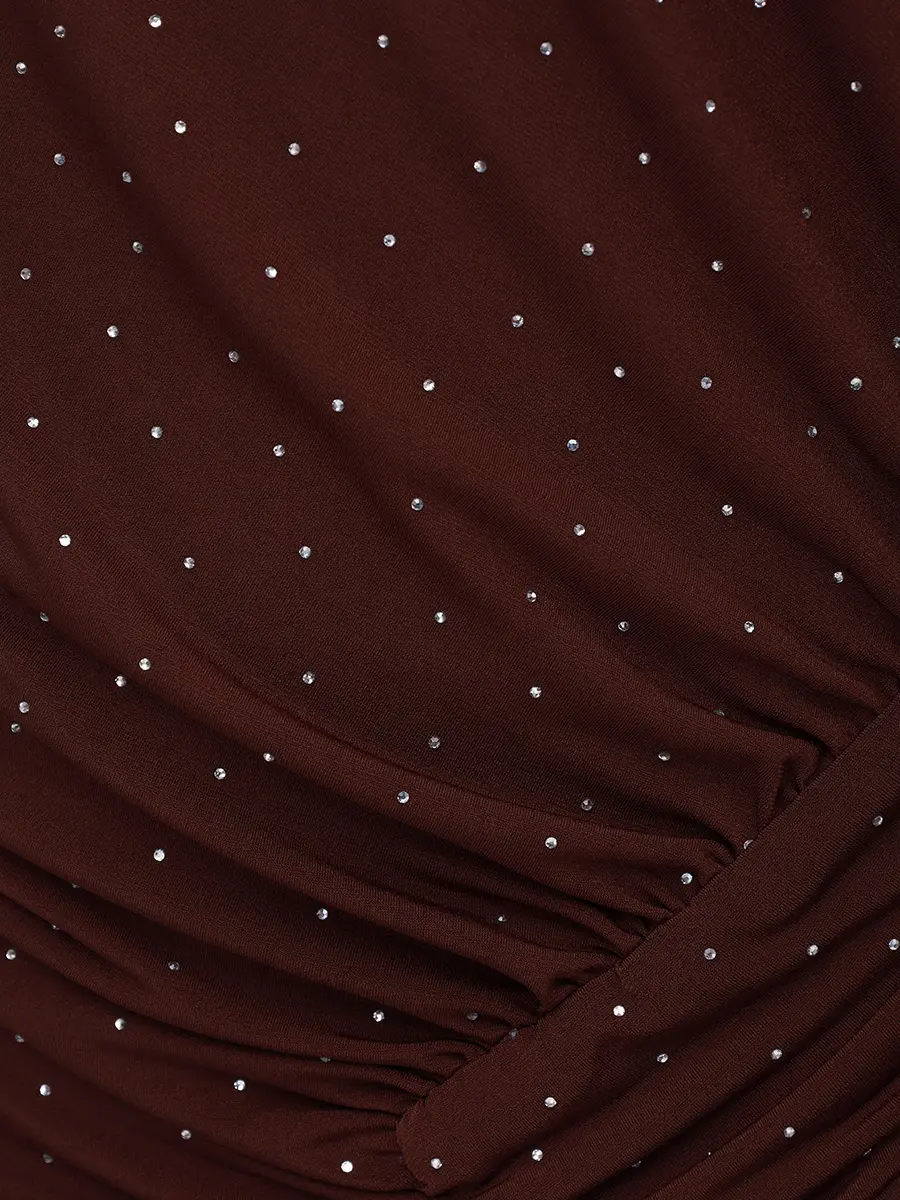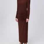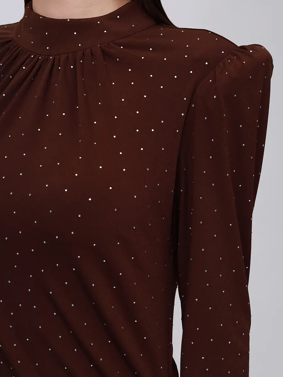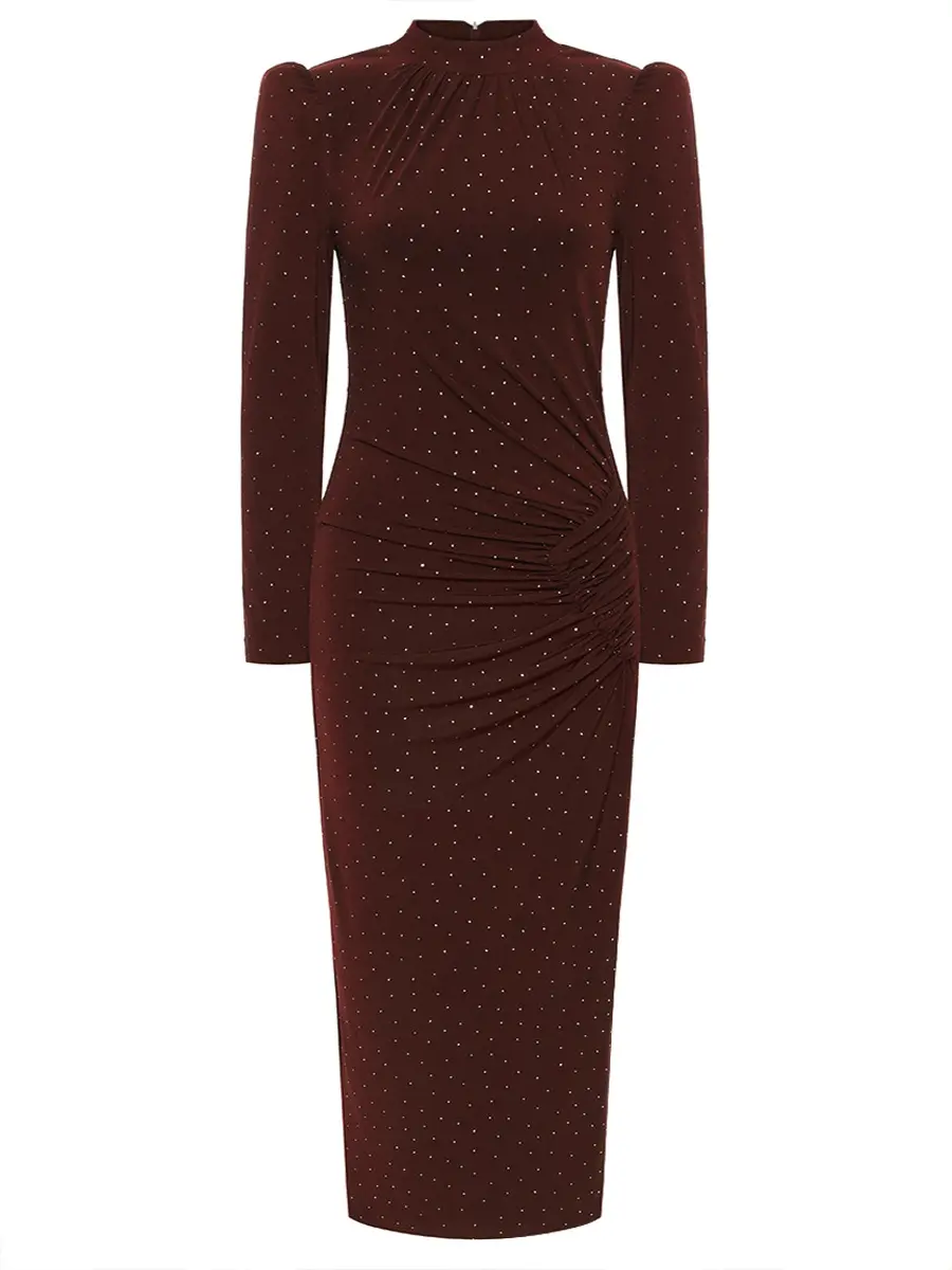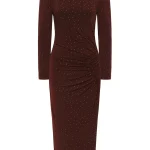 -Коричневое платье-миди от NISSA. -Модель приталенного силуэта с длинными рукавами, невысоким воротником-стойкой, драпировкой на талии, разрезом сзади и застежкой на молнию на спинке. -Полотно полностью расшито мелкими кристаллами, и их рассеянное сияние делает фактуру живой, будто мерцающей изнутри. -Лаконичное платье, в котором нет ничего лишнего уместно дополнит коктейльные или вечерние мероприятия.