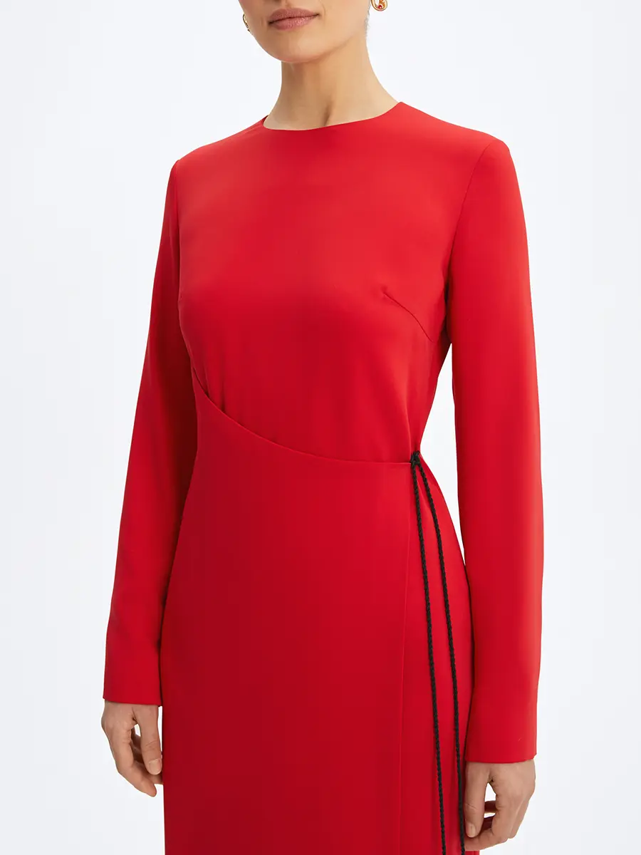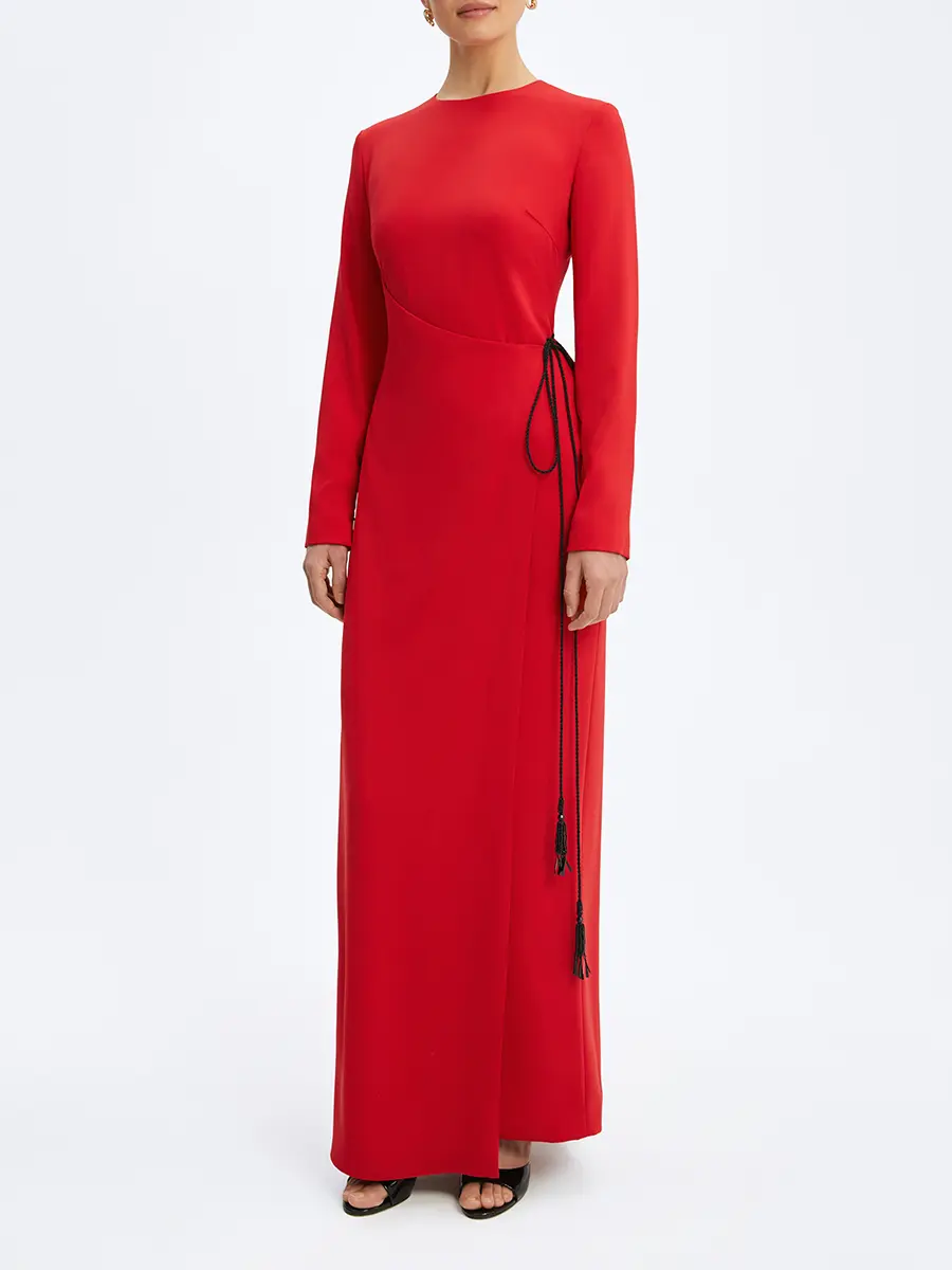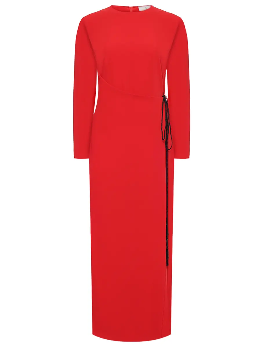 -Платье в роскошном красном цвете из высококачественной итальянской ткани от OLOLOL. -Модель свободного силуэта с длинными рукавами, круглой горловиной и завязками на талии выполнена на подкладе из шелка. -Ткань мало мнется, имеет высокую прочность и износостойкость благодаря чему изделие долго будет частью ваших образов. -По переду и спинке акцентная деталь в виде разреза. -Платье станет отличным выбором для вечерних выходов и мероприятий, предлагаем стилизовать аксессуарами из желтого металла.