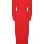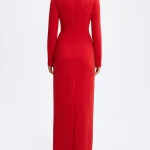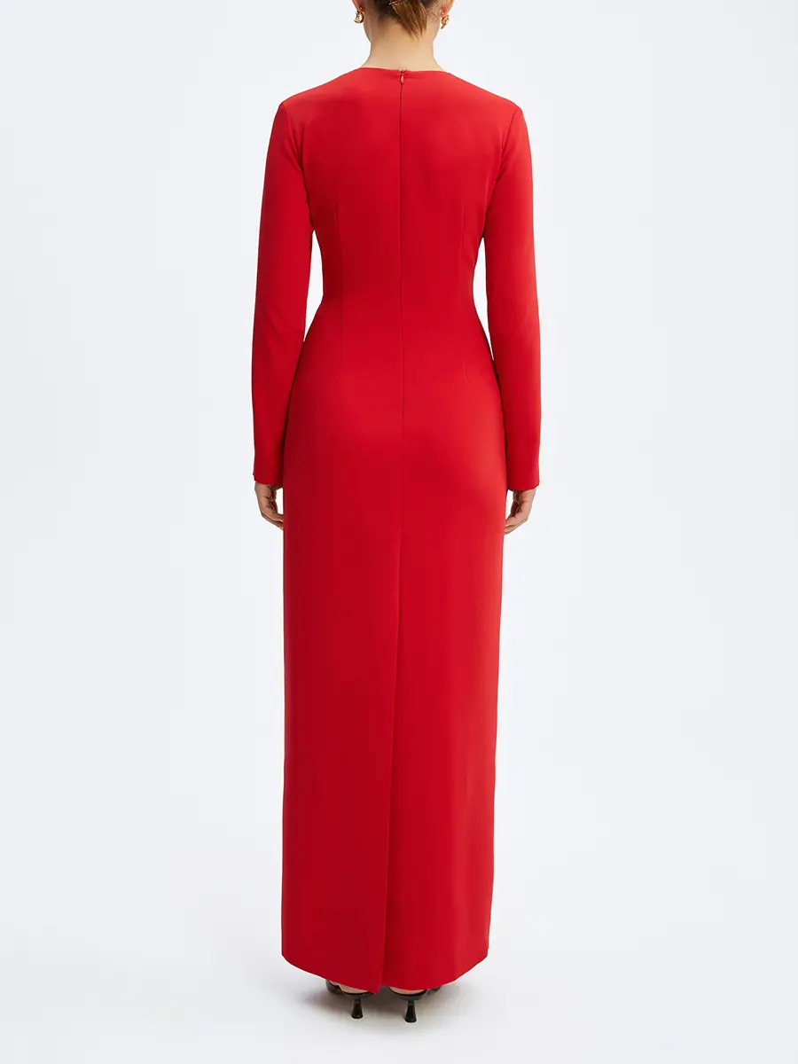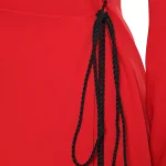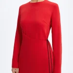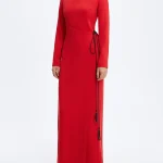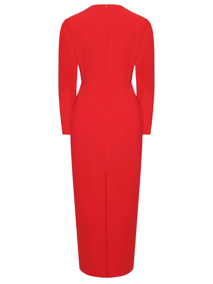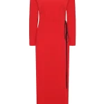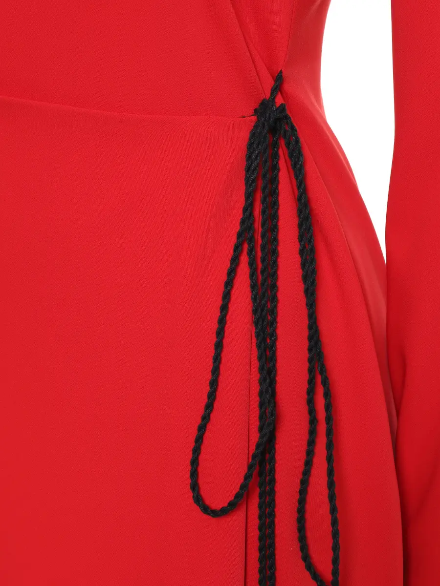 -Платье в роскошном красном цвете из высококачественной итальянской ткани от OLOLOL. -Модель свободного силуэта с длинными рукавами, круглой горловиной и завязками на талии выполнена на подкладе из шелка. -Ткань мало мнется, имеет высокую прочность и износостойкость благодаря чему изделие долго будет частью ваших образов. -По переду и спинке акцентная деталь в виде разреза. -Платье станет отличным выбором для вечерних выходов и мероприятий, предлагаем стилизовать аксессуарами из желтого металла.