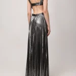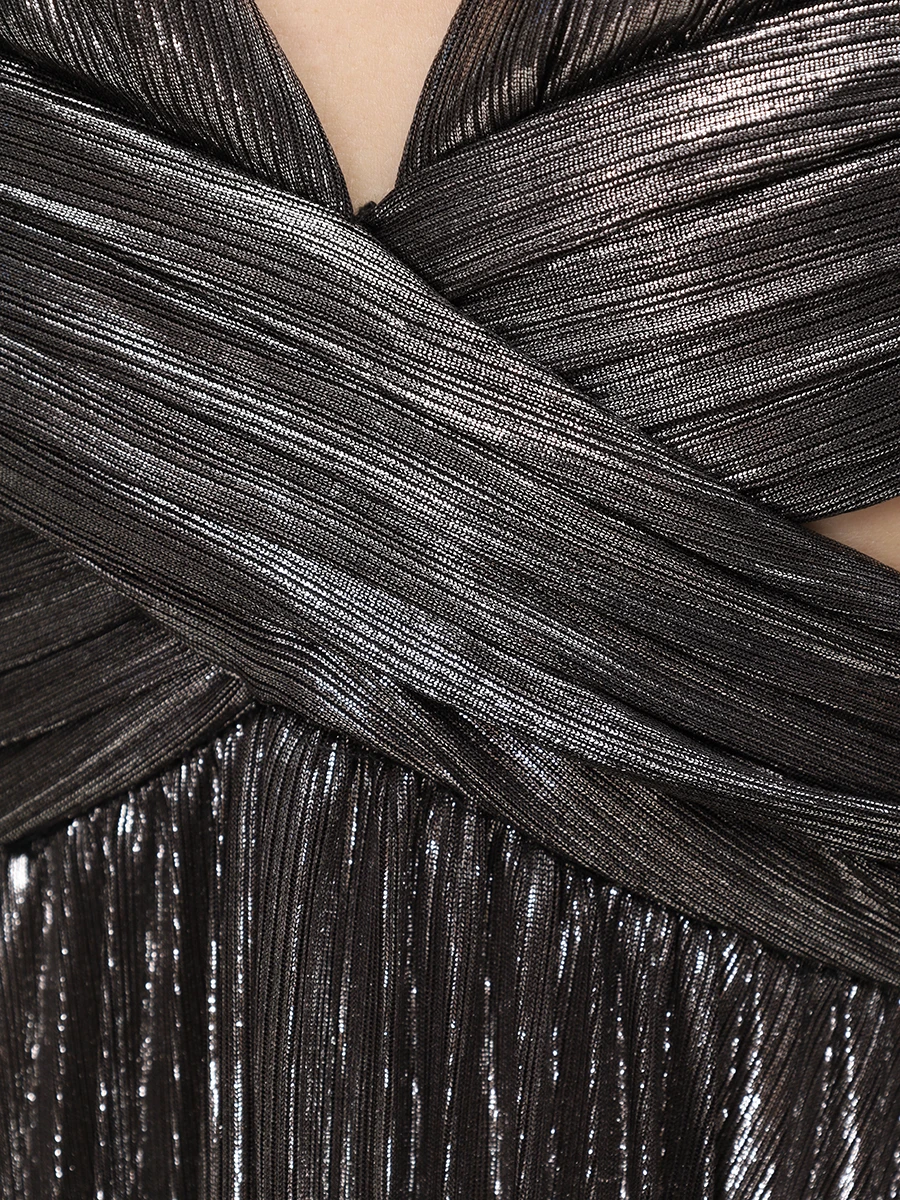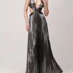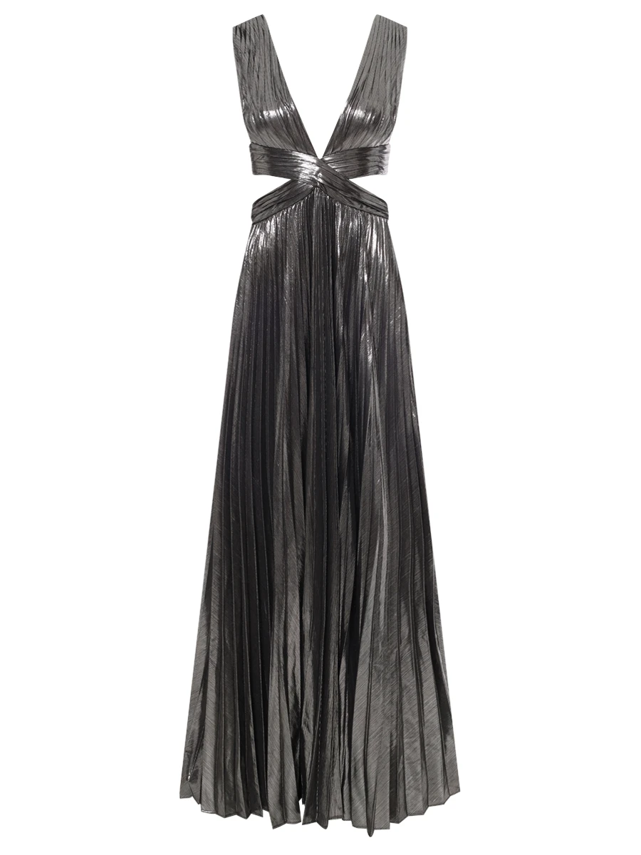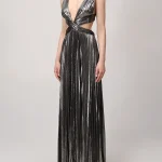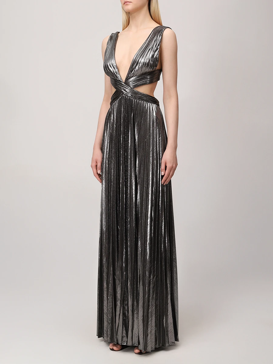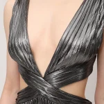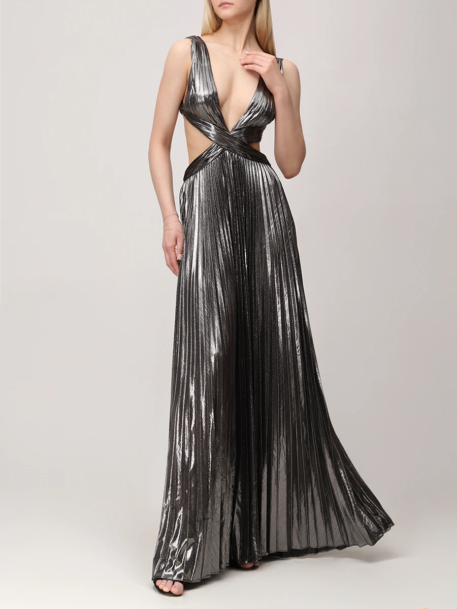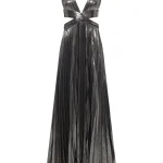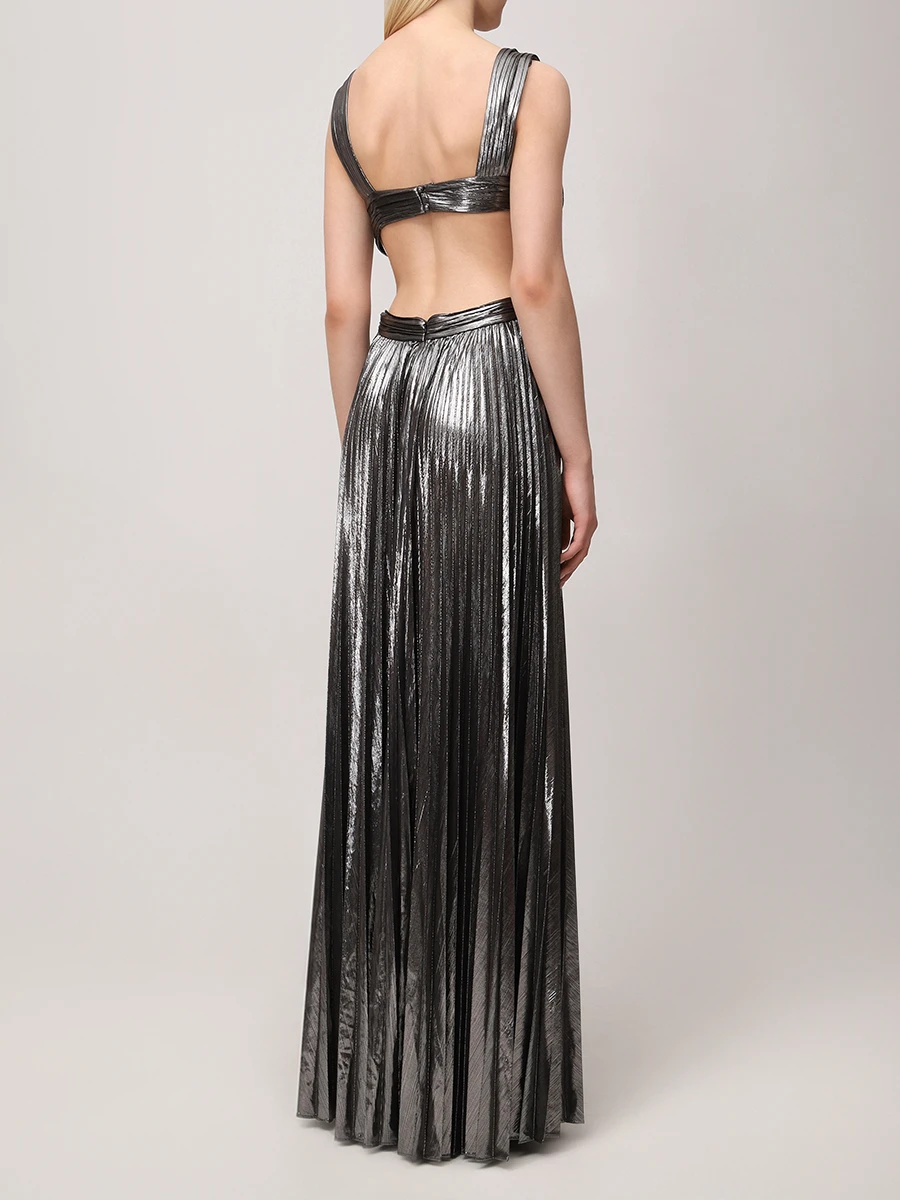 -Серебристое эффектное платье-макси из роскошной ткани с эффектом ламе от RETROFETE. -Модель с глубоким вырезом, замысловатыми деталями и застежкой на спинке. -Это платье, идеально подходящее для особых случаев, излучает элегантность и изысканность. -Добавьте в свой гардероб это эксклюзивное изделие и будьте в центре внимания, куда бы вы ни пошли.