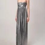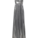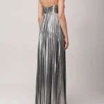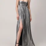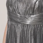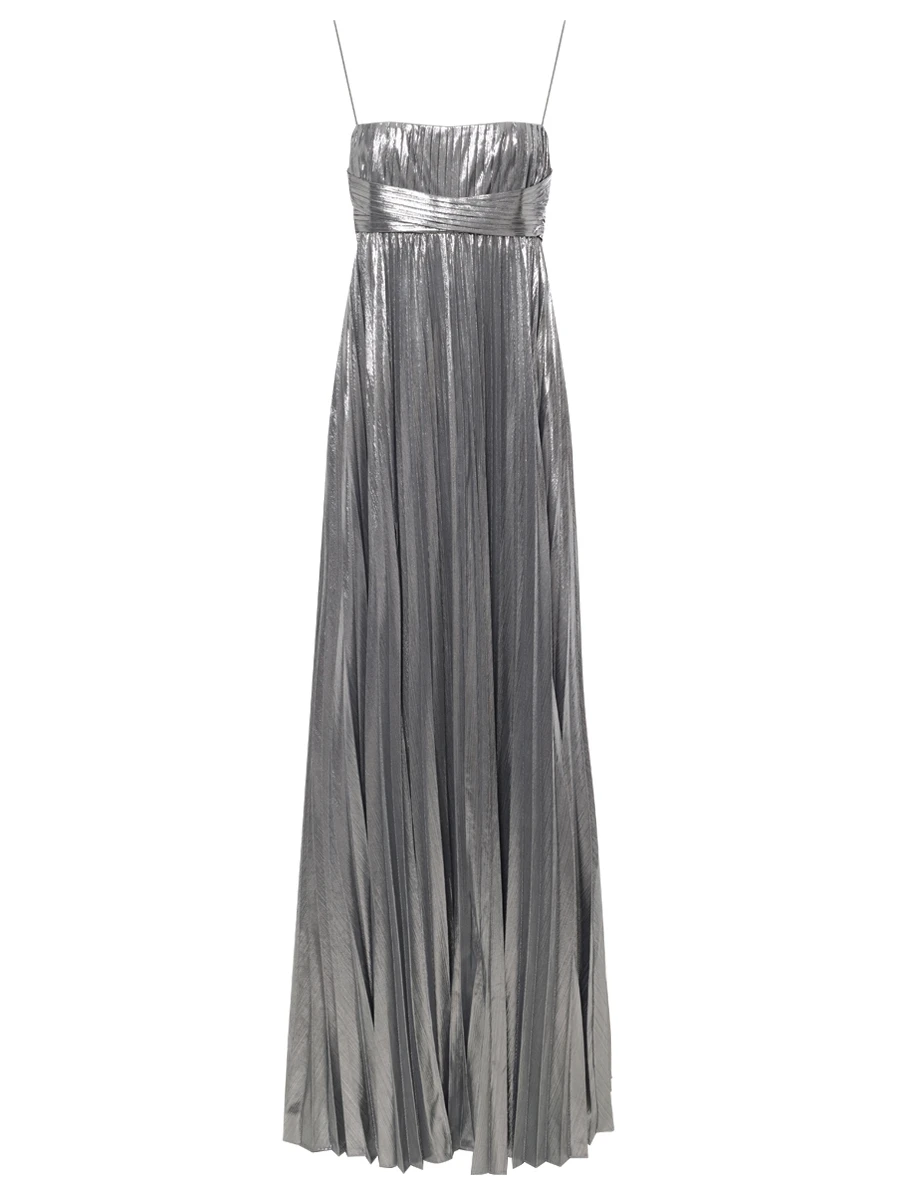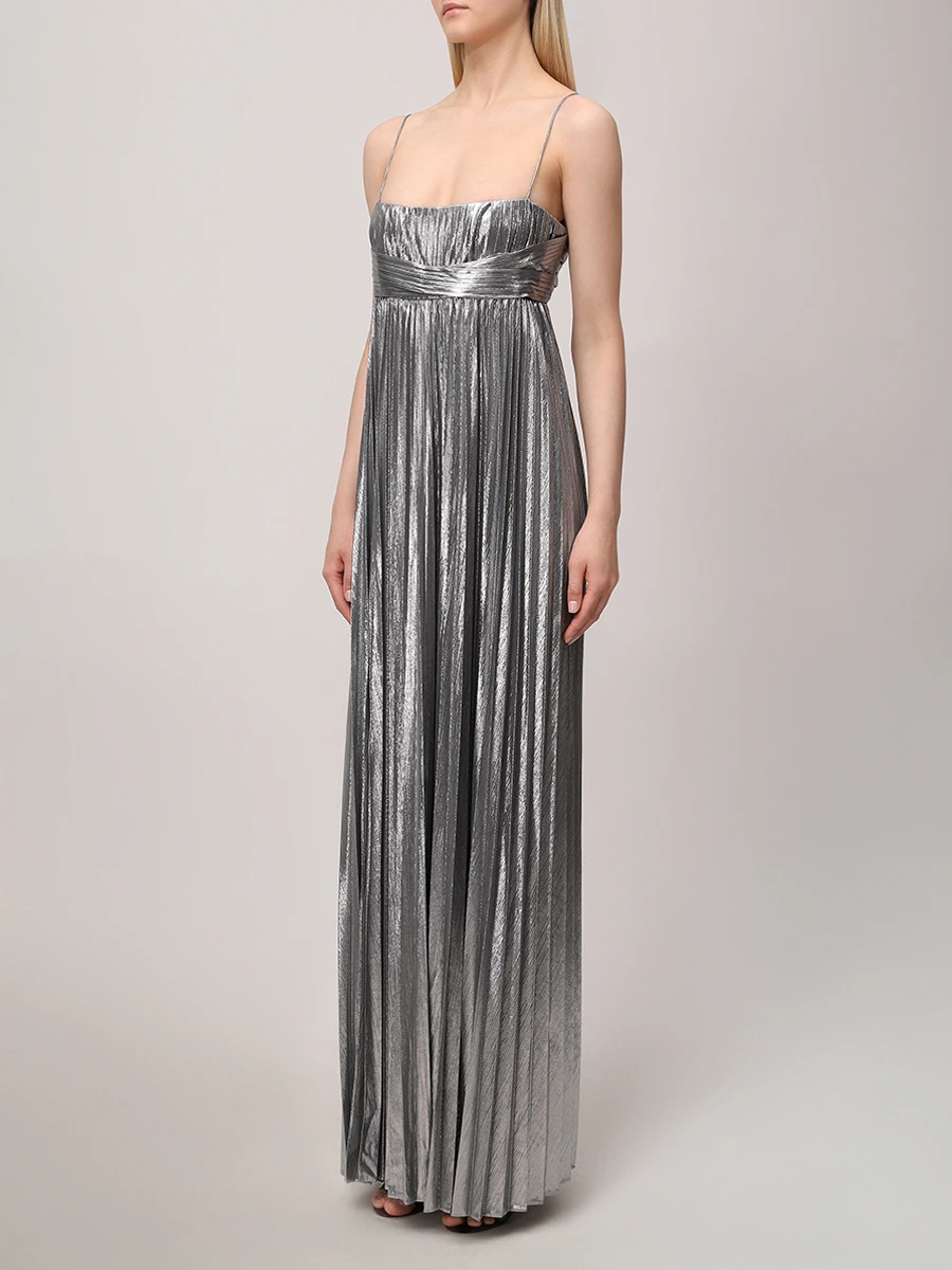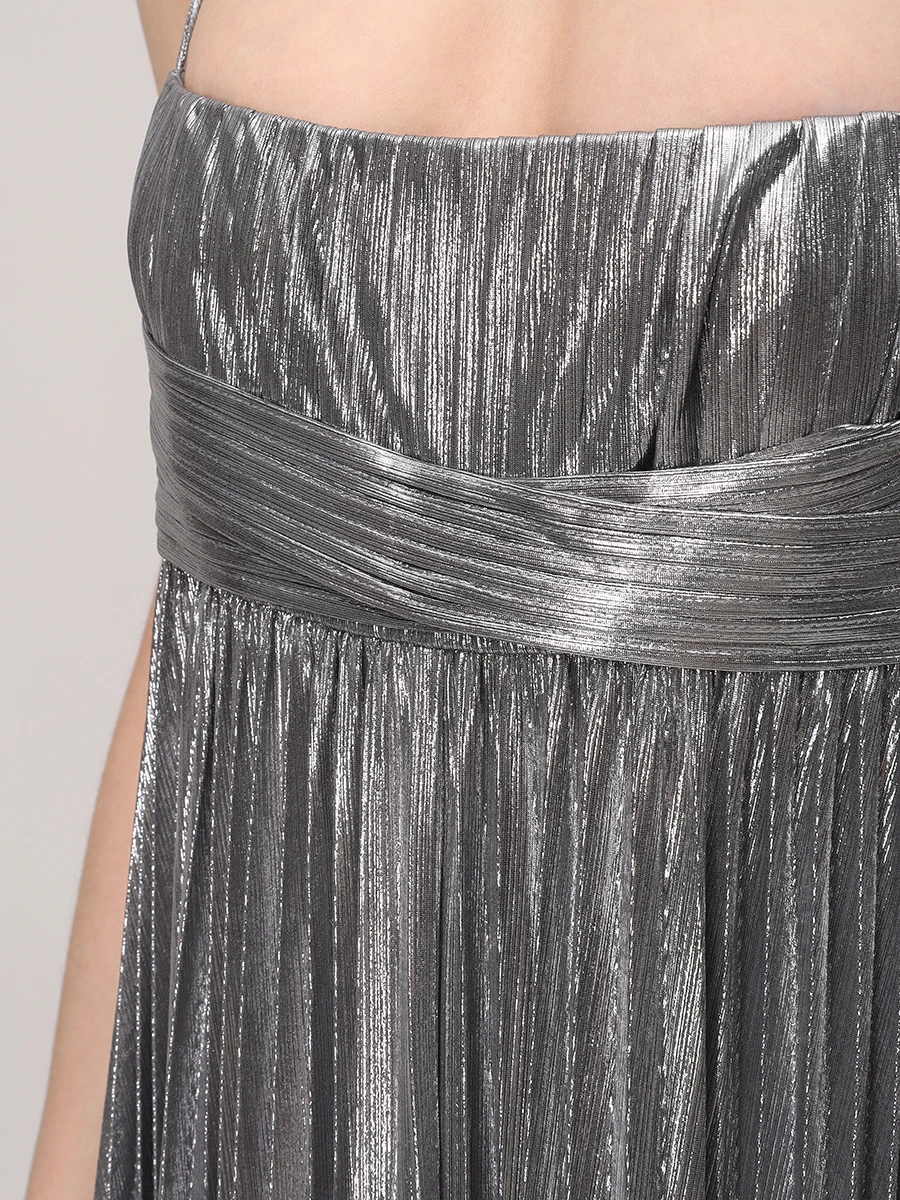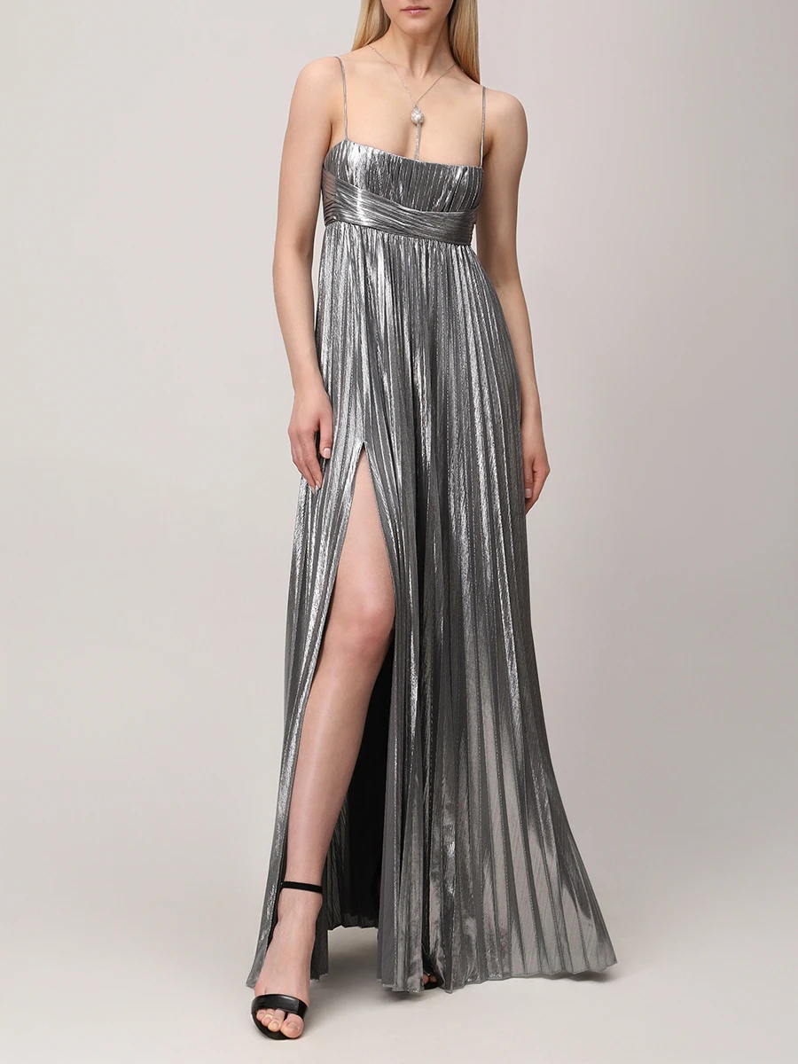 -Серебристое платье-макси из роскошной ткани с эффектом ламе от RETROFETE. -Модель с завышенной талией, юбкой А-силуэта в пол, узкими бретелями на плечах. -Вау-эффект создаёт высокий разрез, который добавляет образу сексуальности. -Благодаря универсальному дизайну платье также можно носить без бретелек.