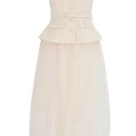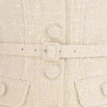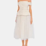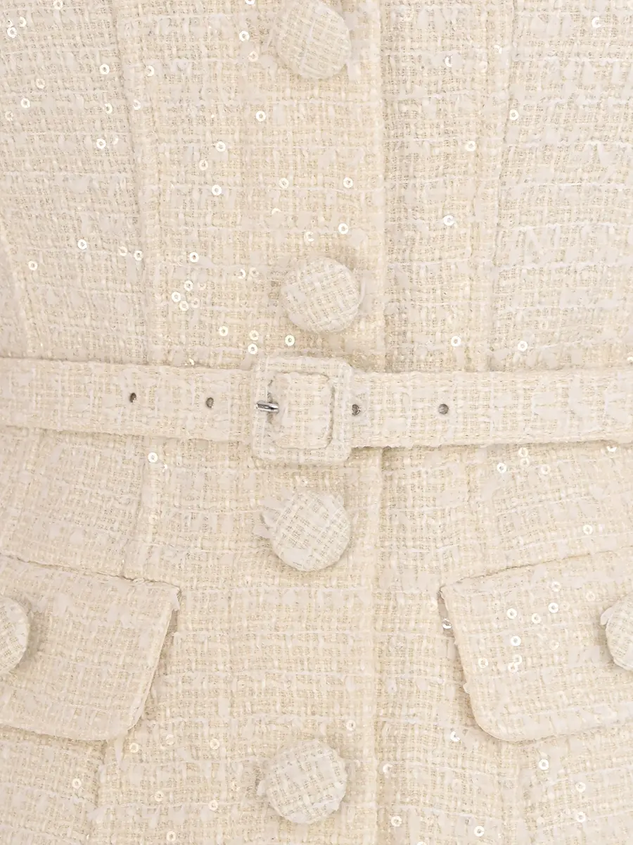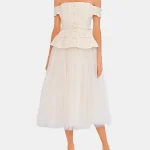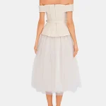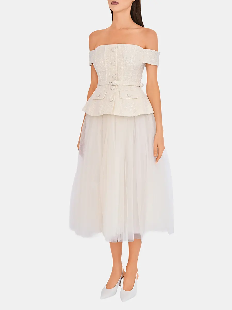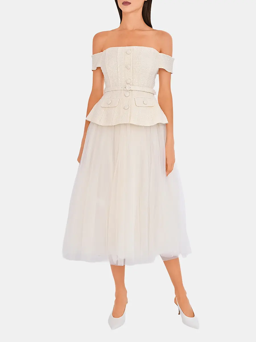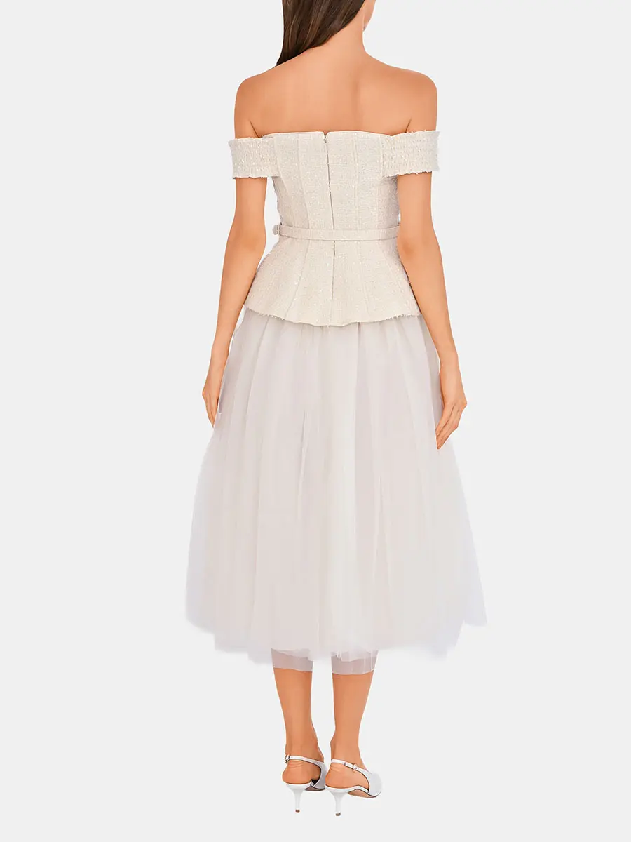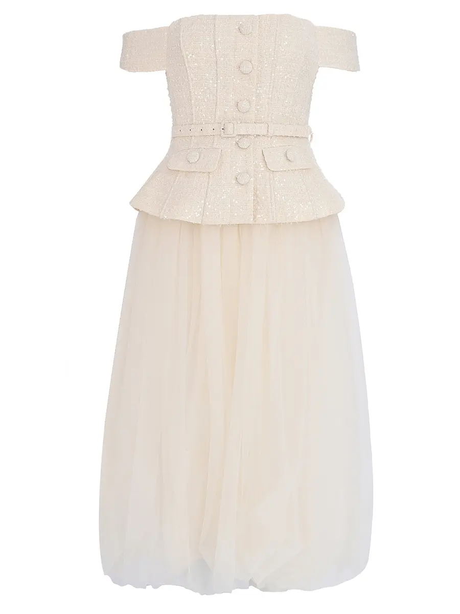 -Платье с пайетками купажированного состава в молочном цвете от SELF-PORTRAIT. -Модель приталенного кроя с баской, расклешенной пышной юбкой, открытыми плечами и спинкой, клапанами, застежкой на потайную молнию. -Подчеркнуть талию и структурировать силуэт поможет пояс в тон.