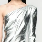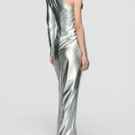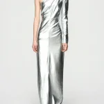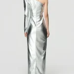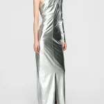 -Серебристое платье-макси от BERHASM. -Модель с кроем на одно плечо и разрезом спереди для комфортного шага. -Платье Silver Boss Lady Dress сияет благодаря металлическому блеску и строгой структуре. -Облегающий силуэт обеспечивает элегантность, идеально для торжественных вечеров. Ширина плеч 7,8 см Обхват груди 39,5 см Обхват талии 30,5 см Обхват подола 40 см Длина рукава 63,4 см Обхват рукава у запястья 9,25 см Длина изделия 163,5 см