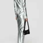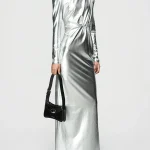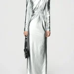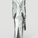 -Серебристое платье-макси от BERHASM. -Модель приталенного кроя с длинными рукавами, четко очерченными плечами, мягкой драпировкой на талии и разрезом сзади для комфортного шага. -Платье Silver Sparkling Dress поражает своим блеском и плавным дизайном. -Приталенная талия и драматичный подол создают захватывающий образ, идеально подходящий для торжеств. Ширина плеч 41,5 см Обхват груди 37 см Обхват талии 30,5 см Обхват подола 41 см Длина рукава 64,7 см Обхват рукава у запястья 8,75 см Длина изделия 162 см