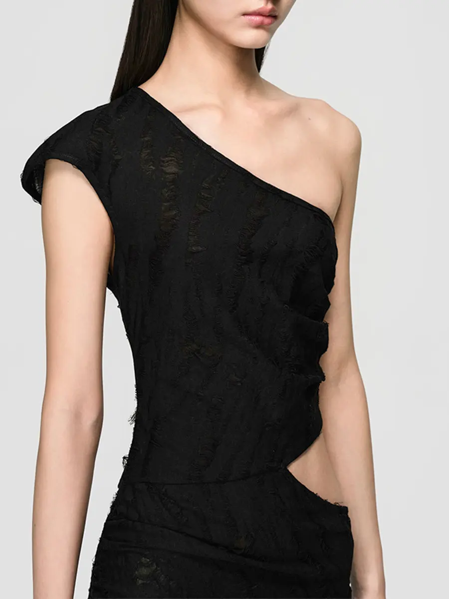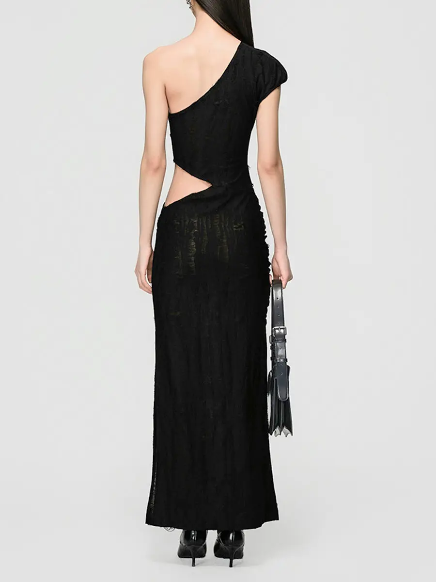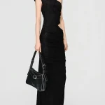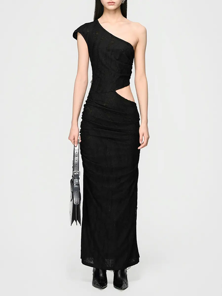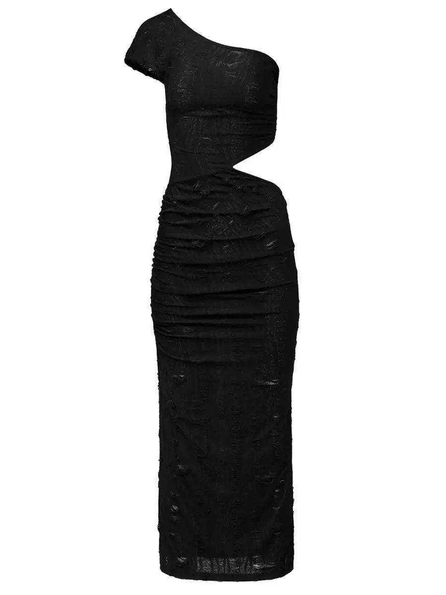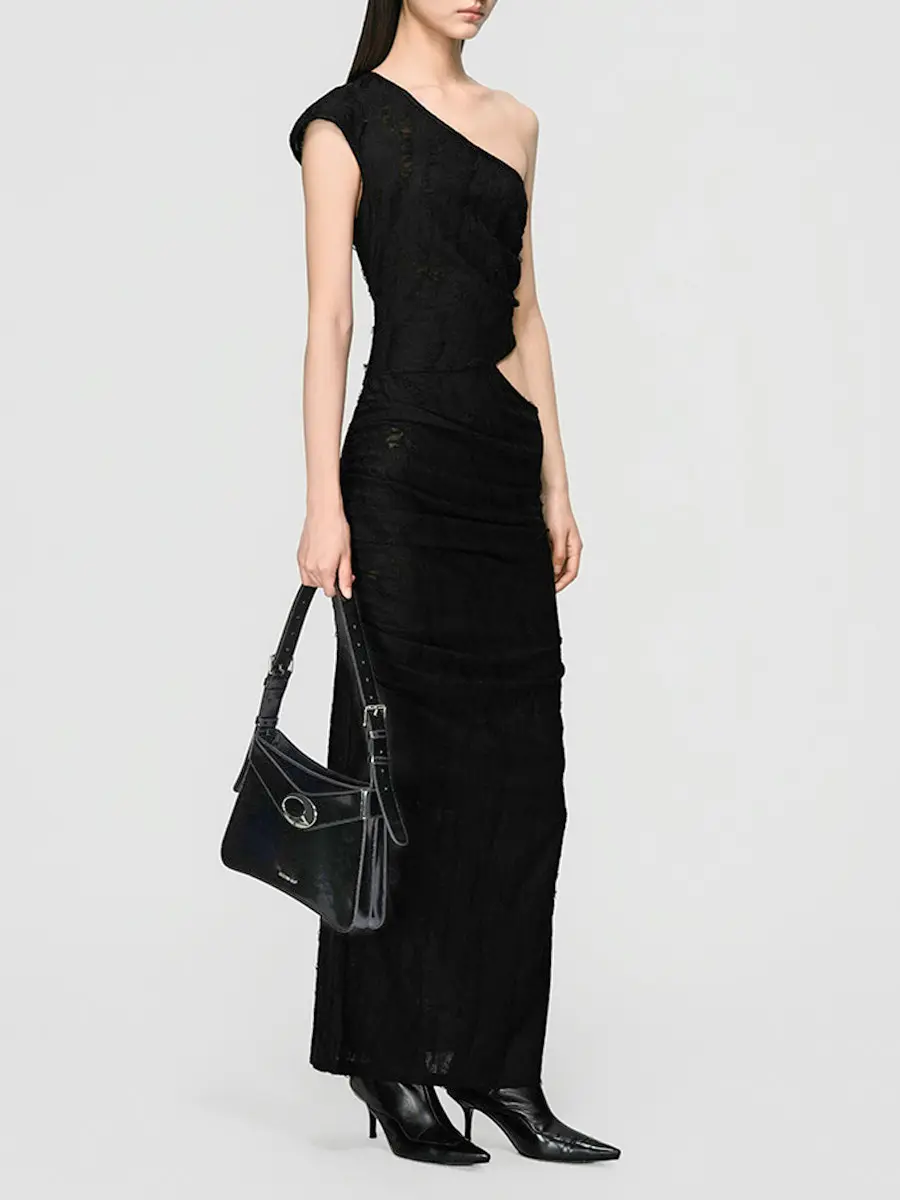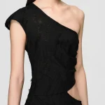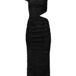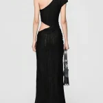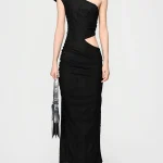 -Черное платье-макси купажированного состава от BERHASM. -Модель облегающего кроя на одно плечо и фигурным вырезом на боку. -Платье Sisters Coven воплощает элегантность благодаря мягко струящейся ткани и приталенному силуэту. -Дизайн подчеркивает фигуру, создавая образ, который одновременно привлекателен и силен. Обхват груди 18,6 см Обхват талии 35 см Обхват подола 30 см Обхват бёдер 43 см Длина юбки 143 см