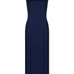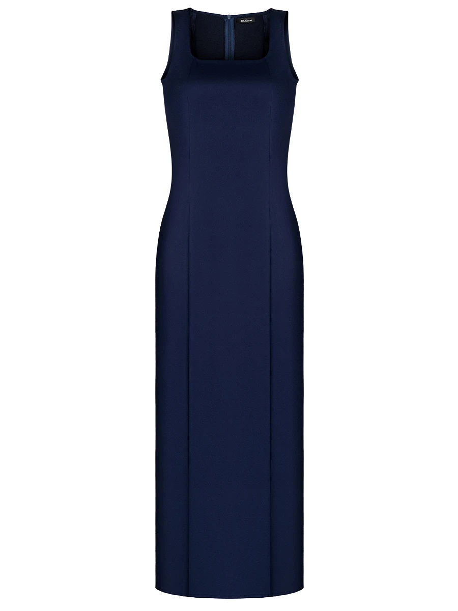 -Темно-синее платье-макси от ST. ERME. -Модель с акцентом кроя на талии и бедрах, прямым подолом, вырезом-каре на груди, застежкой на потайную молнию и высокой шлицей для комфортного шага.