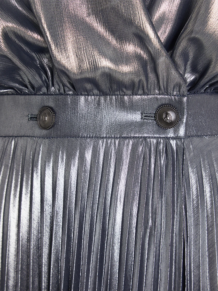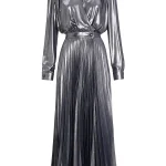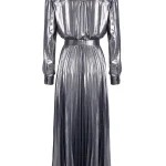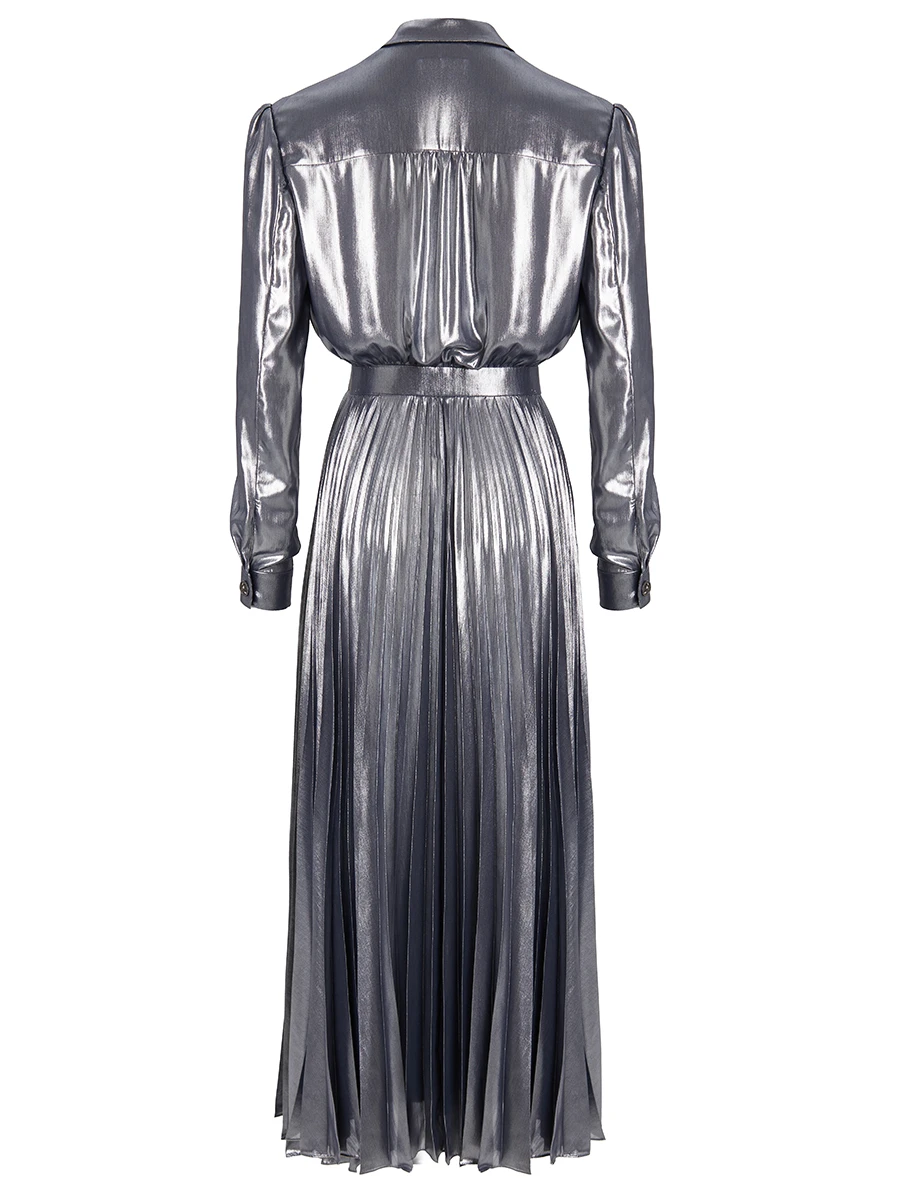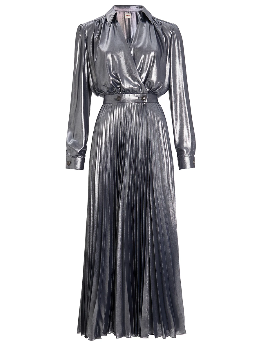 -Серебристое платье-макси от TAMI GEE. -Модель с акцентом кроя на талии, длинными рукавами с манжетами, отложным воротником, V-образным вырезом на груди и расклешенной к низу плиссированной юбкой. -Дополните образ обувью на высоком каблуке, сдержанной бижутерией и миниатюрной сумкой на плечо.