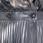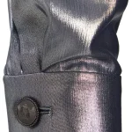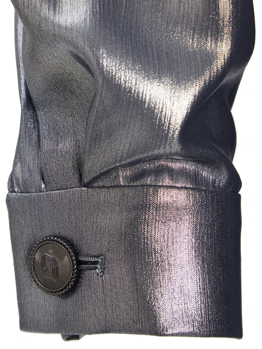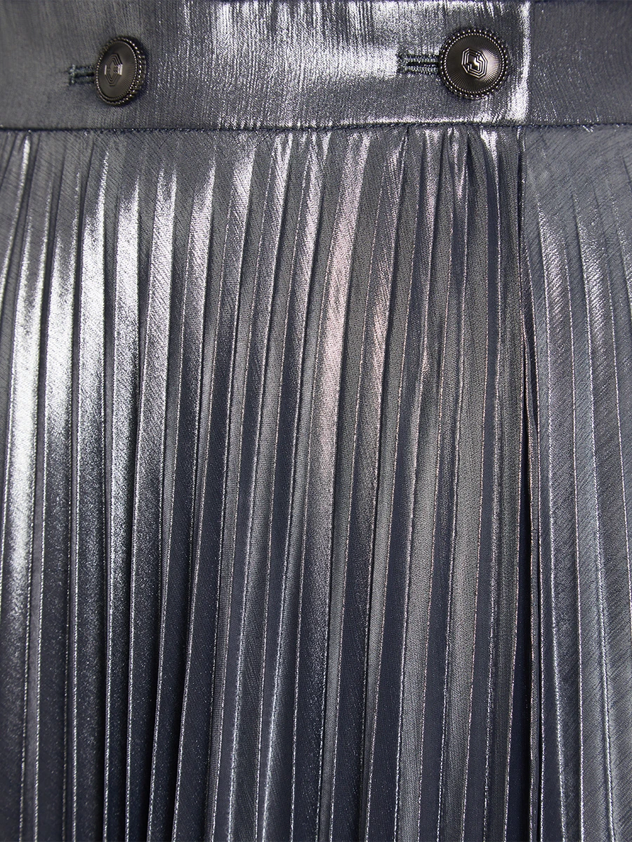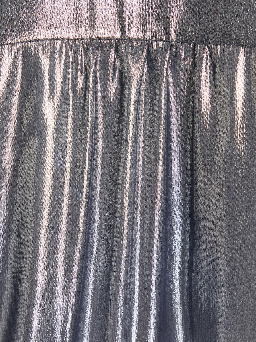 -Серебристое платье-макси от TAMI GEE. -Модель с акцентом кроя на талии, длинными рукавами с манжетами, отложным воротником, V-образным вырезом на груди и расклешенной к низу плиссированной юбкой. -Дополните образ обувью на высоком каблуке, сдержанной бижутерией и миниатюрной сумкой на плечо.