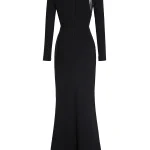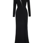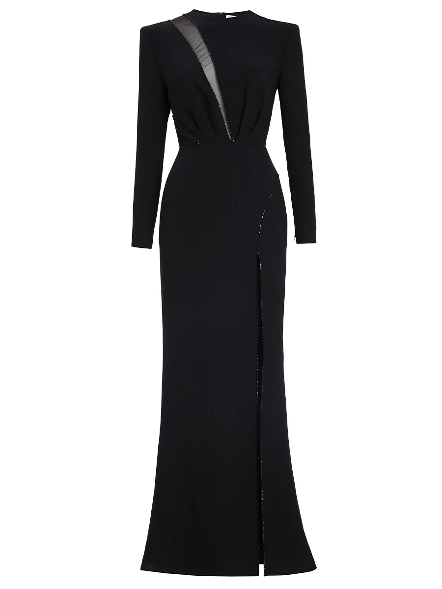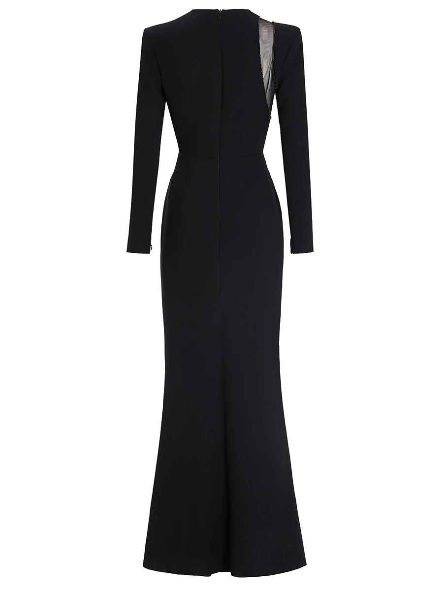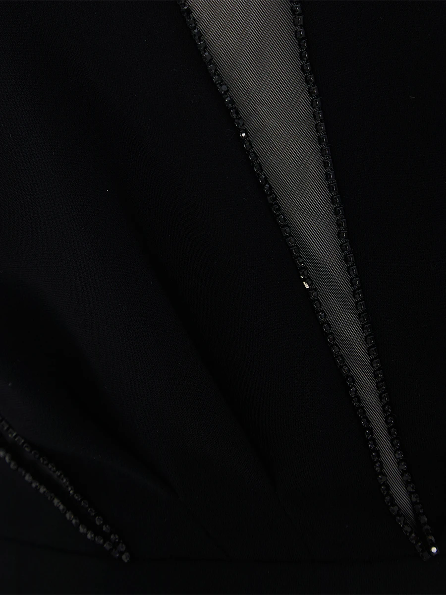 -Черное платье от TAMI GEE. -Лаконичный приталенный силуэт, длинные рукава, круглый вырез горловины и застежка на потайную молнию на спинке. -Изящная сетчатая вставка добавляет нотку романтики и загадочности, создавая эффектный контраст с плотной текстурой основного материала.