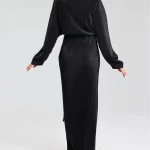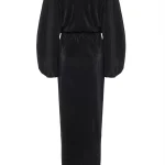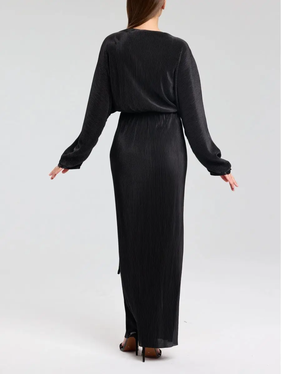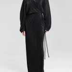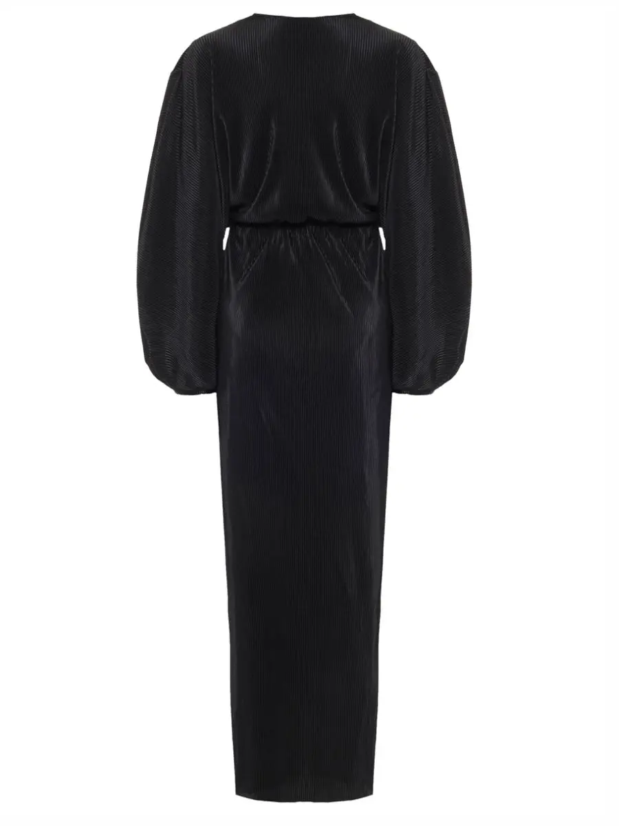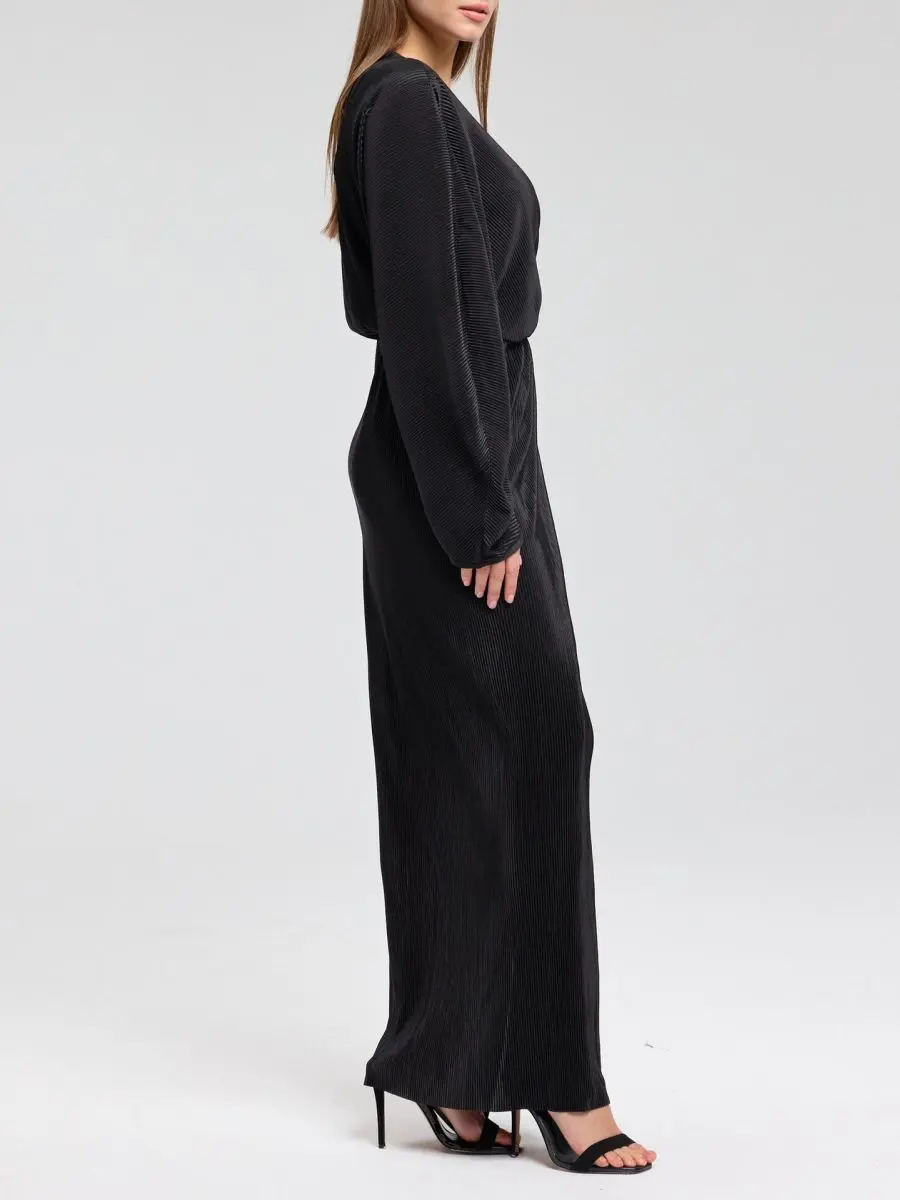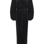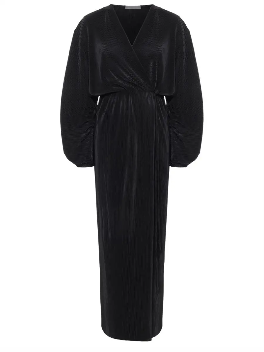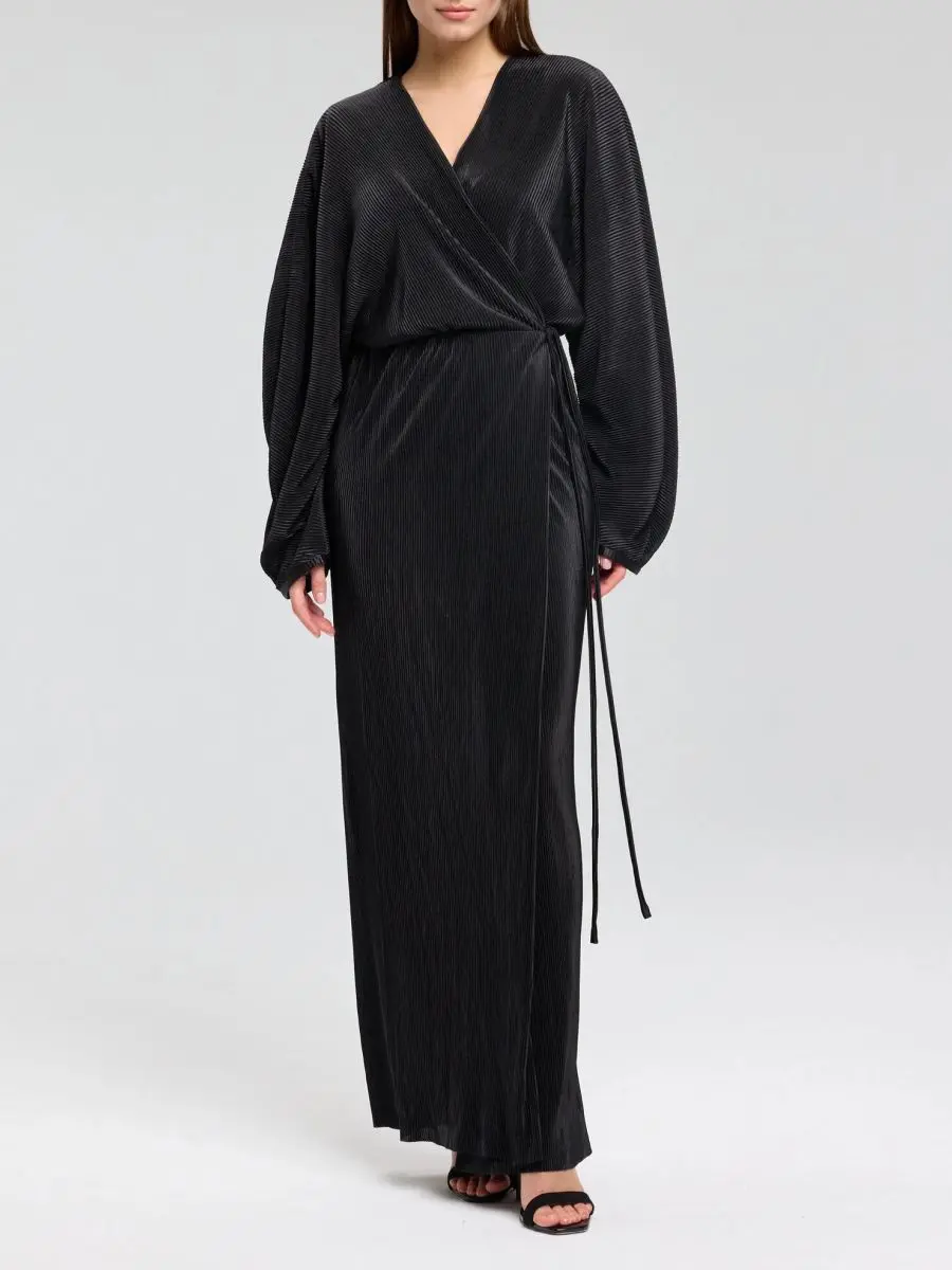 -Черное платье-макси из ткани с эффектом гофре от TOOMATCH. -Модель с кроем на запах, длинными рукавами-кимоно с драппировкой по низу, V-образным вырезом на груди. -Лаконичное платье, в котором нет ничего лишнего, уместно дополнит коктейльные или вечерние мероприятия. Размерная сетка: OS: длина рукава с плечом-85, ширина по талии-75, ширина по бедрам-96, ширина рукава по низу 1/2 измерения-23, длина изделия от плеч шва-150.
