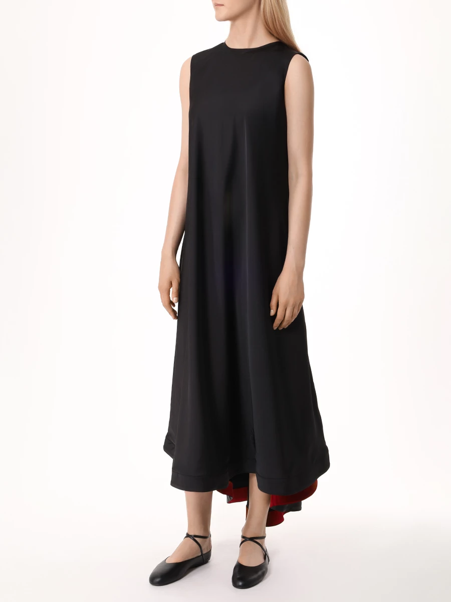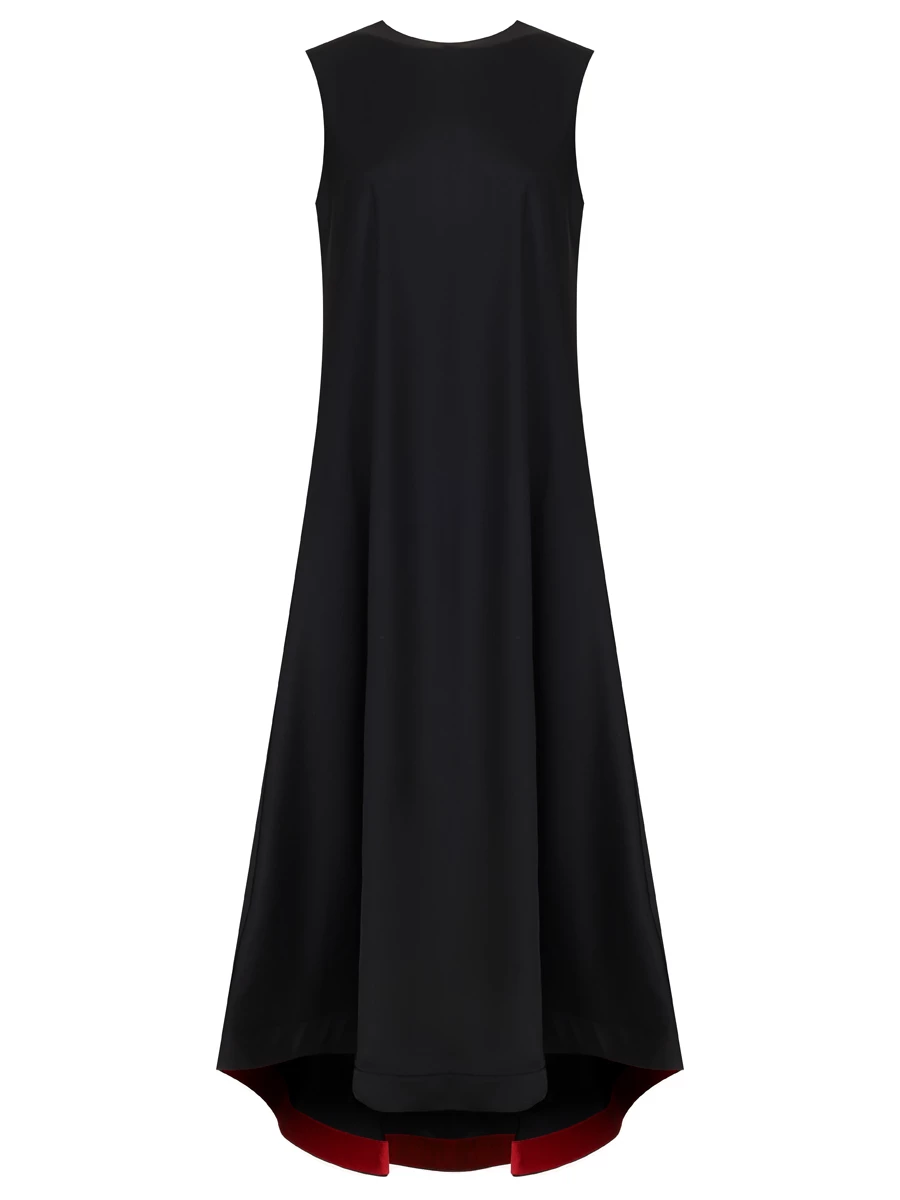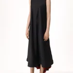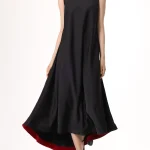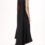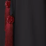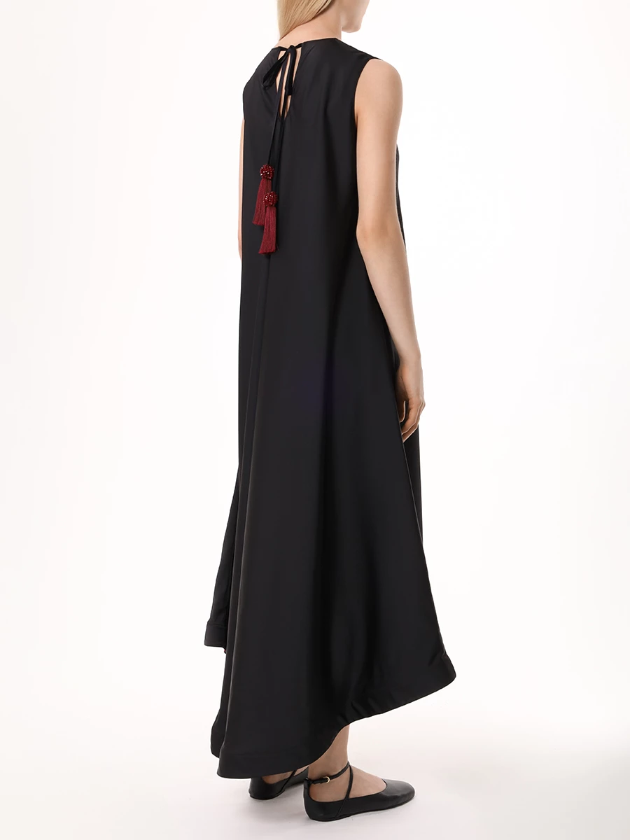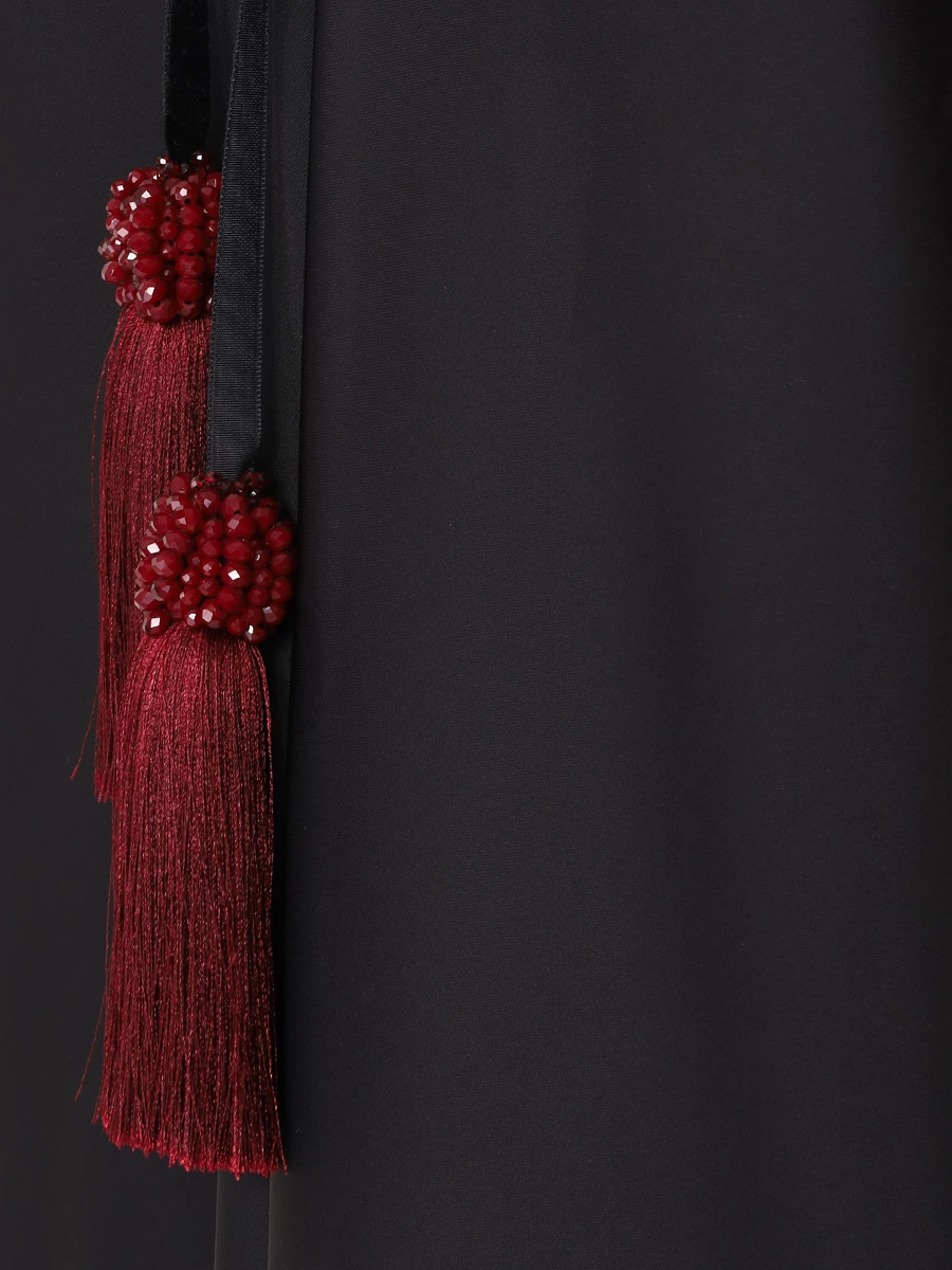 -Черное платье-миди от VARDOUI NAZARIAN. -Модель свободного асимметричного по длине кроя с легким клешем к низу и круглым вырезом горловины. -В своих коллекциях особое внимание дизайнер уделяет деталям: платье дополнено завязками сзади с бордовыми густыми кистями и гранеными бусинами, которым вторит бархатная обтачка по низу подола.