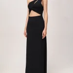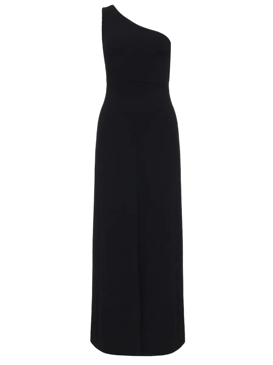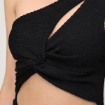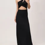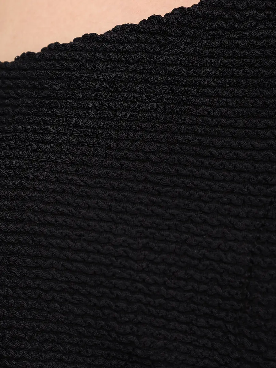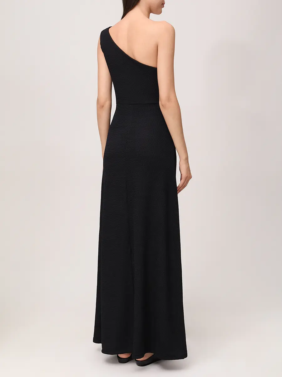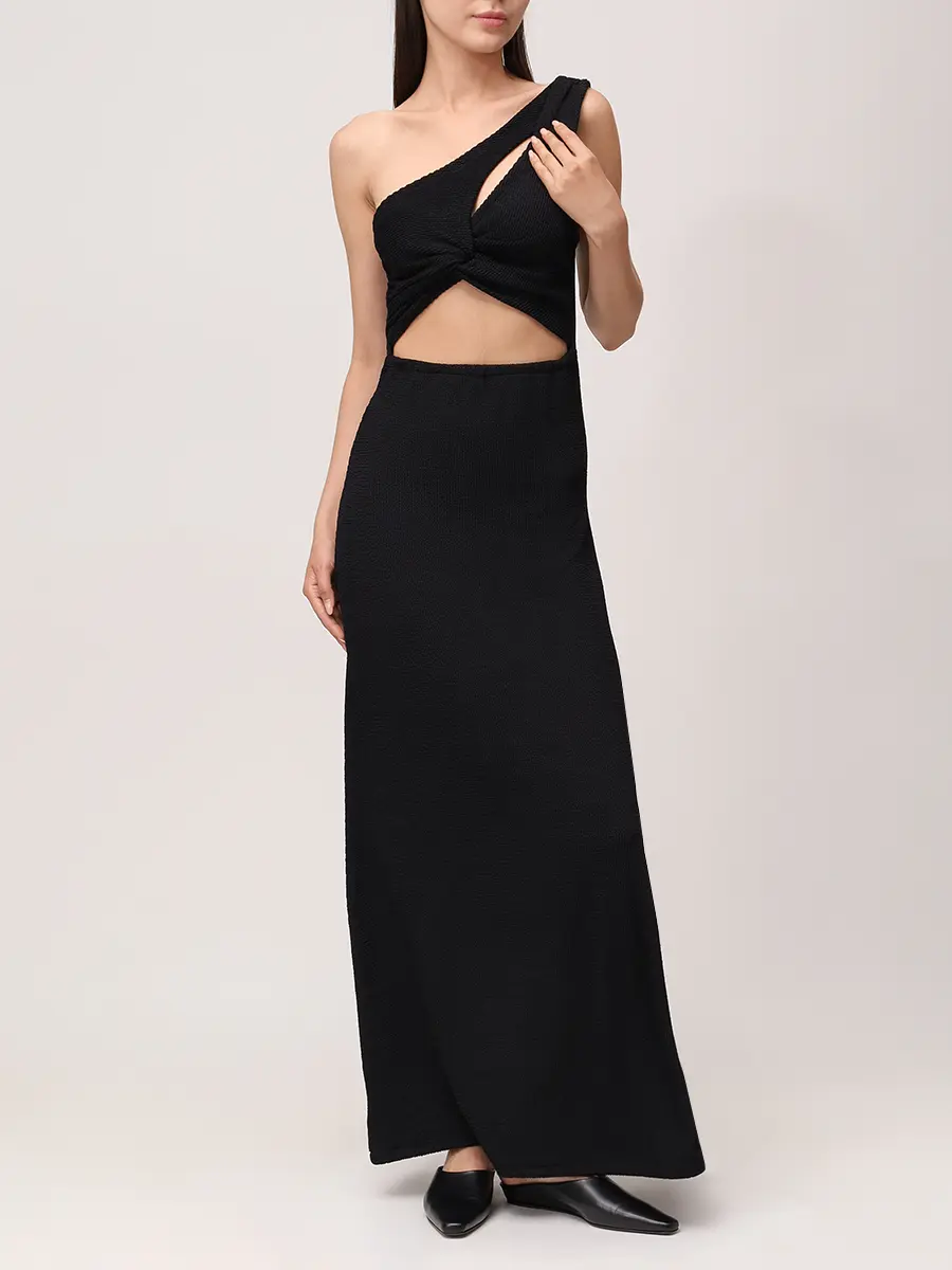 -Черное платье из рельефной ткани от VARDOUI NAZARIAN. -Модель асимметричного кроя на одно плечо с декоративным узлом на груди и эффектным вырезом, создающим акцент на талии. -Эффектное платье подчеркнет все достоинства фигуры и превратит каждый выход в незабываемое событие.