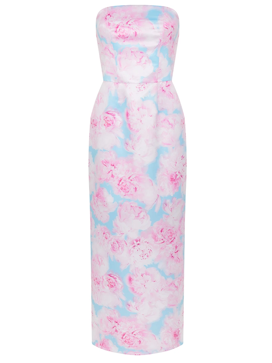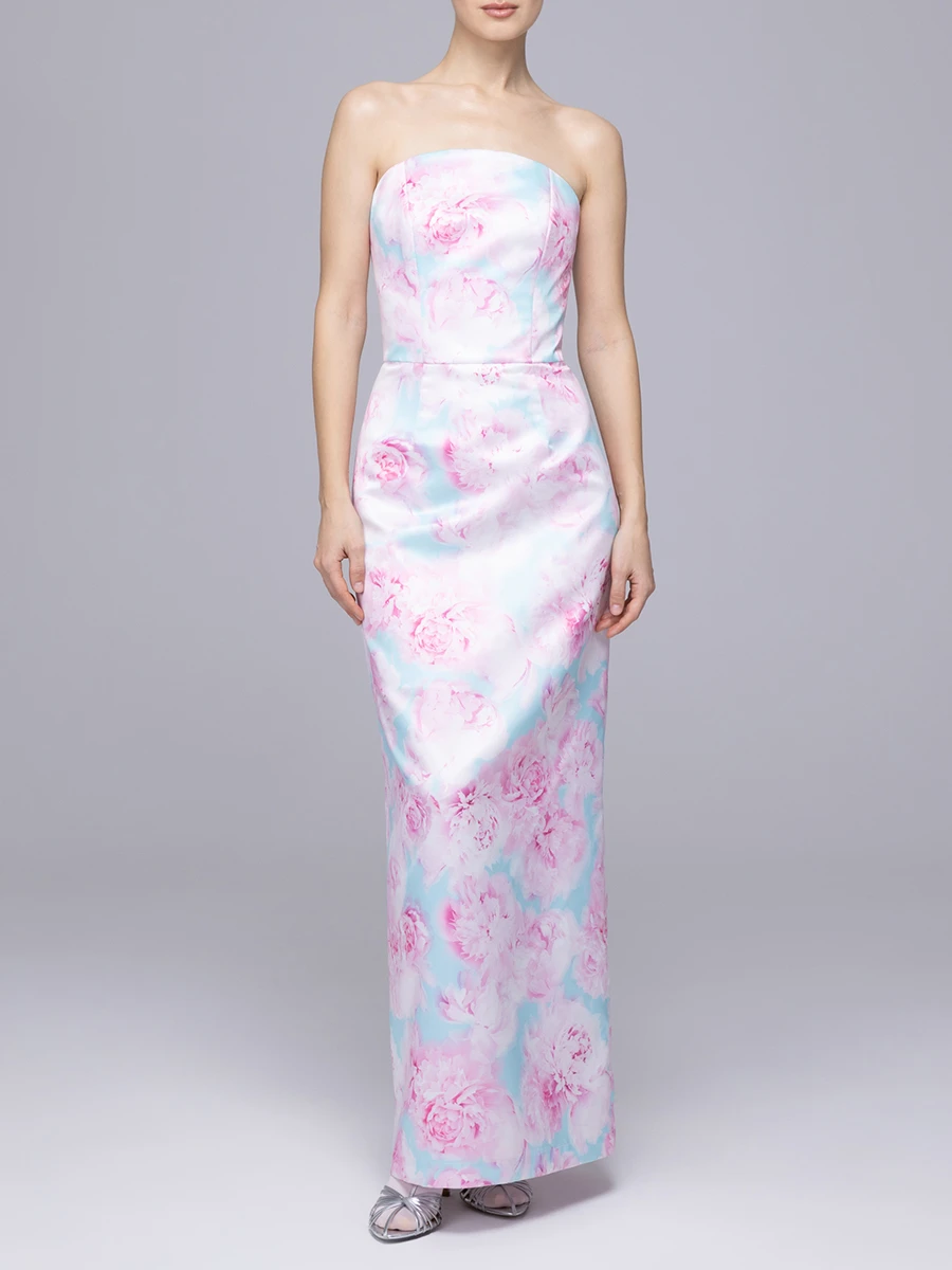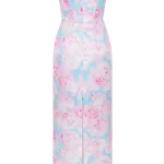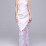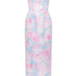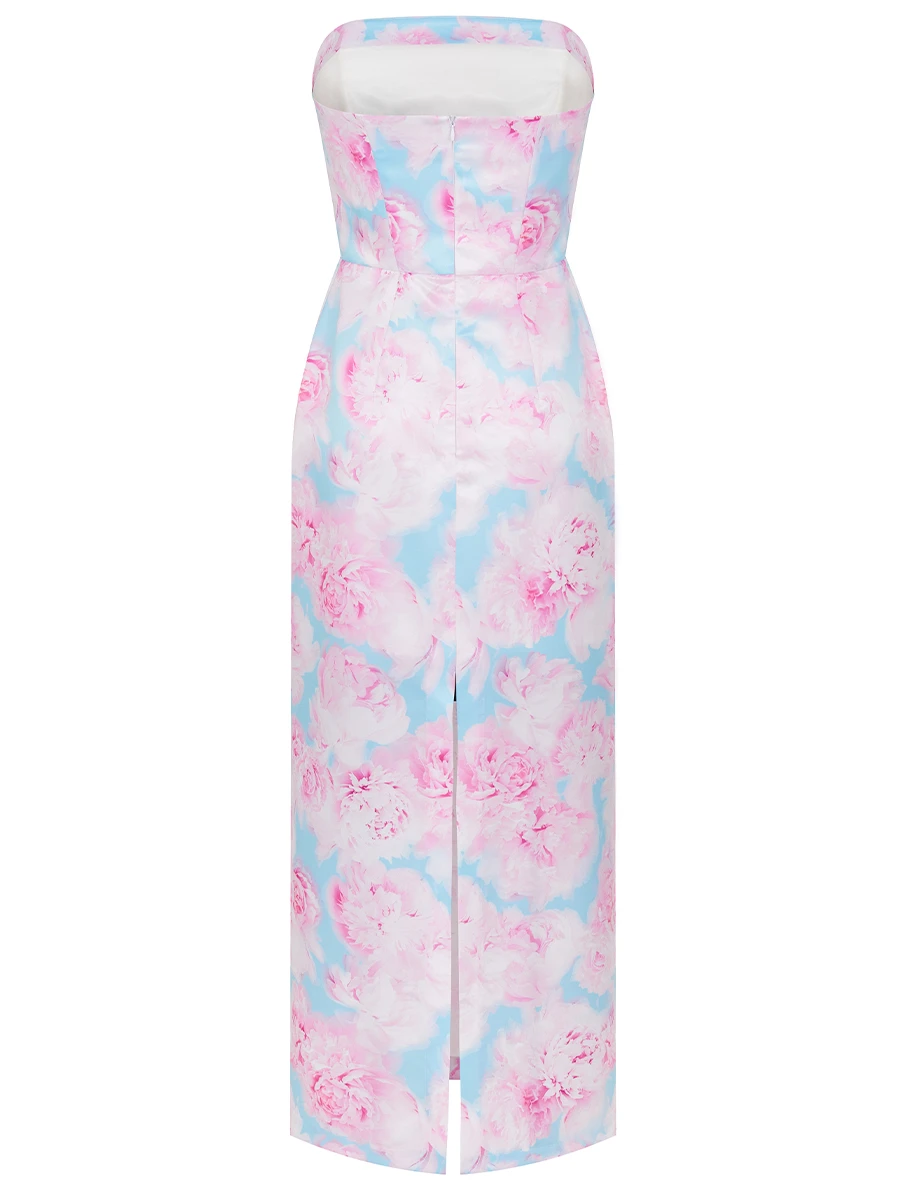 -Платье-статуэтка с цветочным принтом из плотного блестящего сатина от FASHION REBELS. -Модель приталенного кроя с открытыми плечами, облегченным корсетом, застежкой на потайную молнию и высоким разрезом сзади. -Специально для этой модели был разработан авторский принт с пионовидными розами, напоминающими стиль Марии-Антуанетты и французского двора.