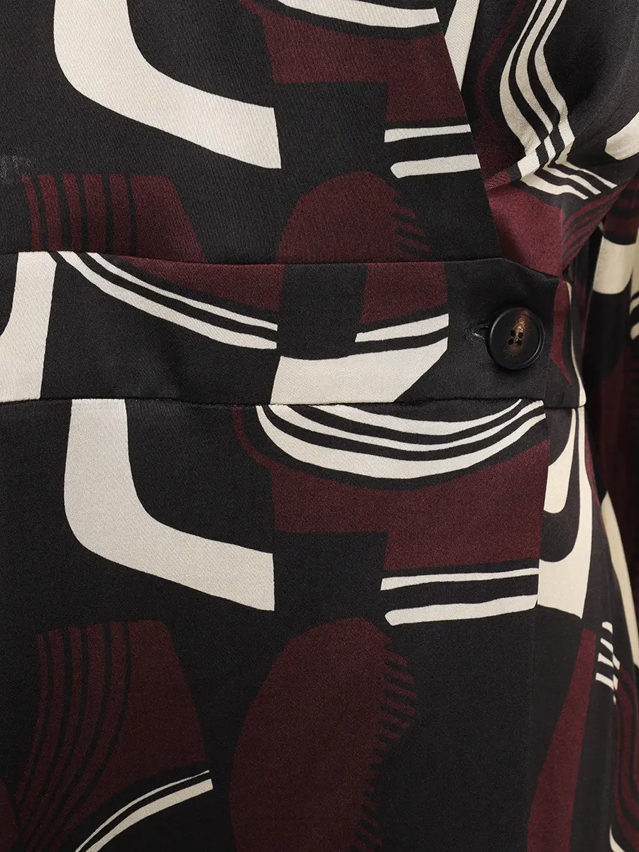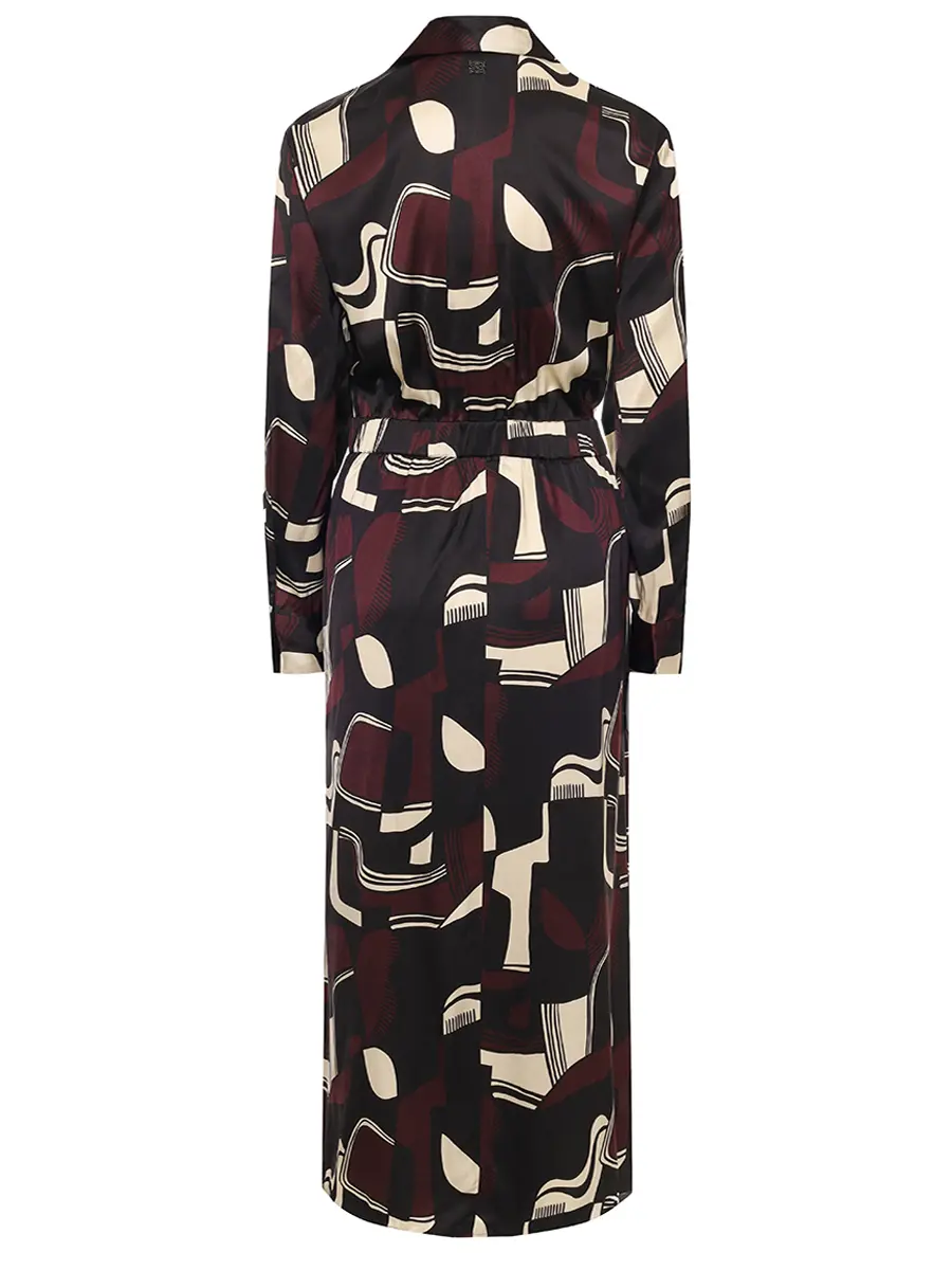 -Черное платье с принтом из вискозы от PANICALE. -Модель с акцентом кроя на талии, отложным воротником, длинными рукавами с манжетами и застежкой на пуговицу. -Платье выполнено из нежной вискозы, которая приятно ощущается на коже, позволяя ей дышать.