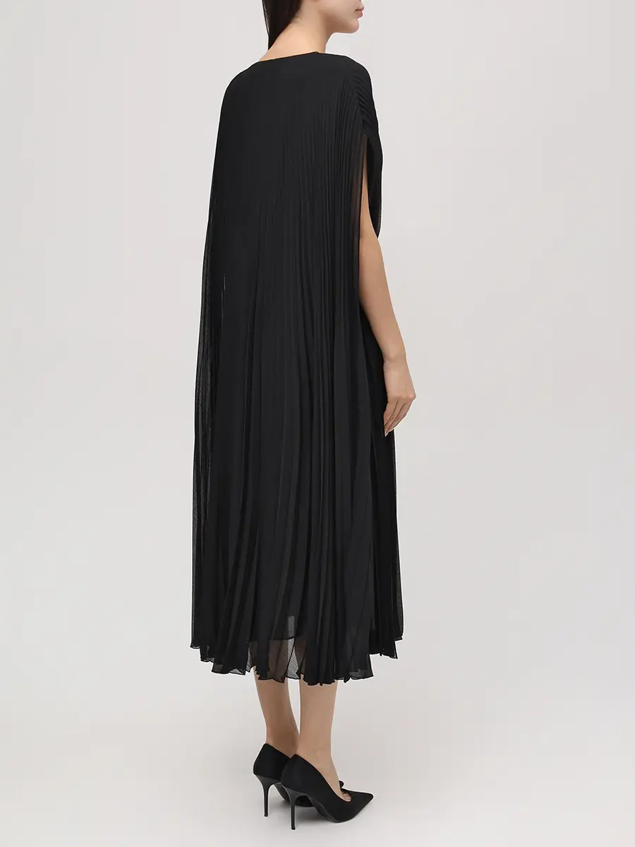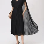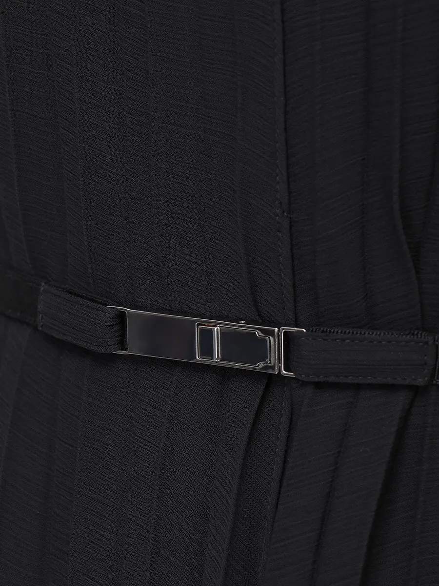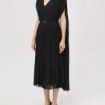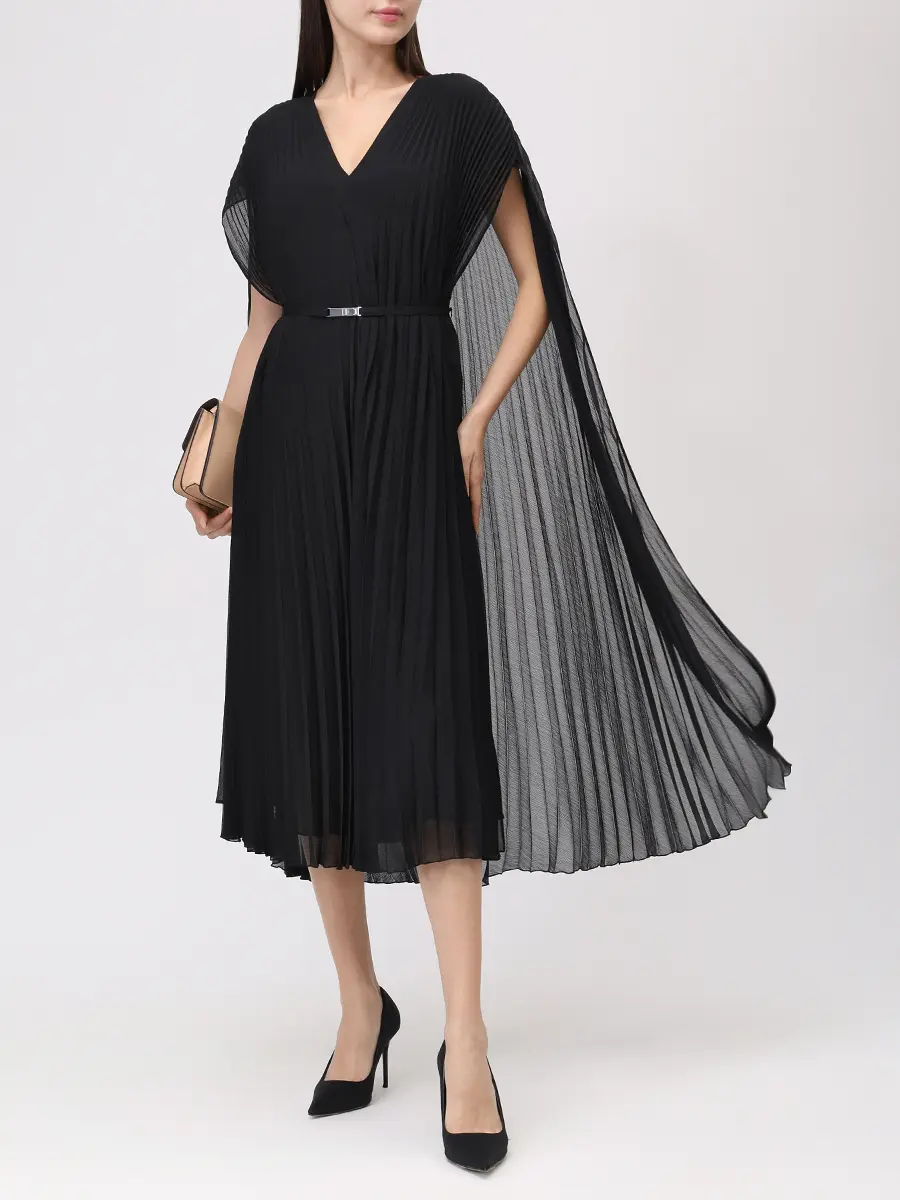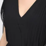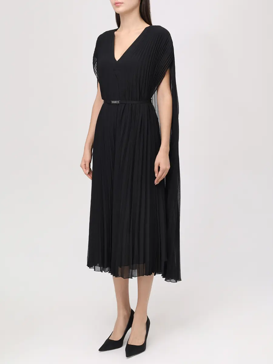 -Черное платье-плиссе в длине миди от BOSS BLACK. -Модель приталенного кроя с цельнокроенными короткими рукавами, V-образным вырезом на груди, акцентным узким поясом на талии, ниспадающим полотном сзади.
