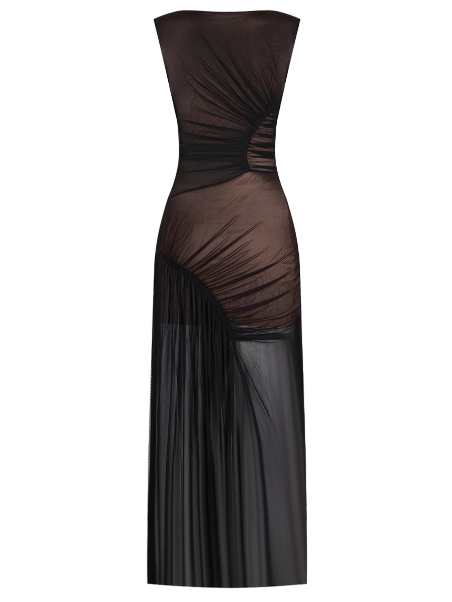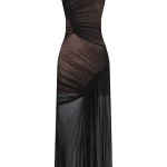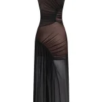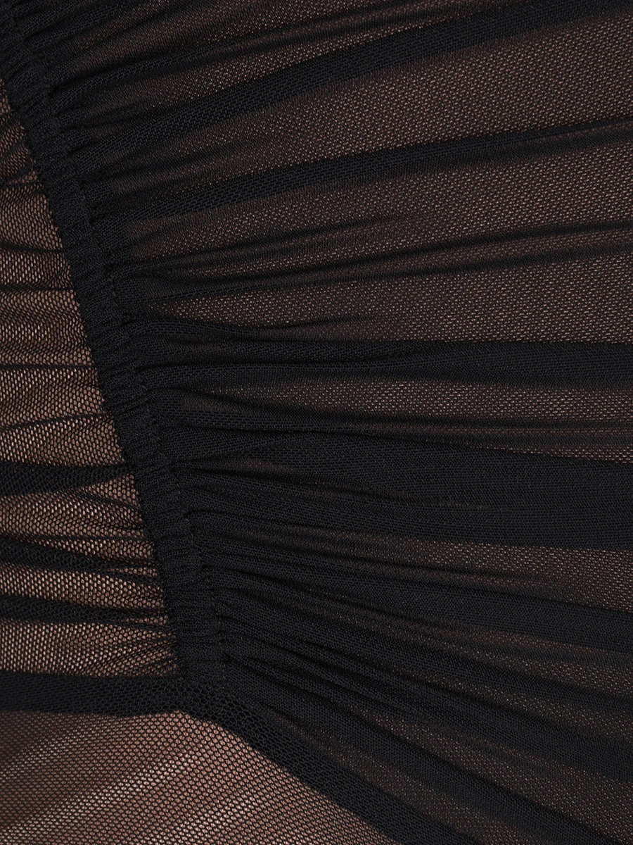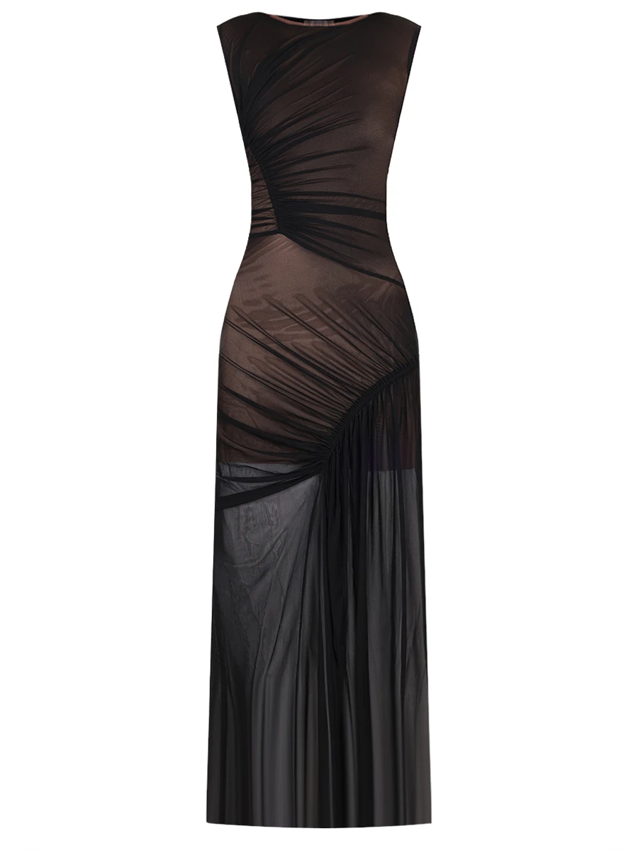 -Полупрозрачное платье в черном цвете от TOOMATCH. -Модель прилегающего силуэта без рукавов, круглым вырезом горловины, телесным подкладом и ассиметричными сборками. -Платье настолько эффектное, что не нуждается ни в каких дополнениях.