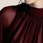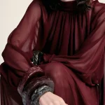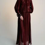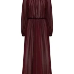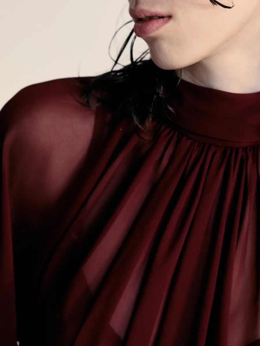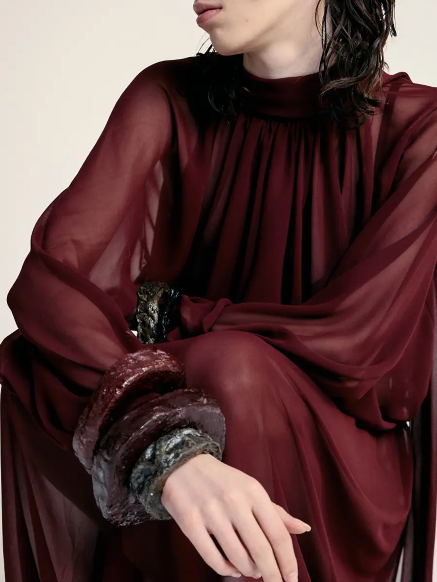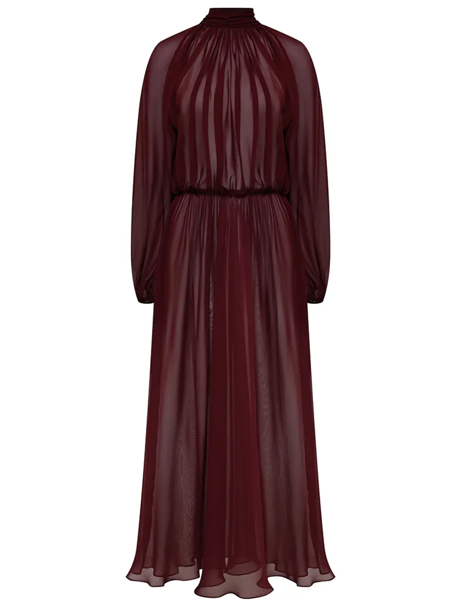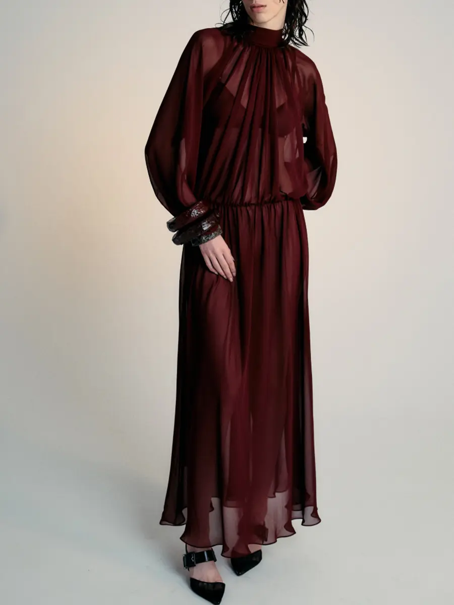 -Легкое платье-макси из шифоновой полупрозрачной ткани в бордовом цвете от SOROKA ON COURSE. -Модель с расклешенной юбкой, длинными свободными рукавами, воротником-аскот. -Идет в комплекте с нижним платьем.
