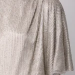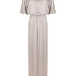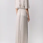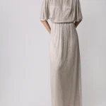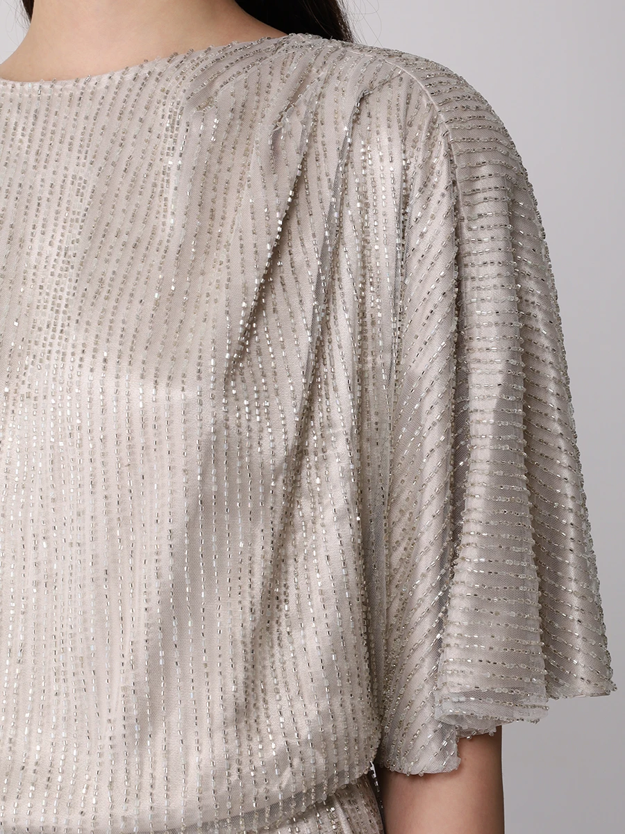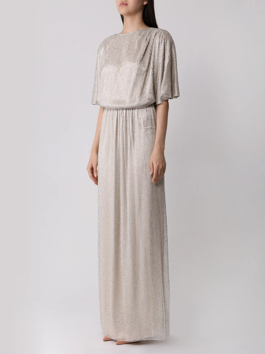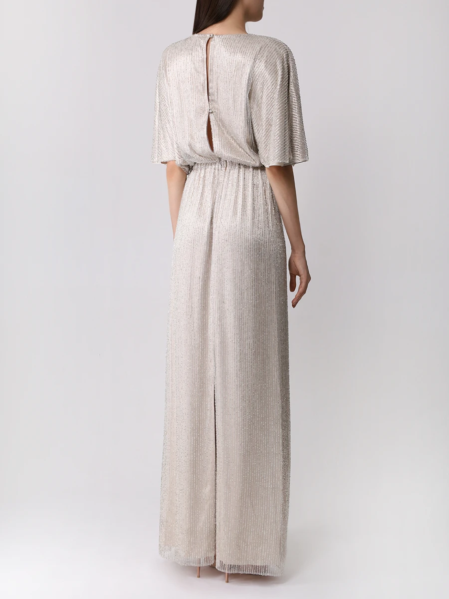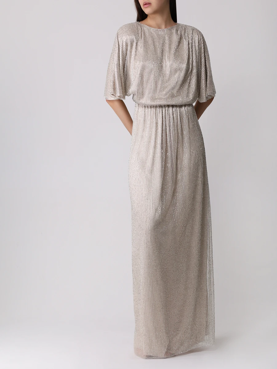 -Серебристое платье из сетки, вручную расшитой чешским стеклярусом, от LOST GENOME. -Модель в пол с вырезом-лодочкой, широкой линией плеча с легкой драпировкой и подплечниками, рукавами-кимоно до локтя, резинкой на талии, лифом с напуском, прямой юбкой с высоким разрезом сзади, застежкой на пуговицы с кристаллами. -Вечерний образ дополнят базовые туфли-лодочки или босоножки на высоком каблуке.