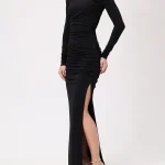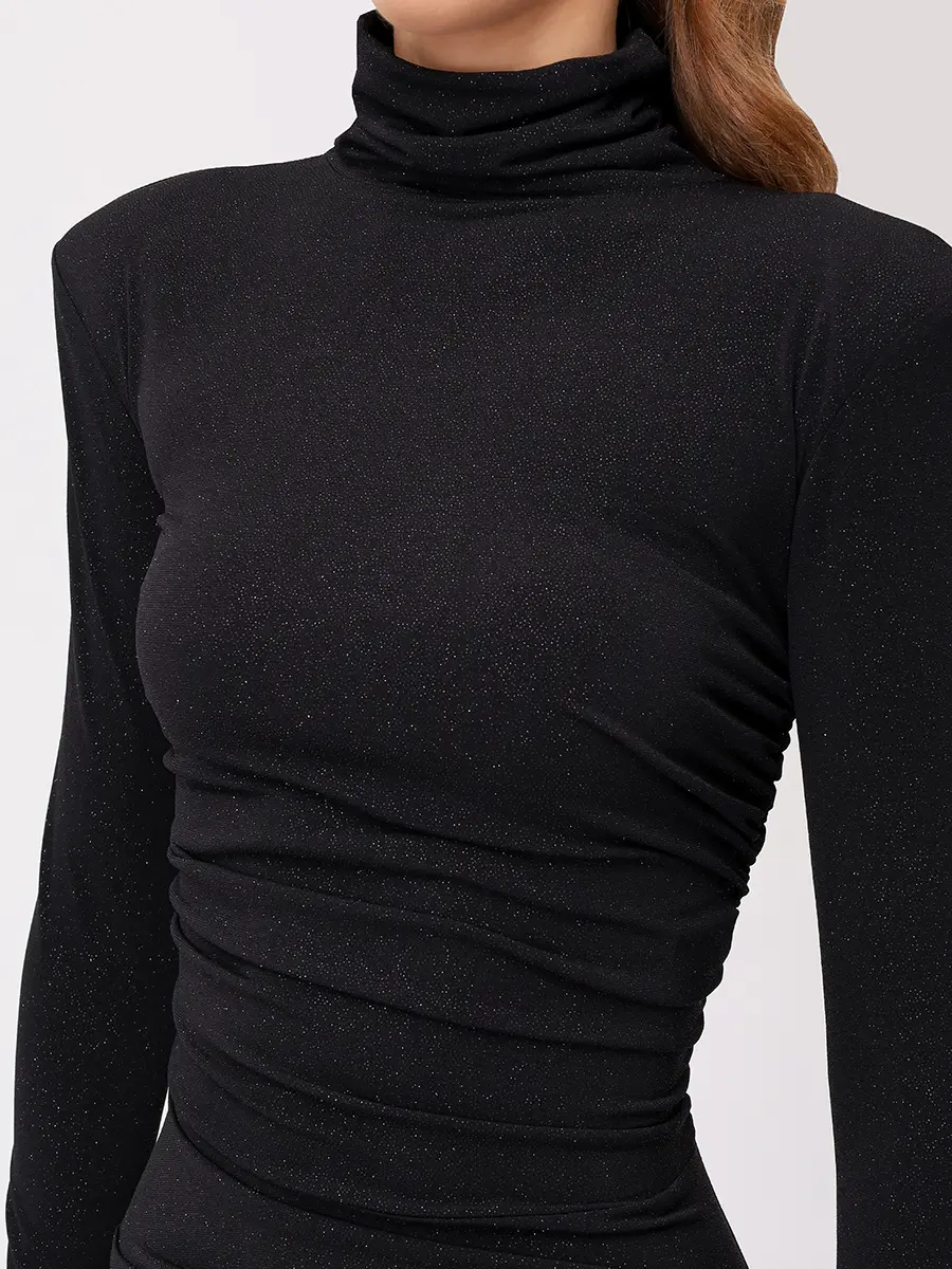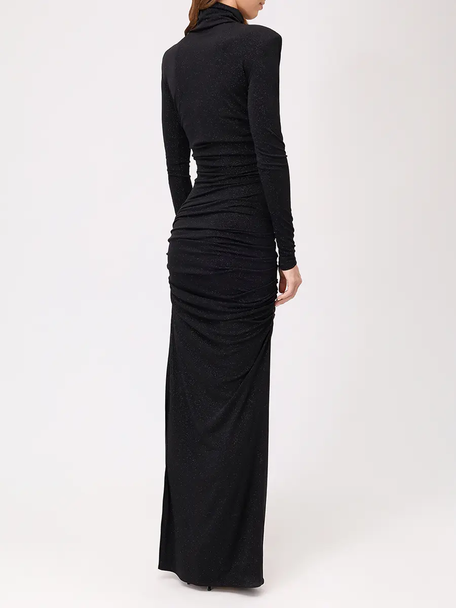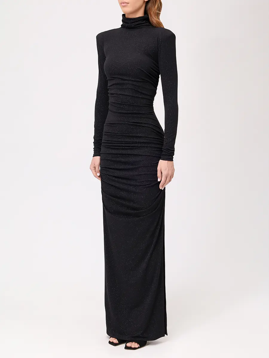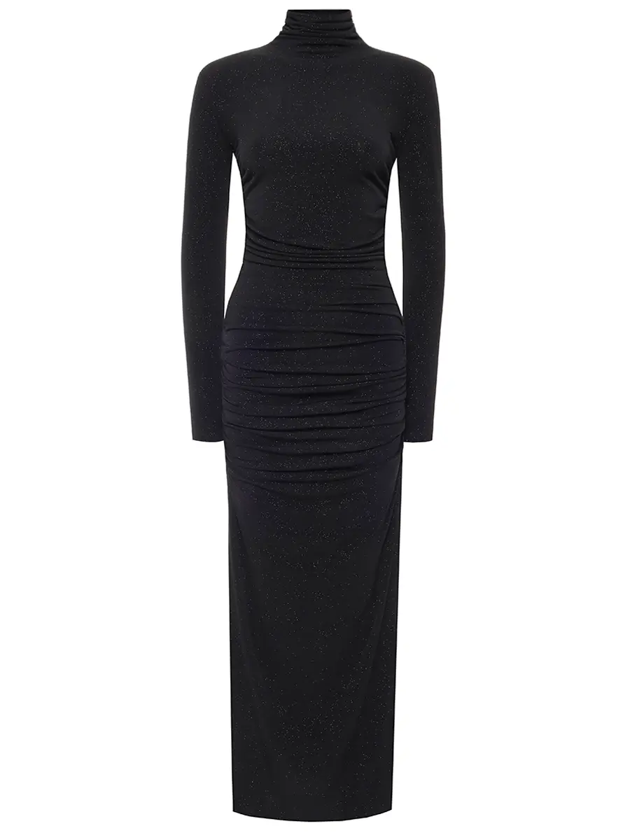 -Черное платье-макси из коллекции COSMOS с мелким блестящим напылением от SO BEAUTIFUL & WILD. -Модель облегающего кроя с длинными рукавами, воротником-стойкой, легкой драпировкой и высоким боковым разрезом. -Лаконичное платье, в котором нет ничего лишнего уместно дополнит коктейльные или вечерние мероприятия. Обхват груди (см) XS 84-92 S 90-98 M 96-104 L 102-110 Обхват талии (см) XS 64-74 S 72-82 M 80-90 L 88-98 Обхват бедра (см) XS 90-98 S 98-106 M 106-114 L 114-122