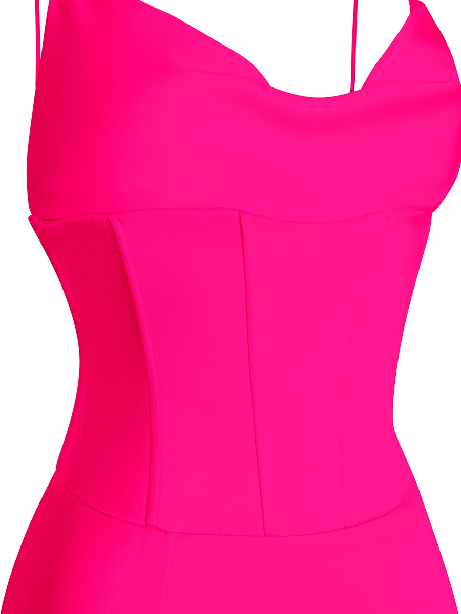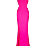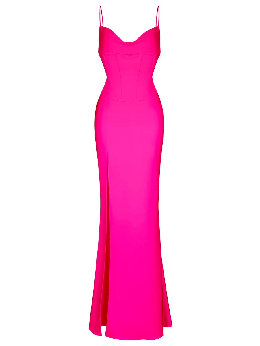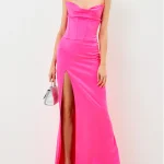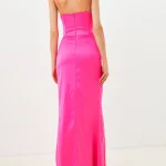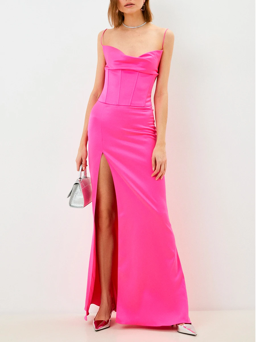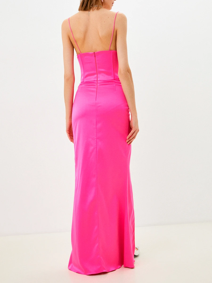-Розовое вечернее платье-макси из искусственного шелка от LI LAB. -Модель с каркасным корсетом на талии, драпировками на груди, узкими бретелями, длинной юбкой с разрезом на бедре и застежкой на потайную молнию сзади.