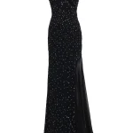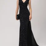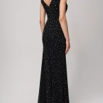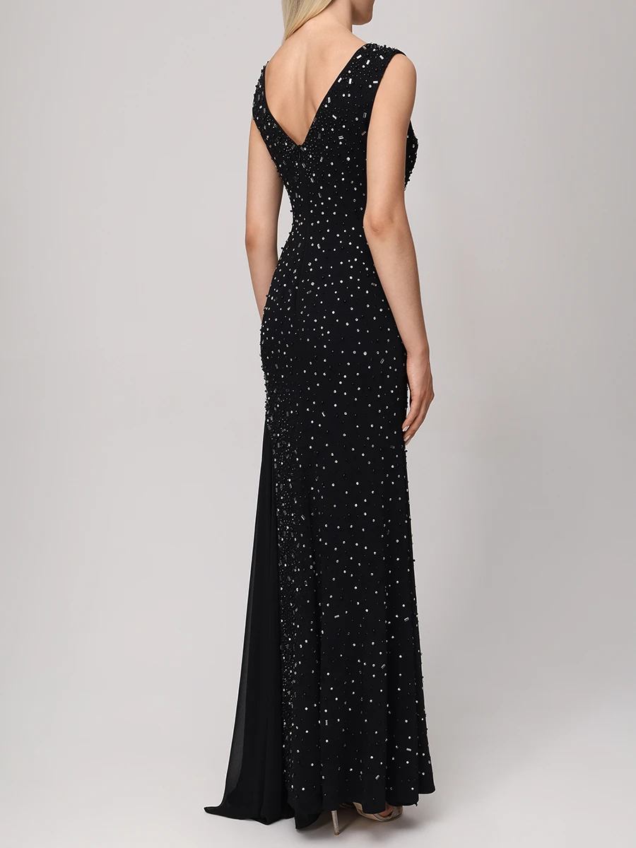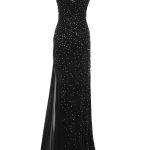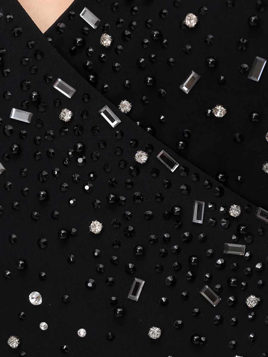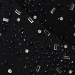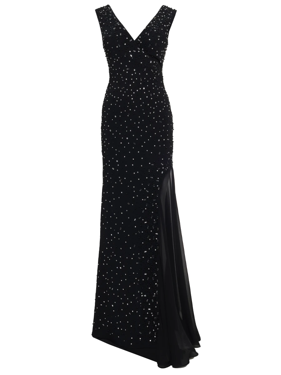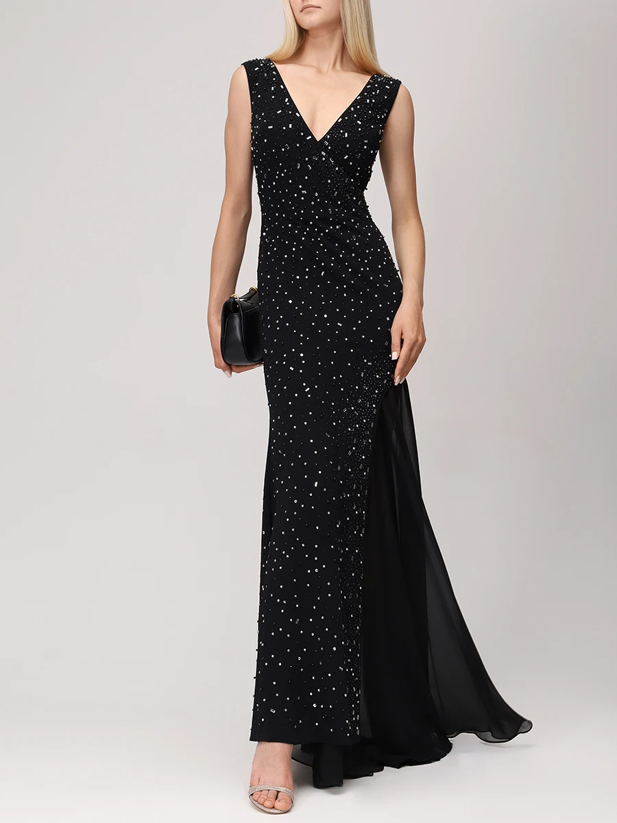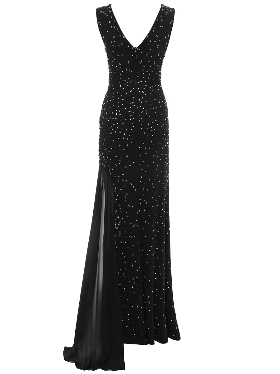 -Черное платье от LEI LUI. -Модель приталенного силуэта с V-образным глубоким декольте, широкими бретелями, застежкой на потайную молнию и асимметричной вставкой сбоку. -Платье вручную декорировано серебристыми и черными кристаллами холодной фиксации.