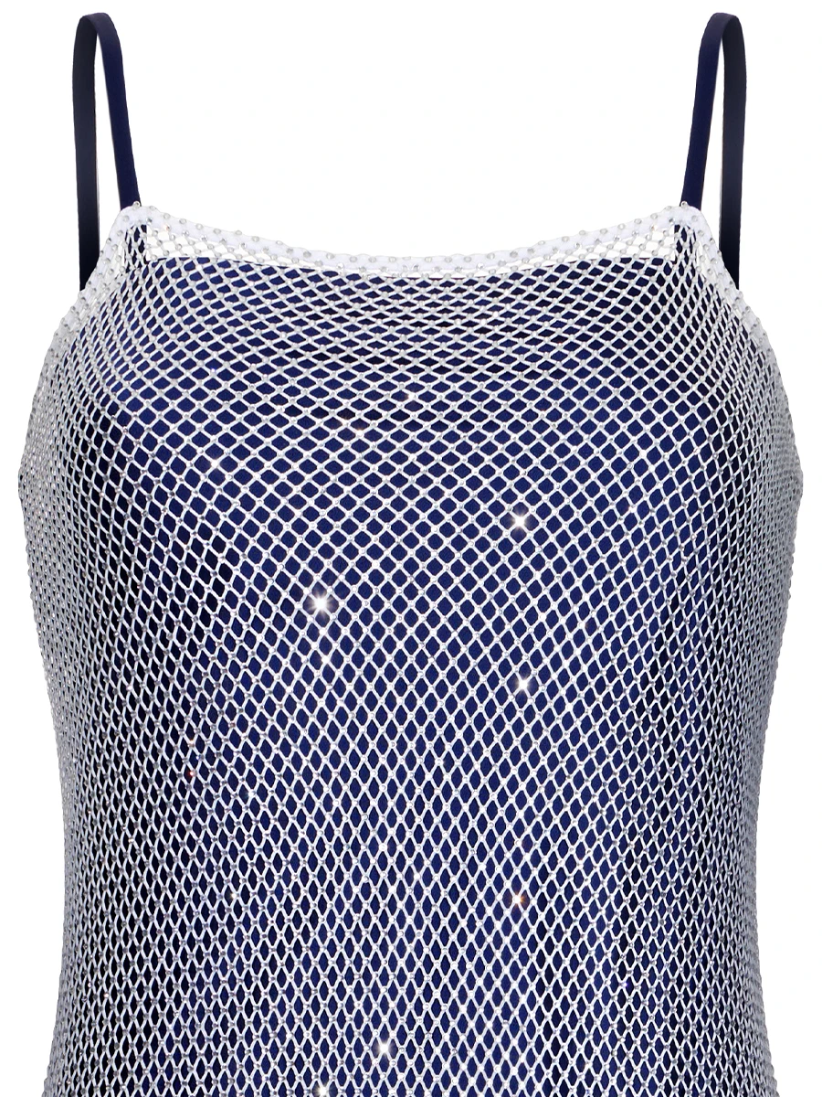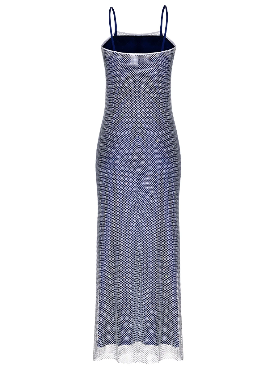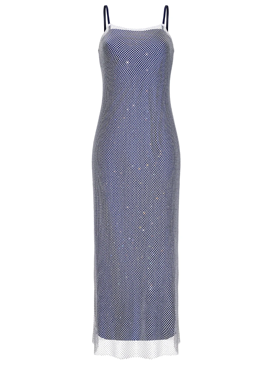 -Платье с кристаллами Swarovski в синем оттенке от ST. ERME. -Модель на бретелях облегающего кроя, подчеркивающий бедра и талию.