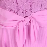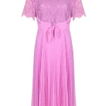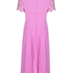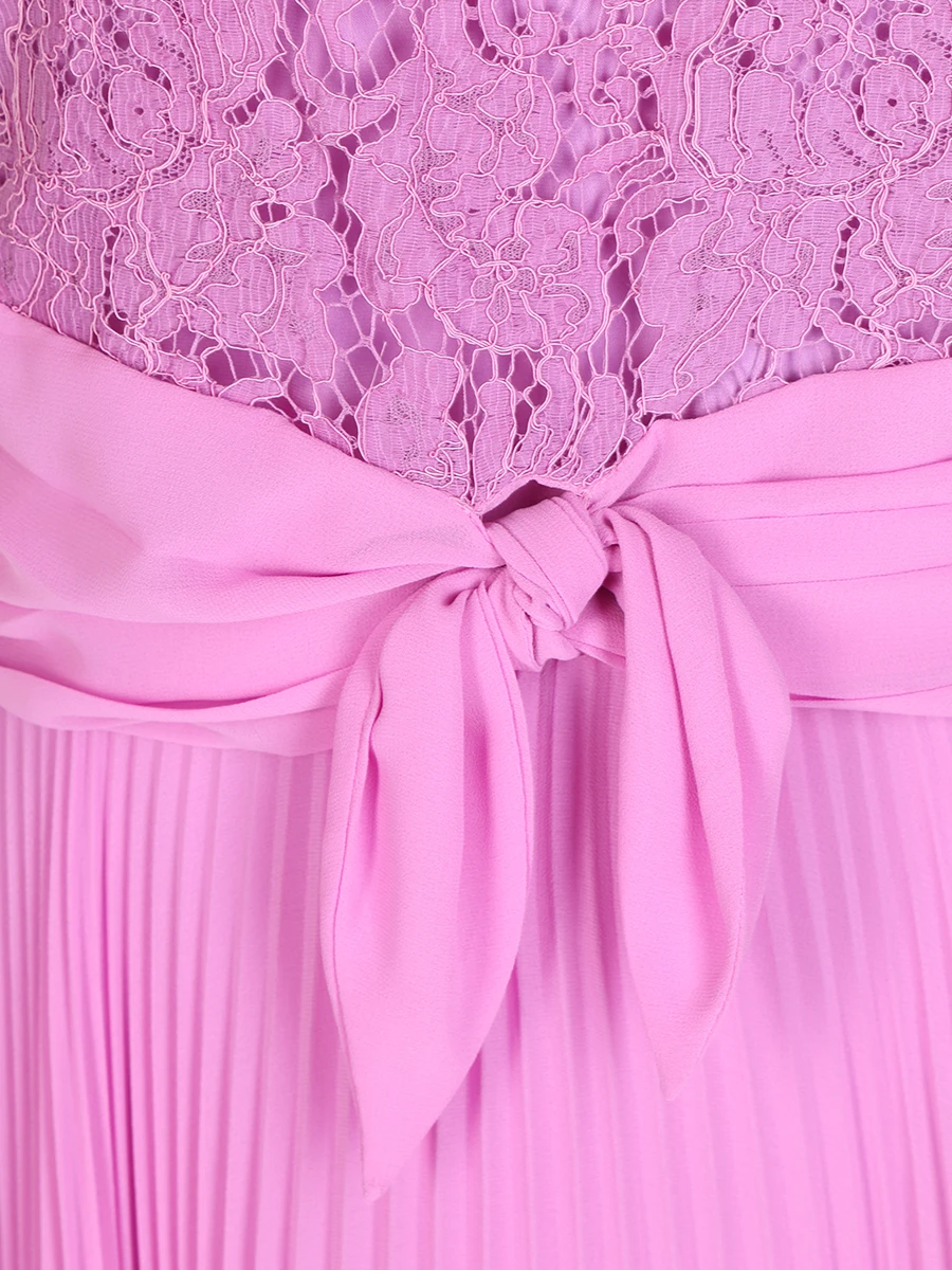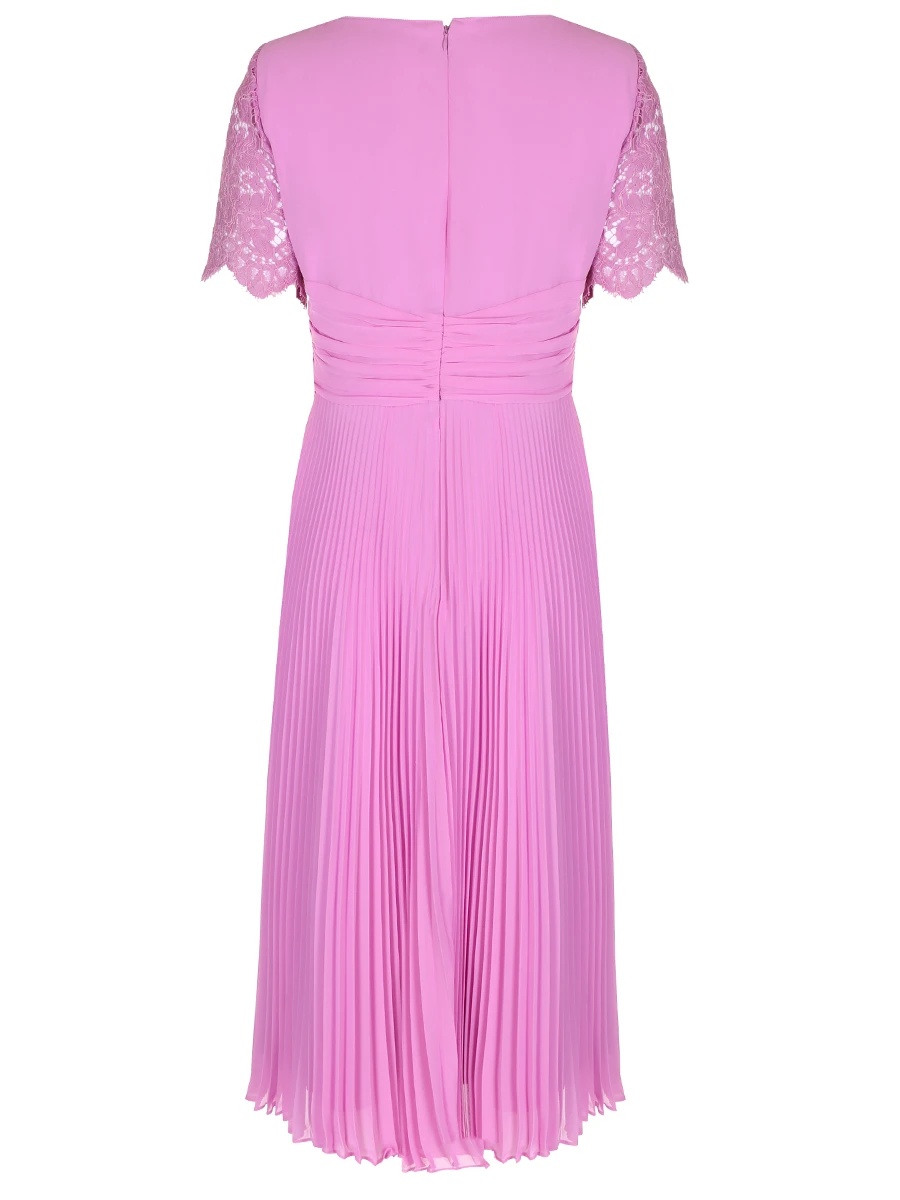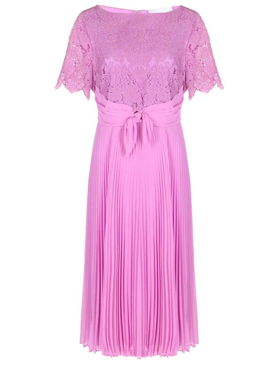 -Розовое платье-миди купажированного состава от GIORGIO GRATI. -В модели сочетаются лиф из гипюрового кружева с короткими рукавами и плиссированная юбка, талия подчеркнута поясом с драпировками и узлом спереди.