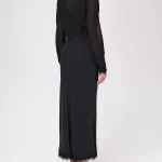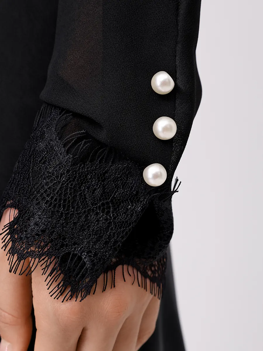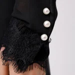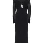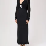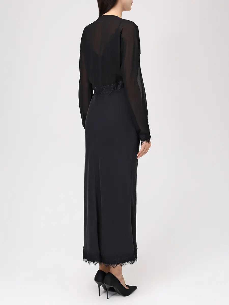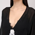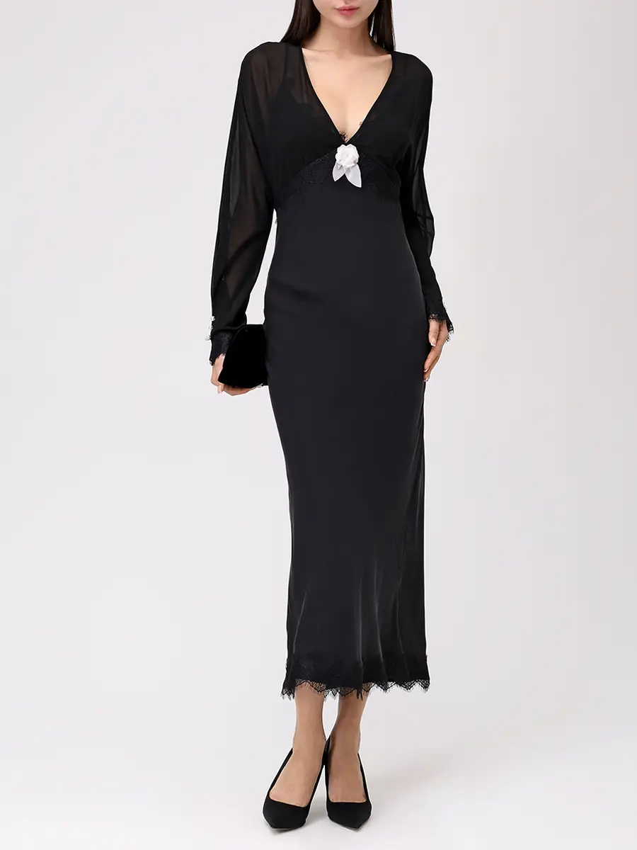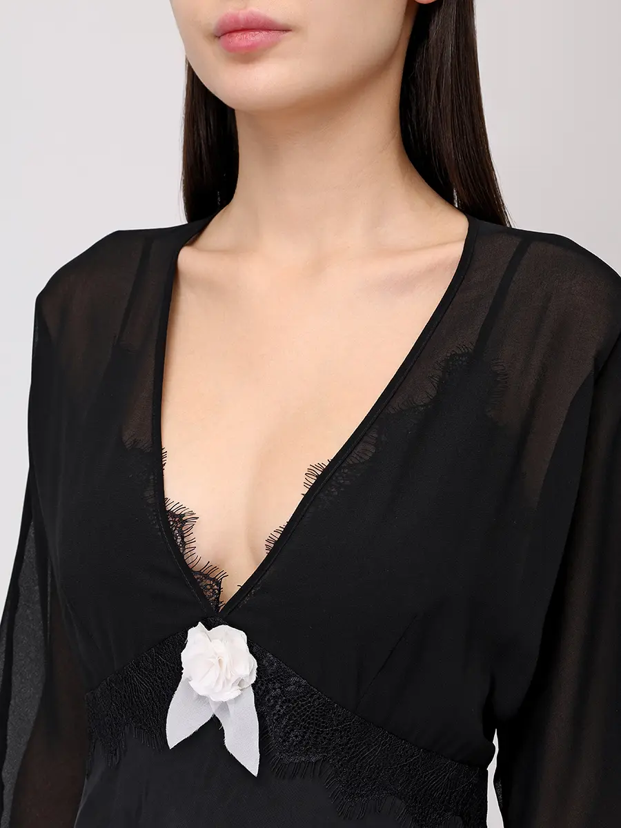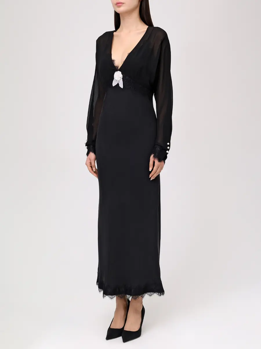 -Черное платье-макси купажированного состава от LAROOM. -Модель приталенного кроя с длинными рукавами, глубоким V-образным вырезом декольте, декором фестончатым кружевом и контрастным детализированным цветком.