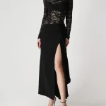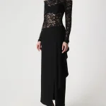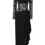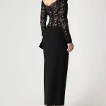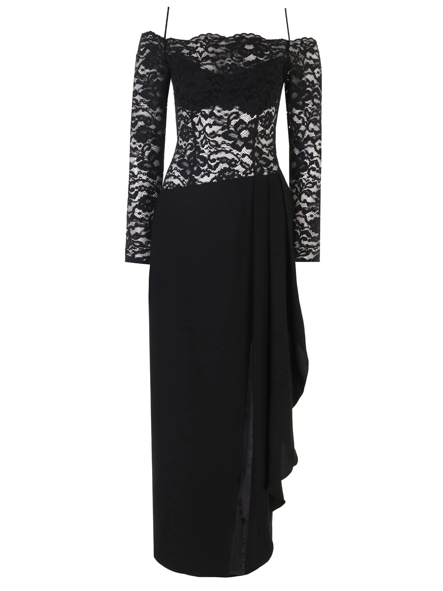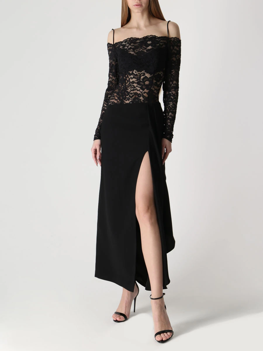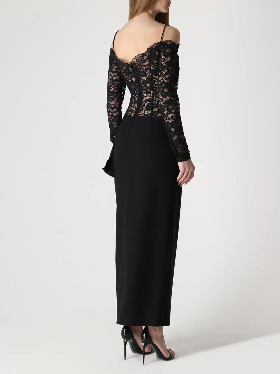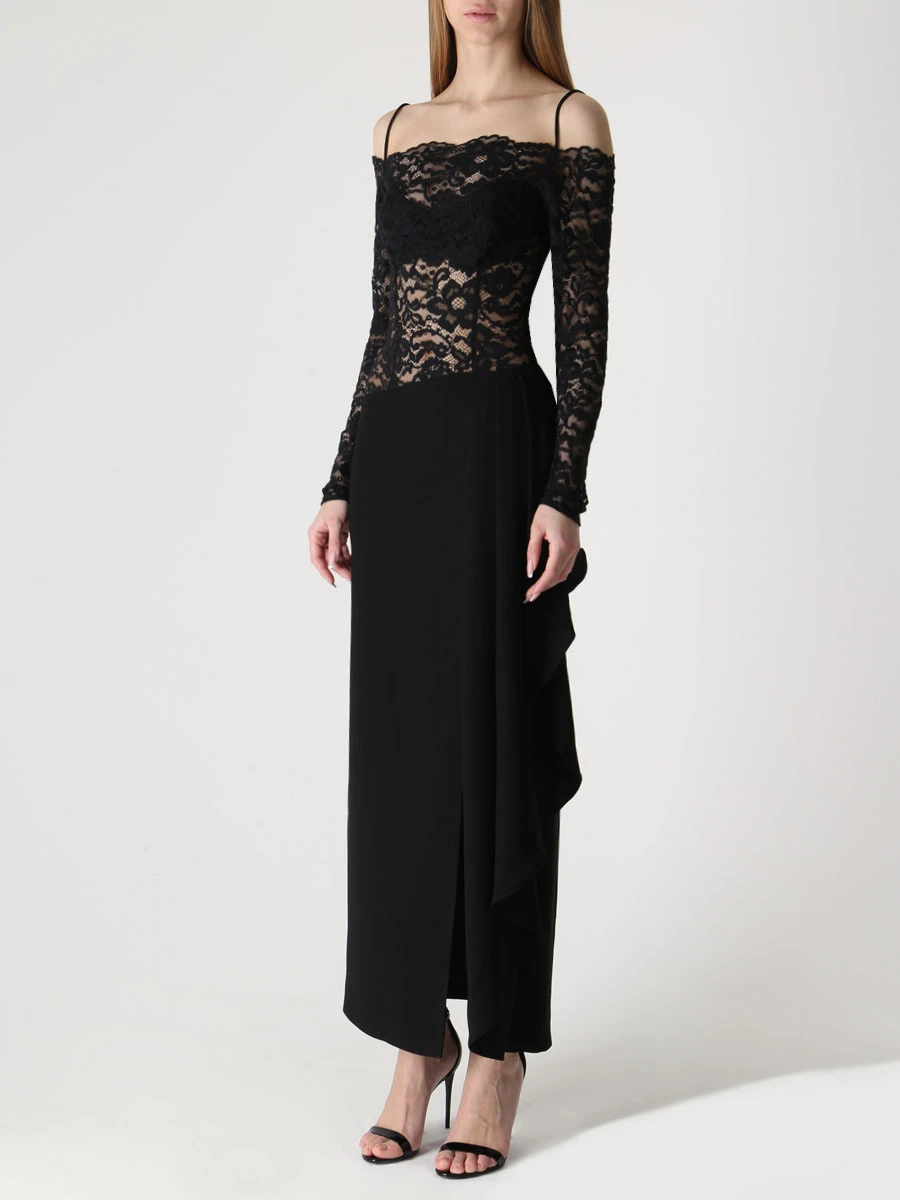 -Черное платье-миди из крепа и кружева от RASARIO. -Бюстье на узких бретелях украшено изящным кружевным тюлем, линия плеч особенно подчеркнута длинными рукавами. -Асимметричная форма юбки с оборками из крепа позволяет выигрышно играть с пропорциями фигуры и в динамике демонстрировать красоту образа.