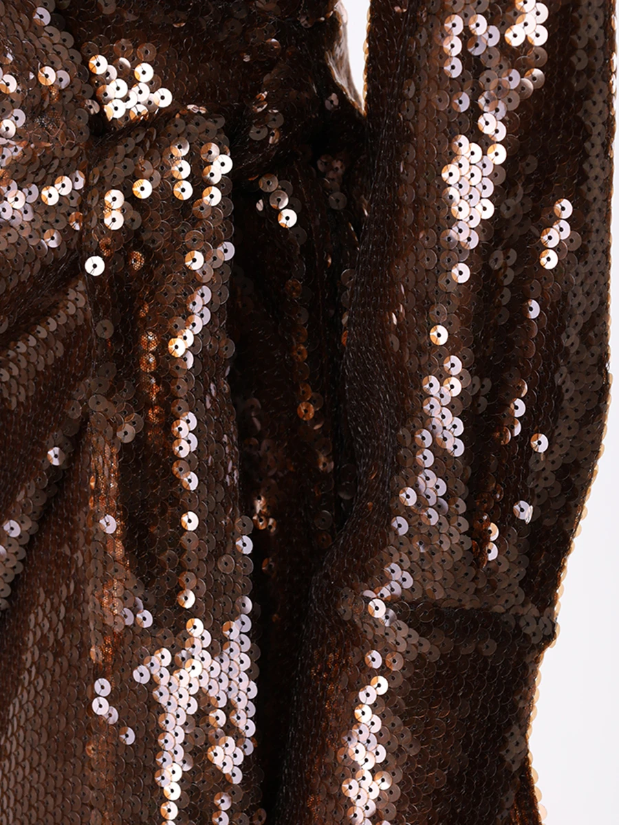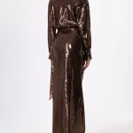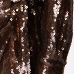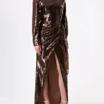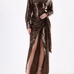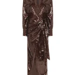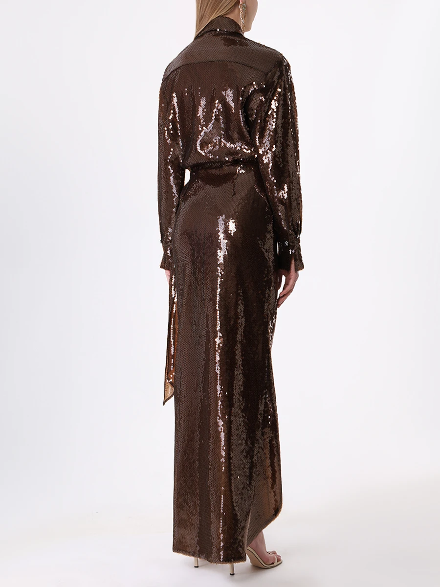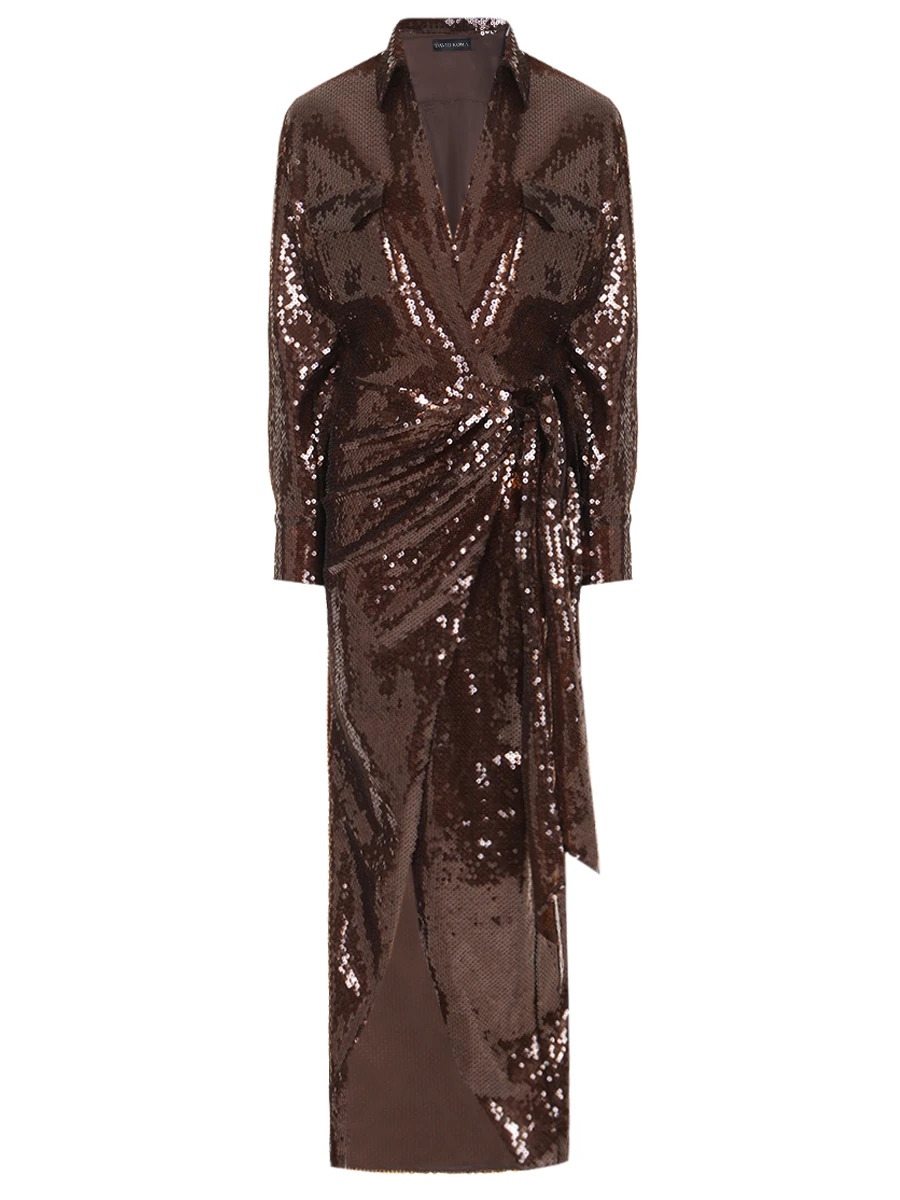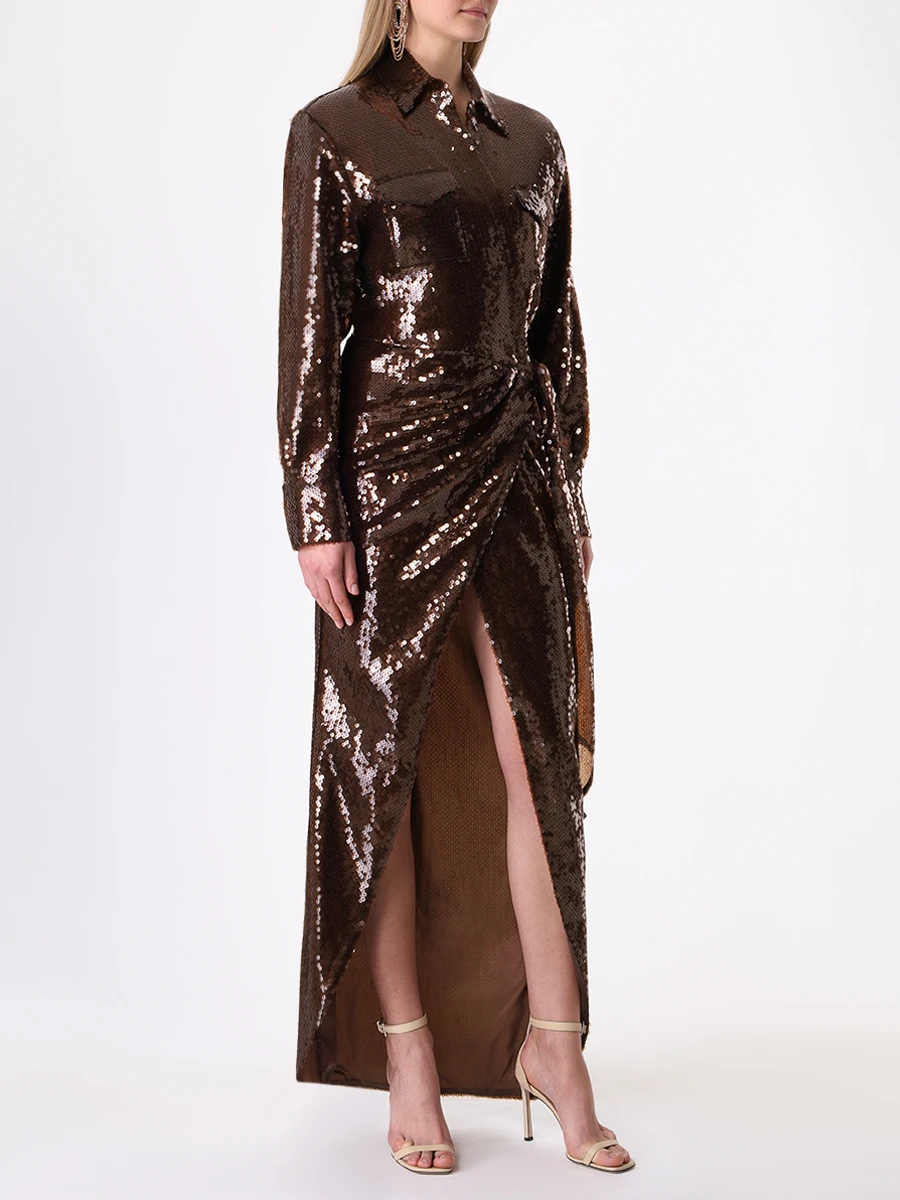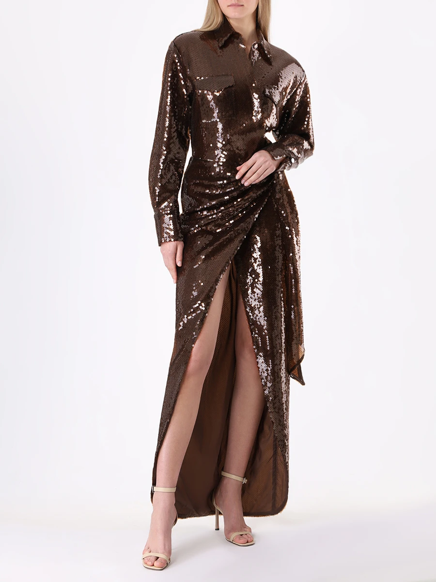 -Платье-макси купажированного состава в шоколадном цвете, расшитое мерцающими пайетками, от DAVID KOMA. -Модель на запах с длинными рукавами, манжетами, отложным воротником, нагрудными накладными карманами, эффектным вырезом спереди и драпировками на талии.