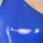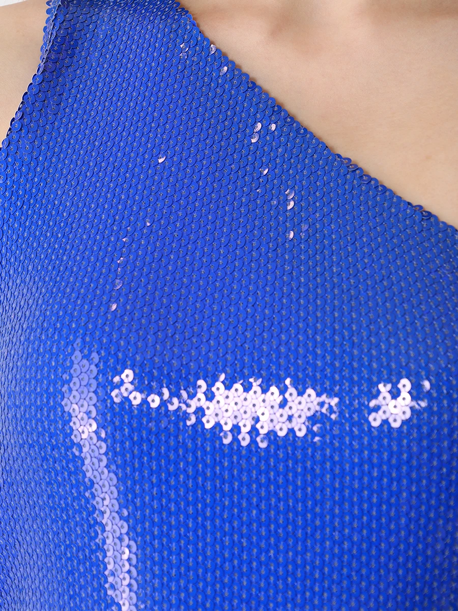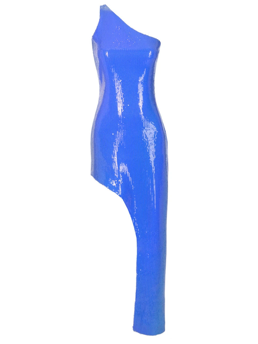 -Синее мини-платье купажированного состава, расшитое пайетками, от DAVID KOMA. -Модель облегающего кроя на одно плечо с акцентом на талии и бедрах, асимметричной длиной подола и застежкой на потайную молнию сзади.