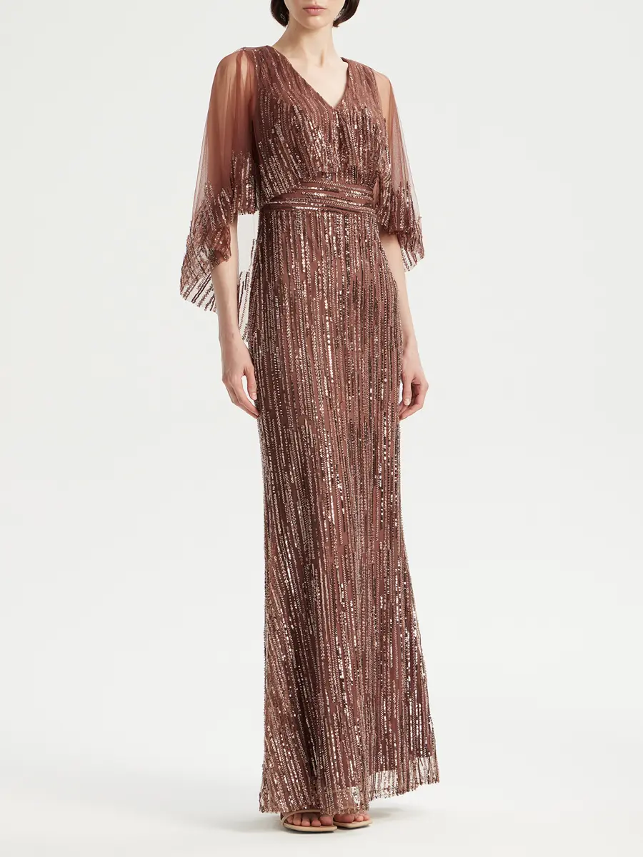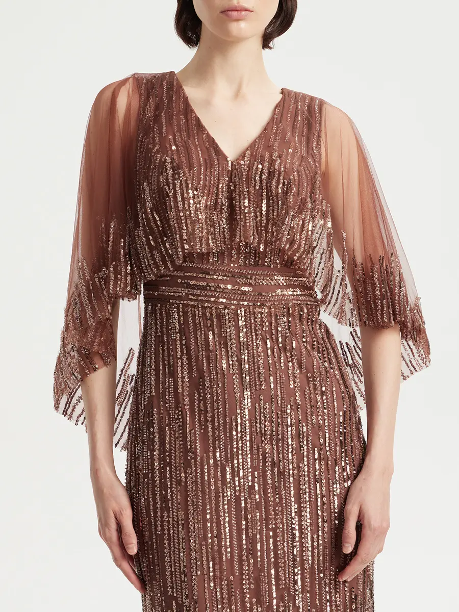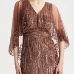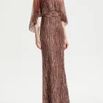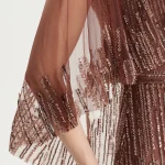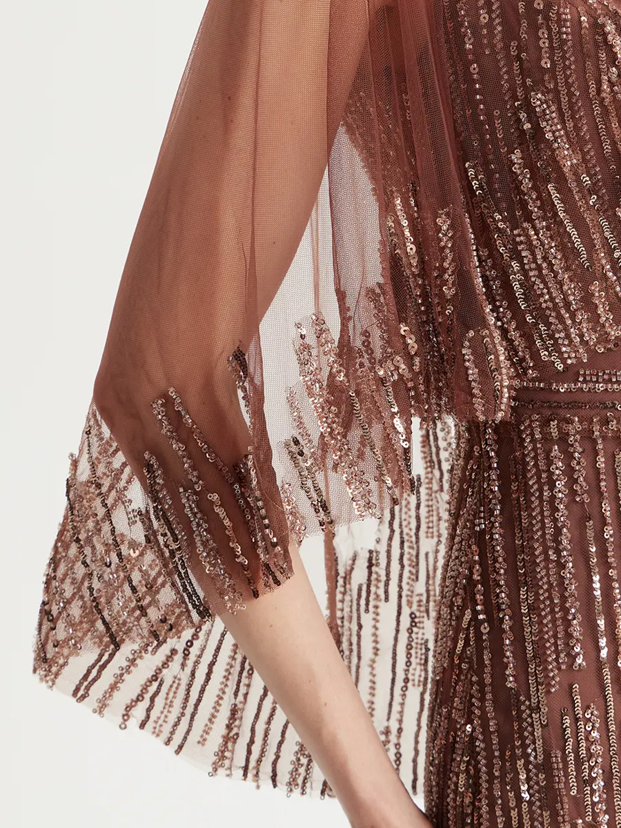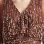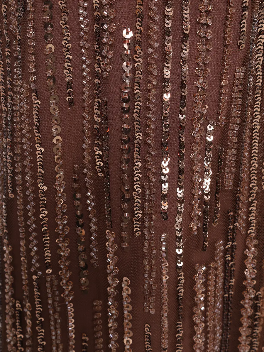 -Коричневое платье, украшенное изысканной вышивкой из бисера и пайеток, от EMILIA DELL’ORO. -Модель приталенного кроя с полупрозрачными рукавами, V-образным вырезом на груди и застежкой на потайную молнию на спинке. -Модель с драгоценной фактурой подчеркивает фигуру благодаря встроенным мягким чашкам и выверенным пропорциям. -Ручной крой и тонкая работа с деликатной тканью создают вневременной образ утонченной роскоши.