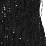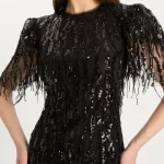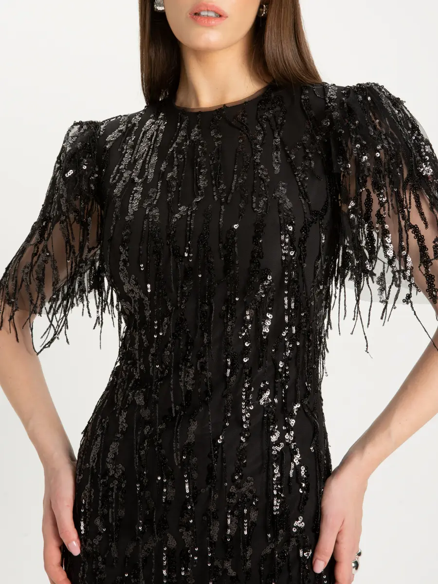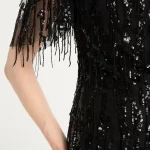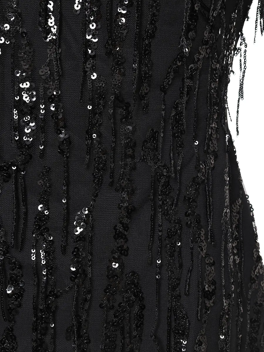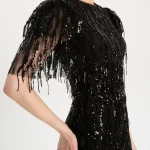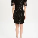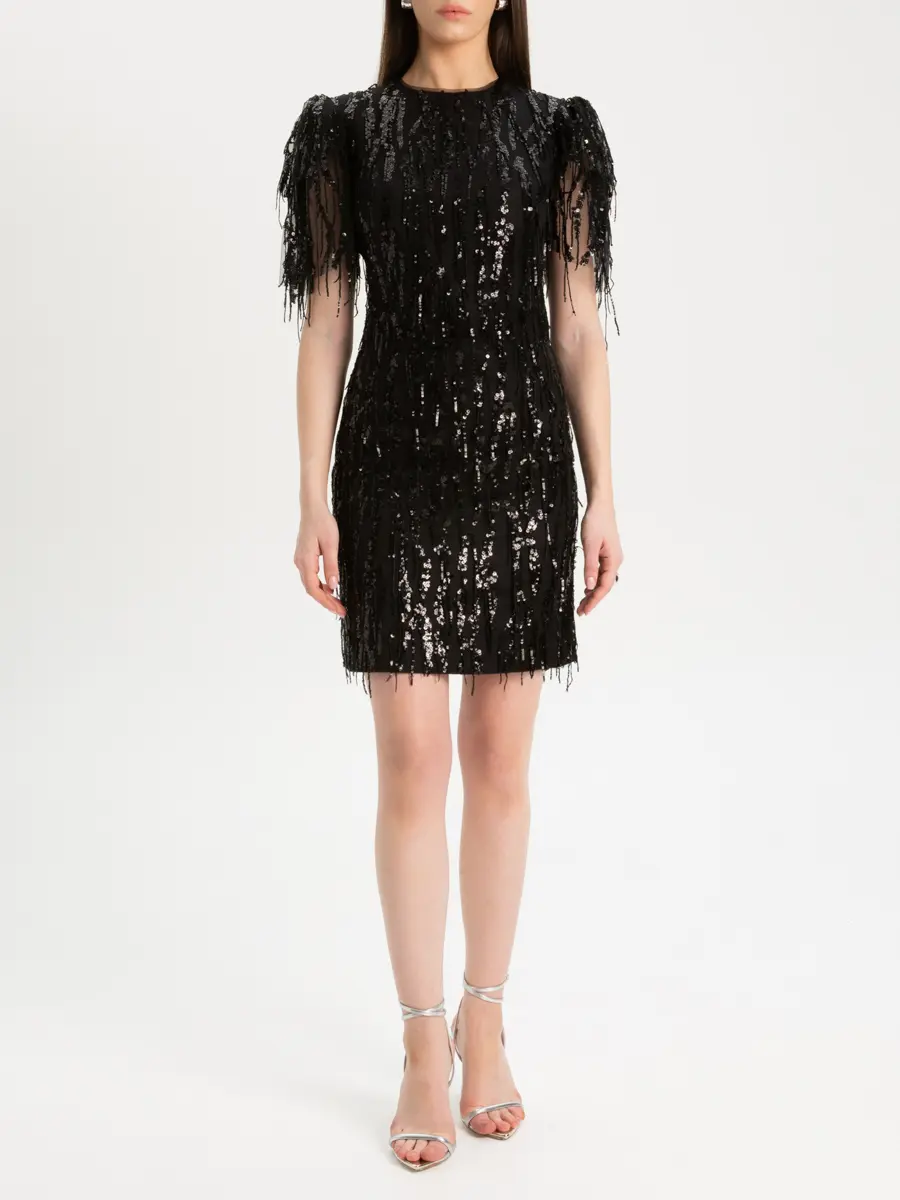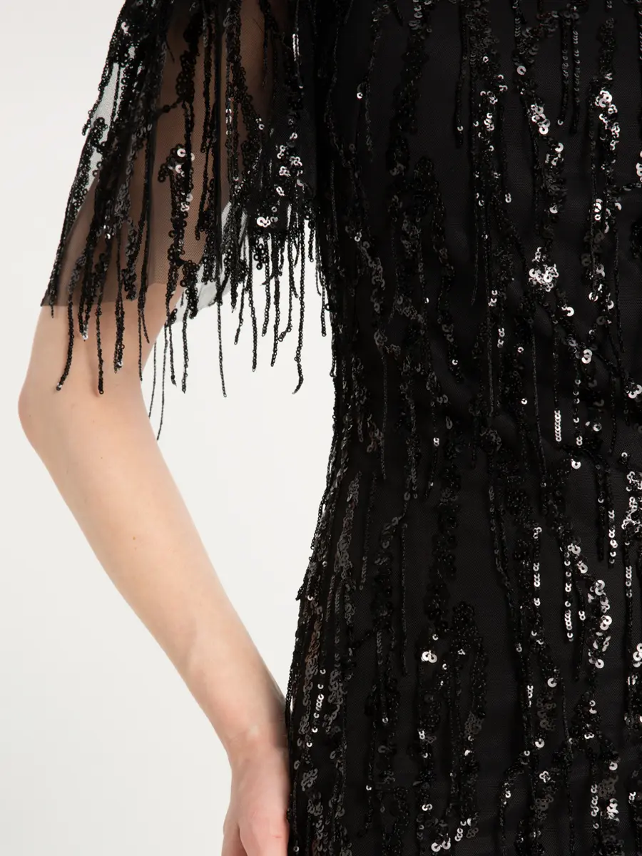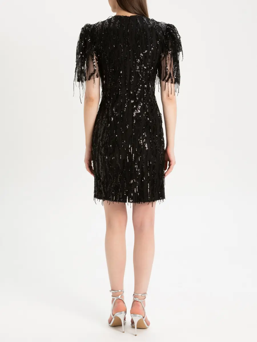 -Черное платье-мини, расшитое нитями пайеток, от EMILIA DELL’ORO. -Модель приталенного кроя с короткими рукавами, круглым вырезом горловины, застежкой на потайную молнию на спинке. -Эффектный образ для коктейльных вечеринок, светских выходов и фотосессий дополнят босоножки на высоком каблуке и минималистичные украшения.
