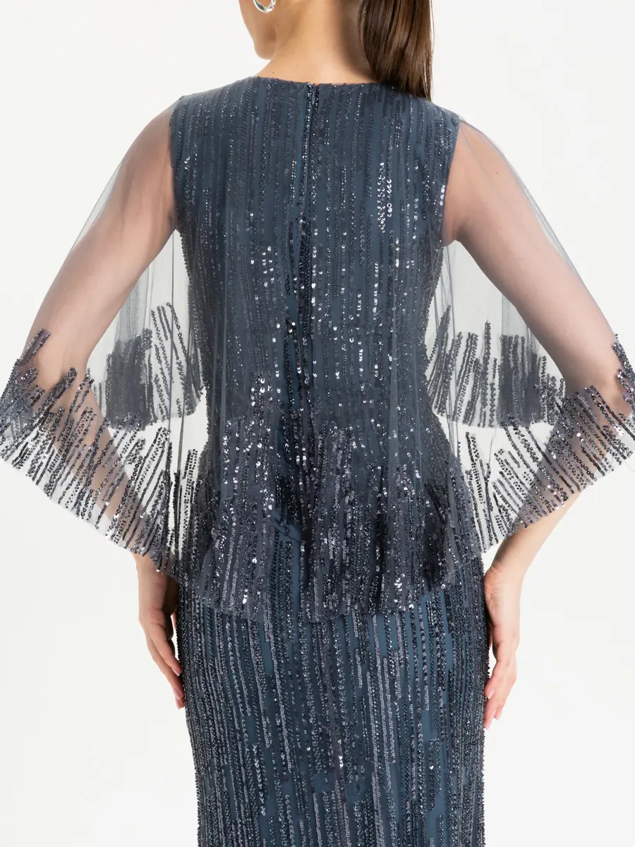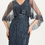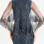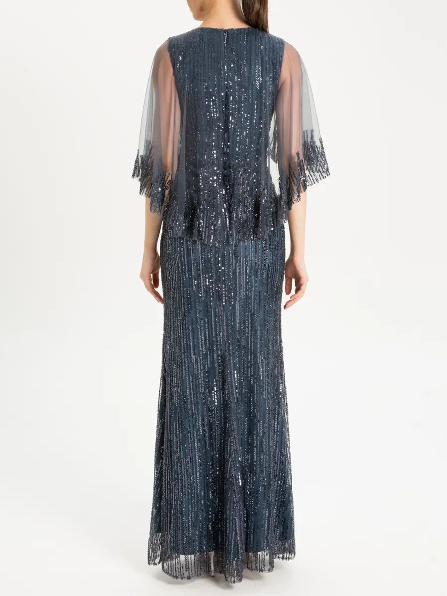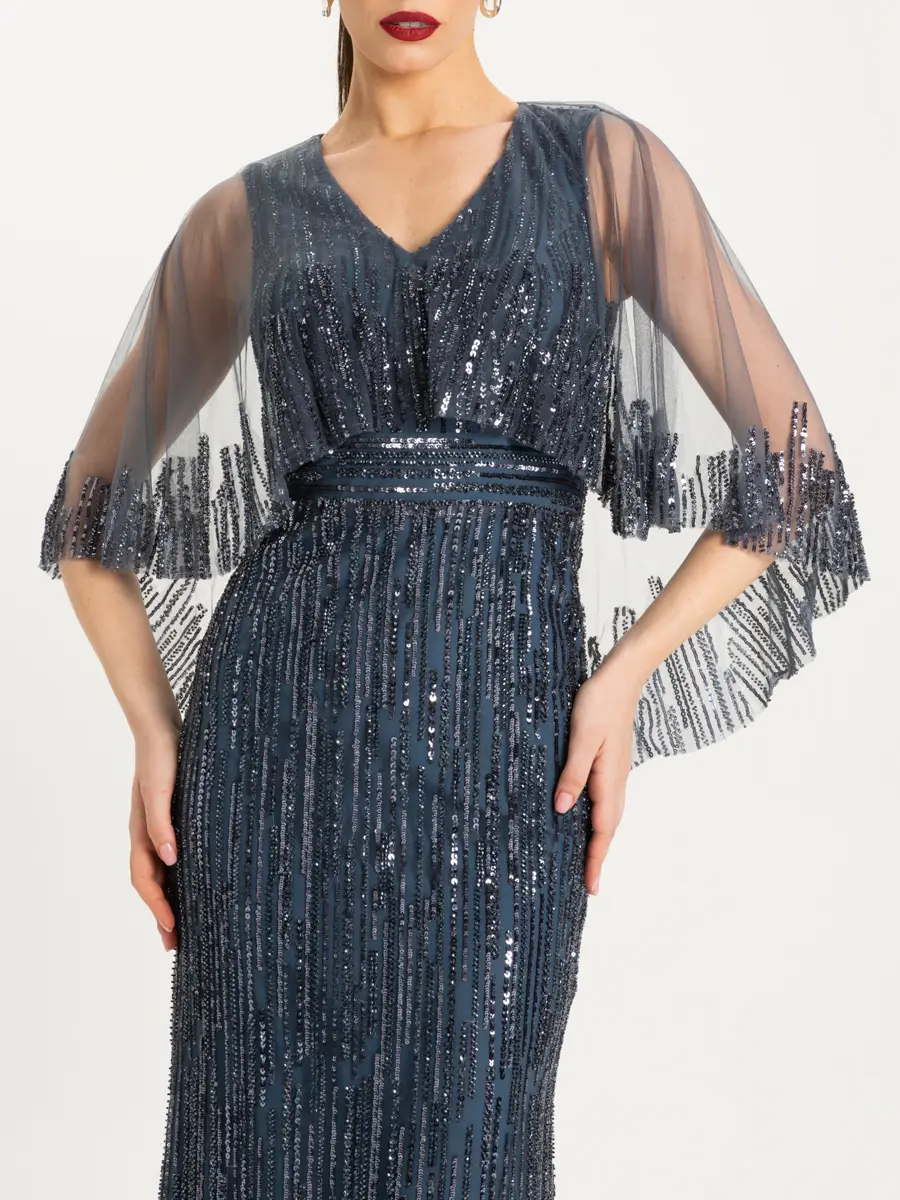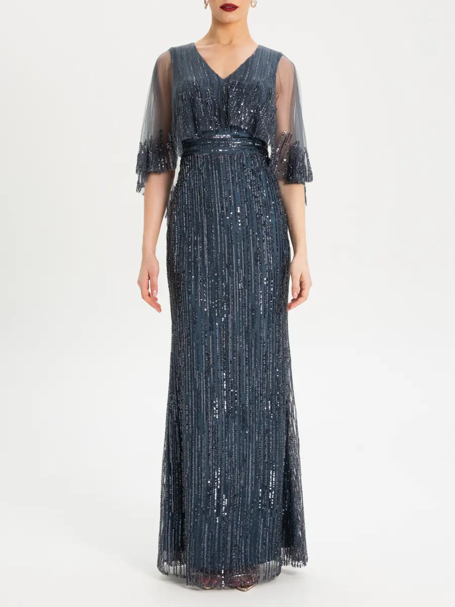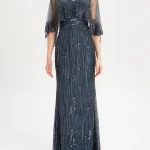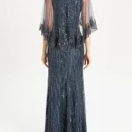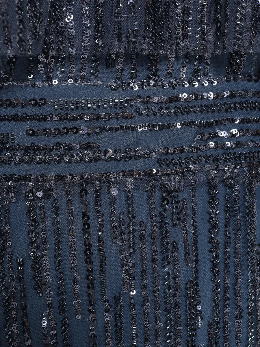 -Синее платье, украшенное изысканной вышивкой из бисера и пайеток, от EMILIA DELL’ORO. -Модель приталенного кроя с полупрозрачными рукавами, V-образным вырезом на груди и застежкой на потайную молнию на спинке. -Модель с драгоценной фактурой подчеркивает фигуру благодаря встроенным мягким чашкам и выверенным пропорциям. -Ручной крой и тонкая работа с деликатной тканью создают вневременной образ утонченной роскоши.