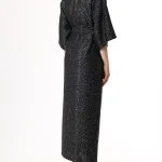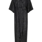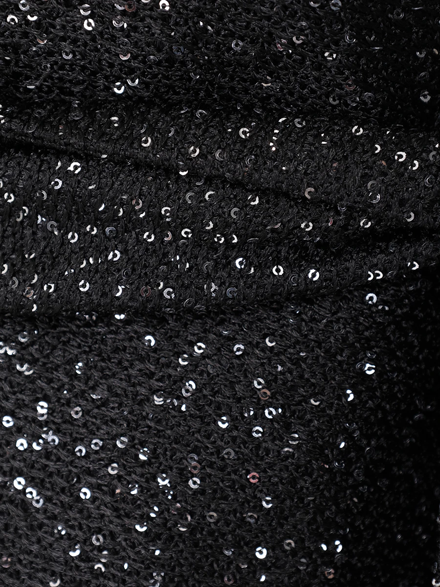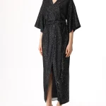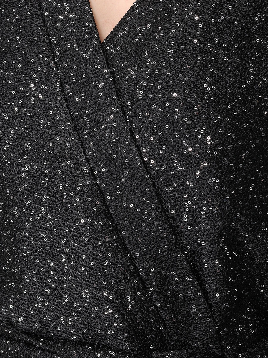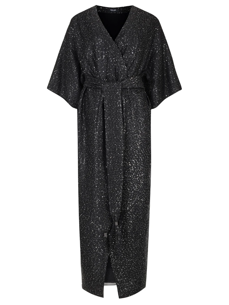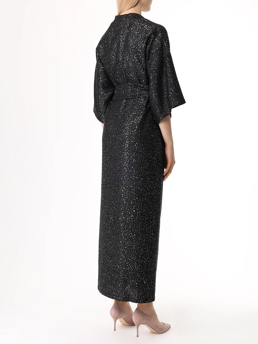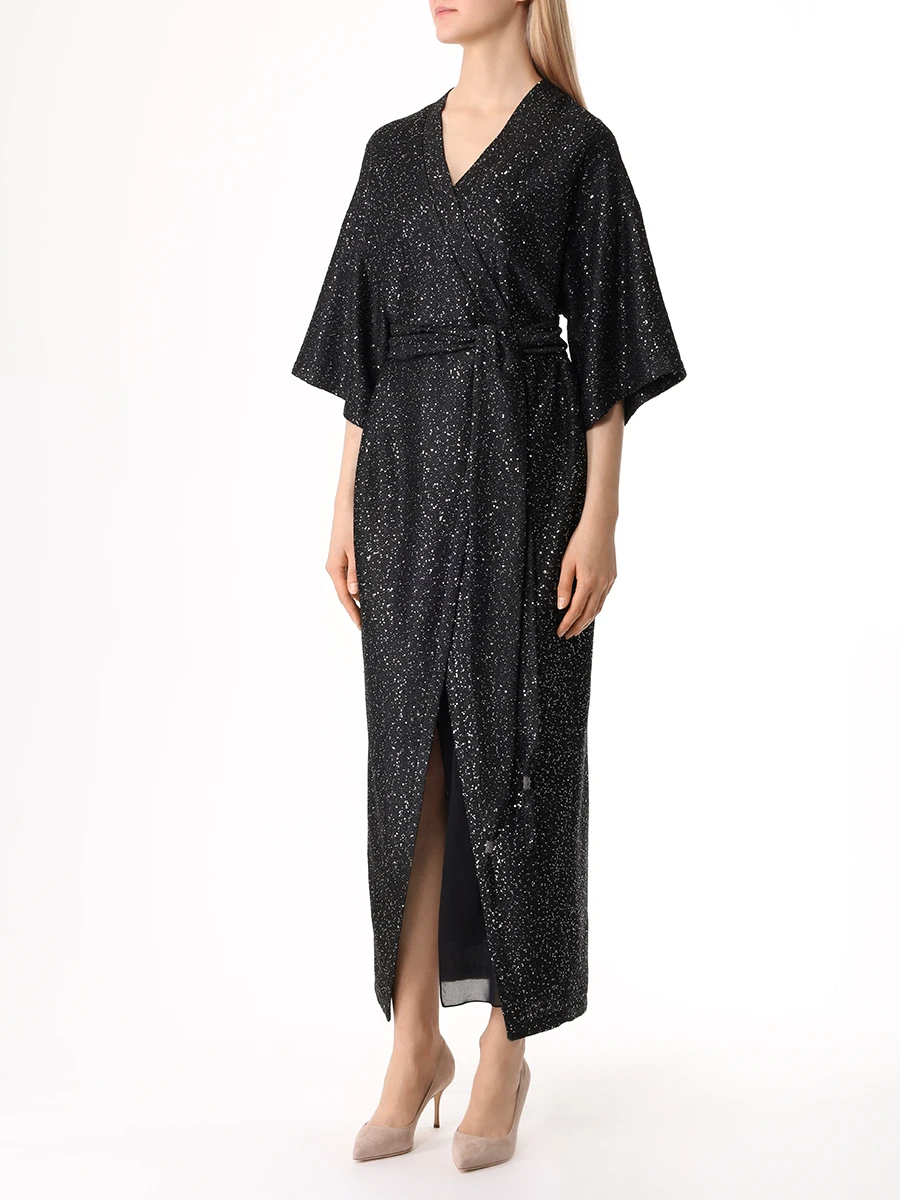 -Черное платье-миди, расшитое мерцающими пайетками, от FREE AGE. -Модель свободного кроя со спущенной линией плеча, широкими рукавами длины 1/2, V-образным запахом на груди и подоле, широким поясом в тон, который подчеркнет талию и структурирует силуэт.