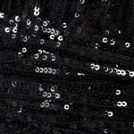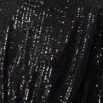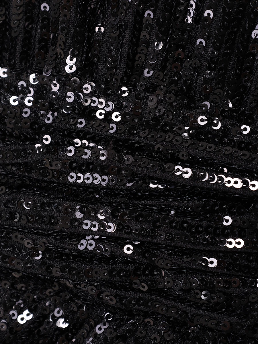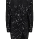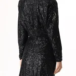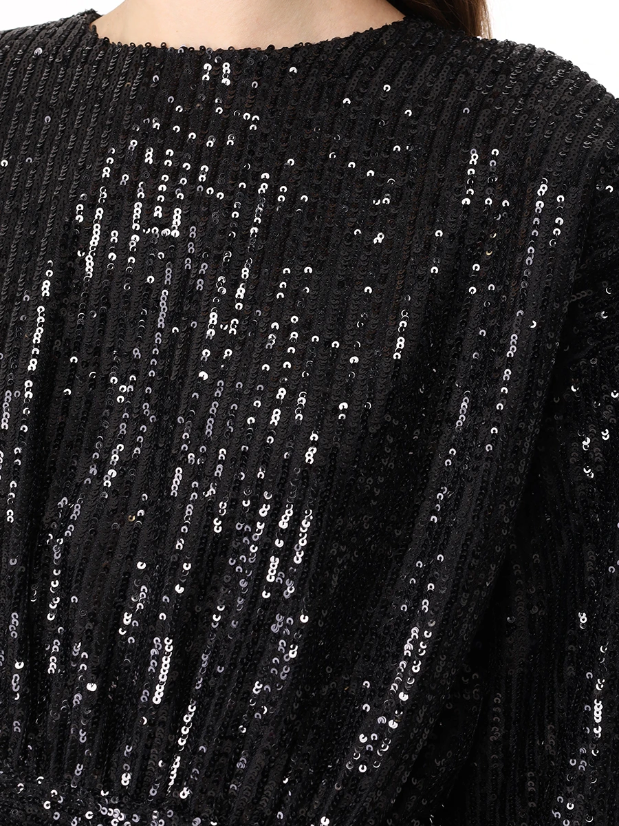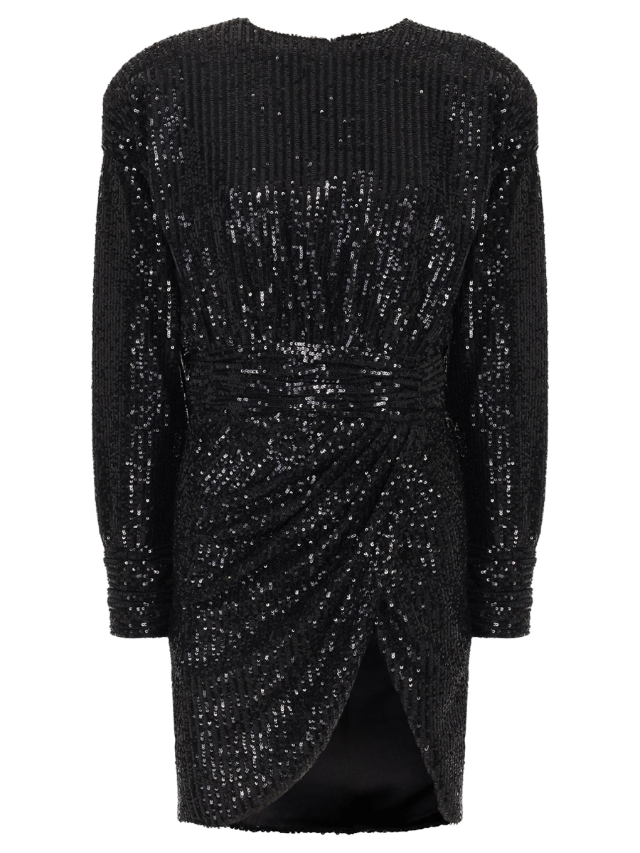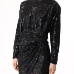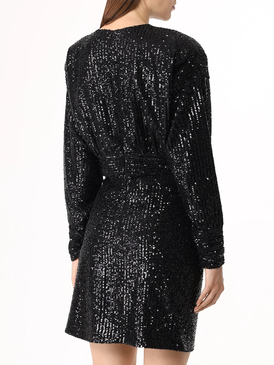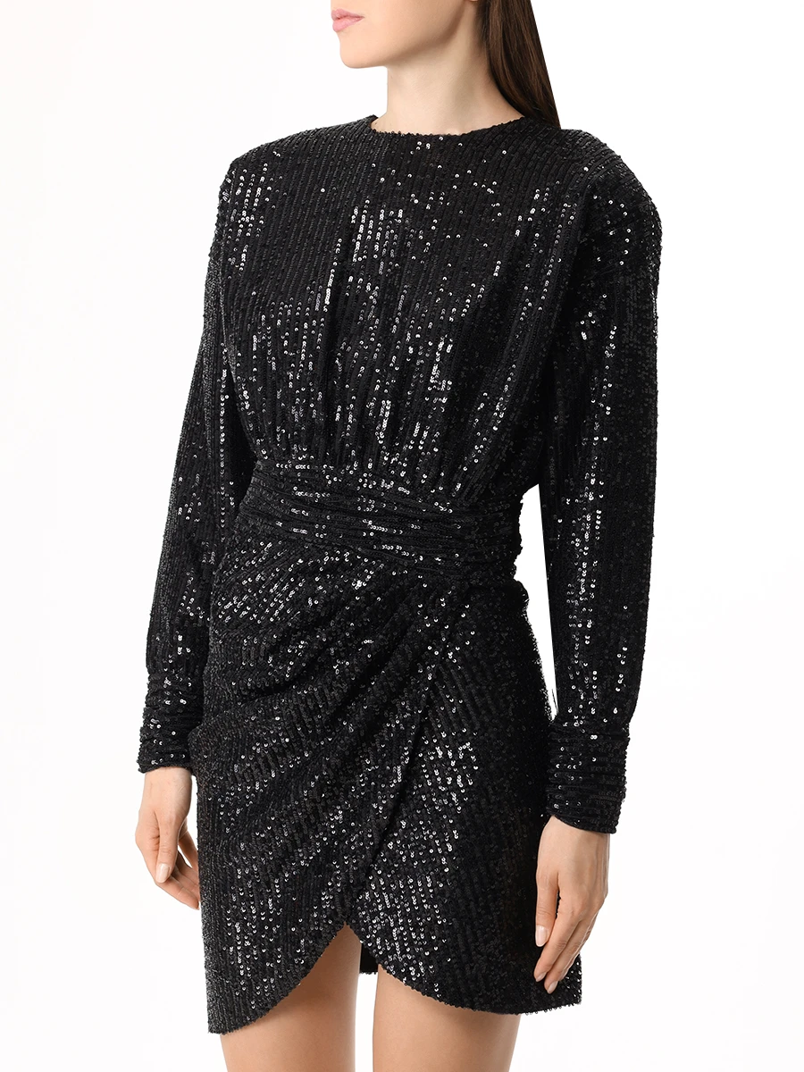 -Черное мини-платье из стрейч-ткани, расшитой пайетками, от IN THE MOOD FOR LOVE. -Модель приталенного кроя с длинными рукавами, округлой горловиной, подолом на запах с драпировками ткани. -Пайетки будут реагировать на каждое движение тела и создавать легкий искрящийся эффект.