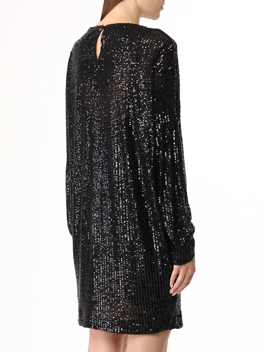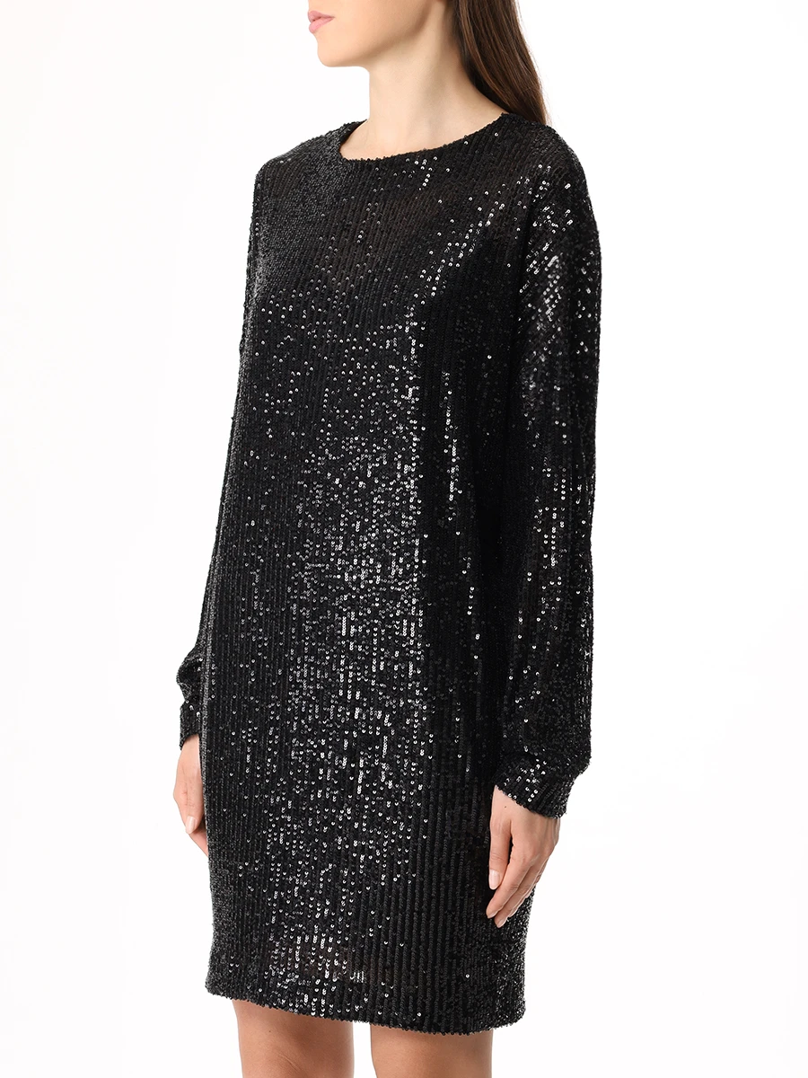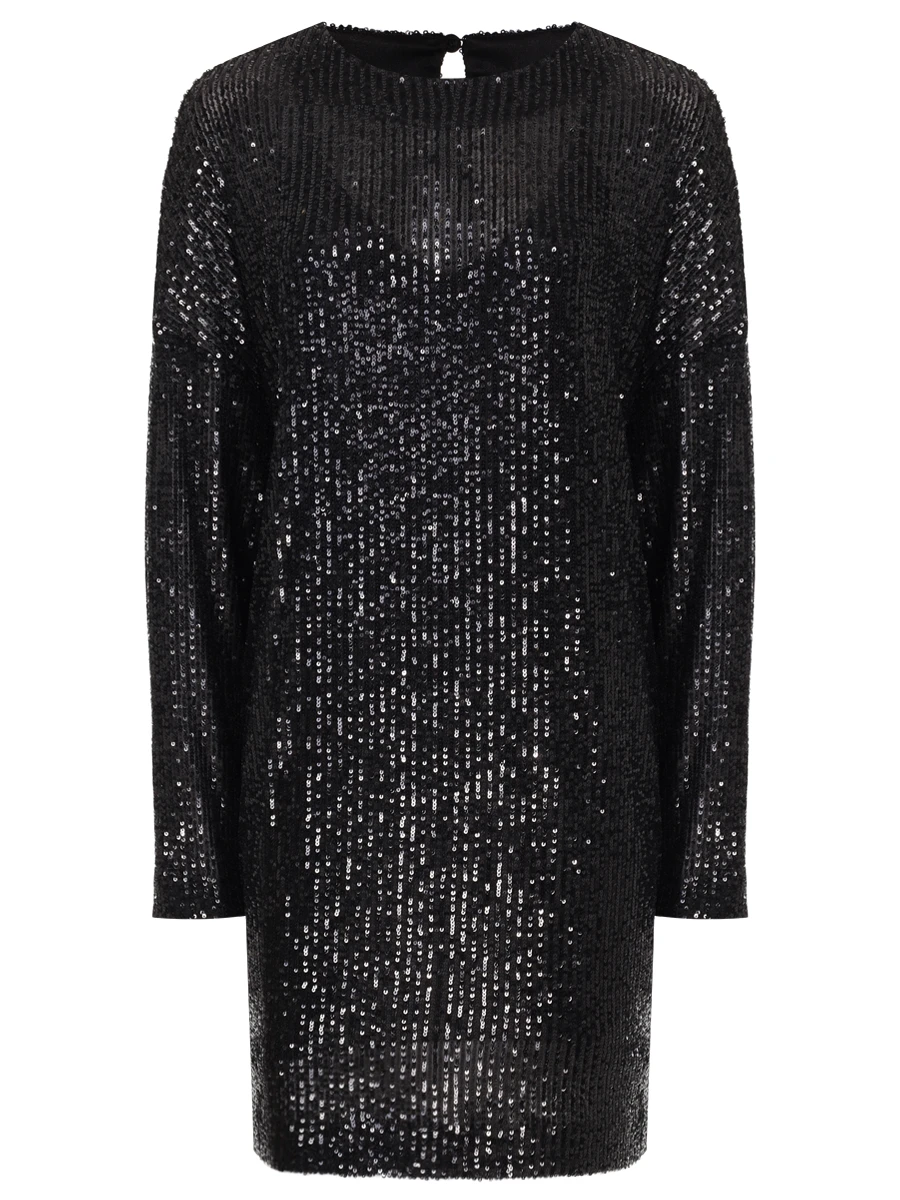 -Черное мини-платье из стрейч-ткани, расшитой пайетками, от IN THE MOOD FOR LOVE. -Модель свободного кроя с длинными рукавами, широким округлым вырезом горловины, вырезом сзади на пуговице. -Пайетки будут реагировать на каждое движение тела и создавать легкий искрящийся эффект. -Платье дополнено нижним базовым платьем в бельевом стиле на узких бретелях.