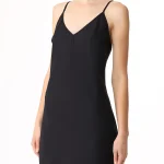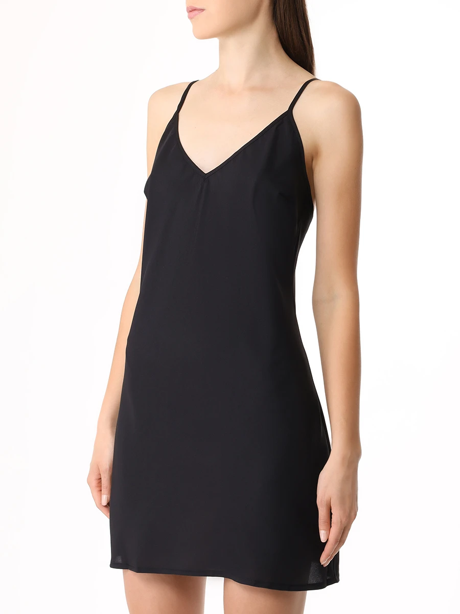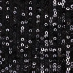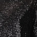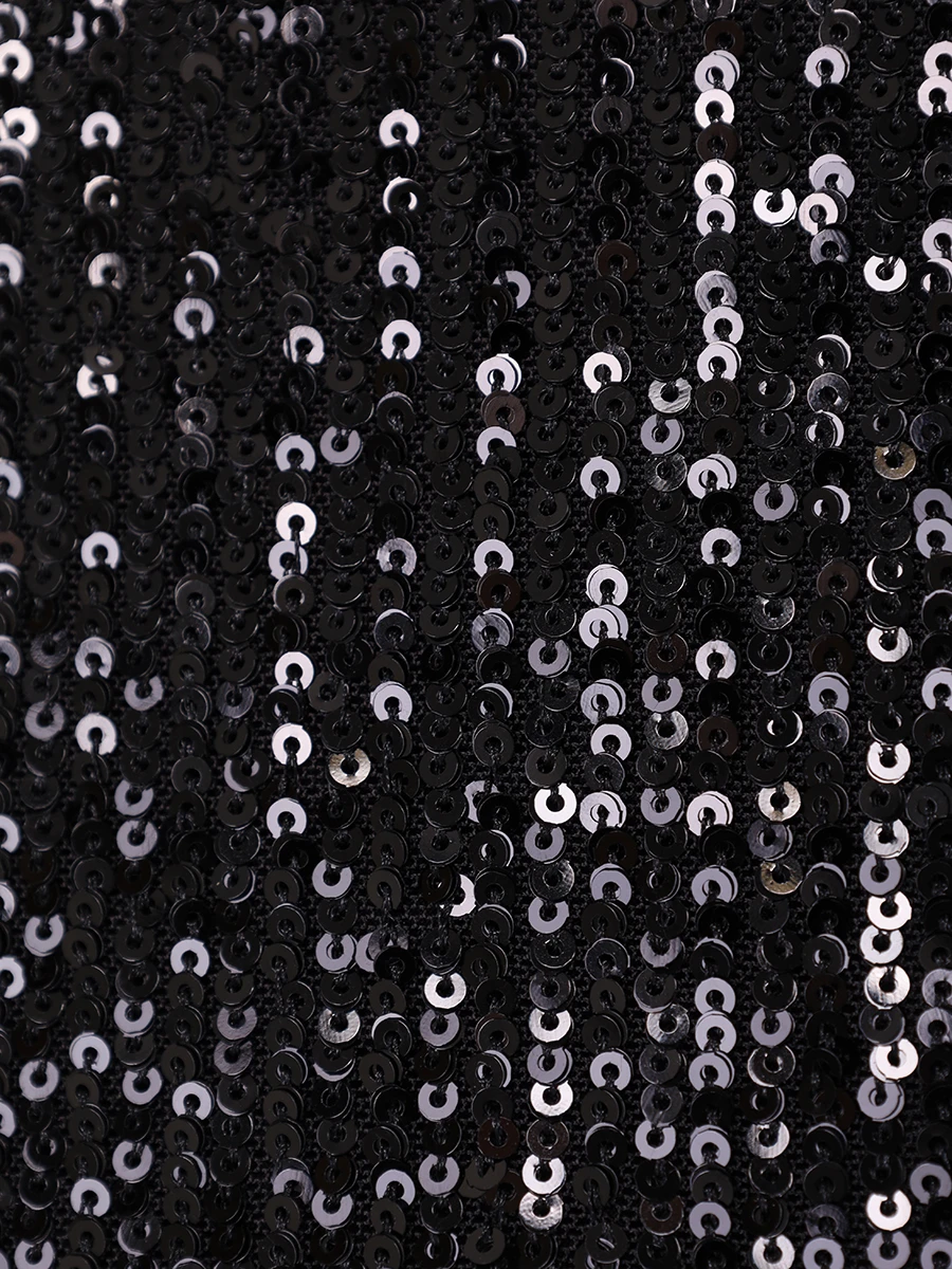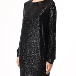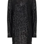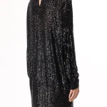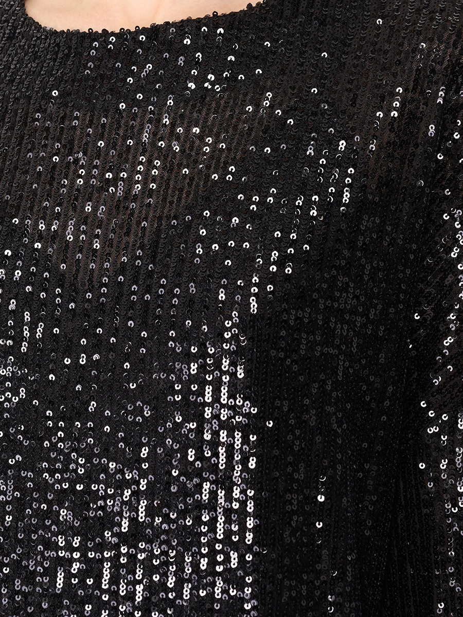 -Черное мини-платье из стрейч-ткани, расшитой пайетками, от IN THE MOOD FOR LOVE. -Модель свободного кроя с длинными рукавами, широким округлым вырезом горловины, вырезом сзади на пуговице. -Пайетки будут реагировать на каждое движение тела и создавать легкий искрящийся эффект. -Платье дополнено нижним базовым платьем в бельевом стиле на узких бретелях.