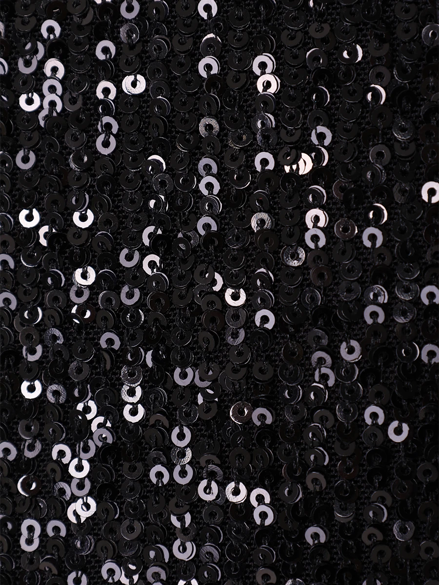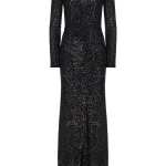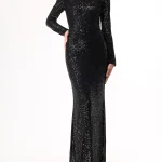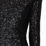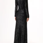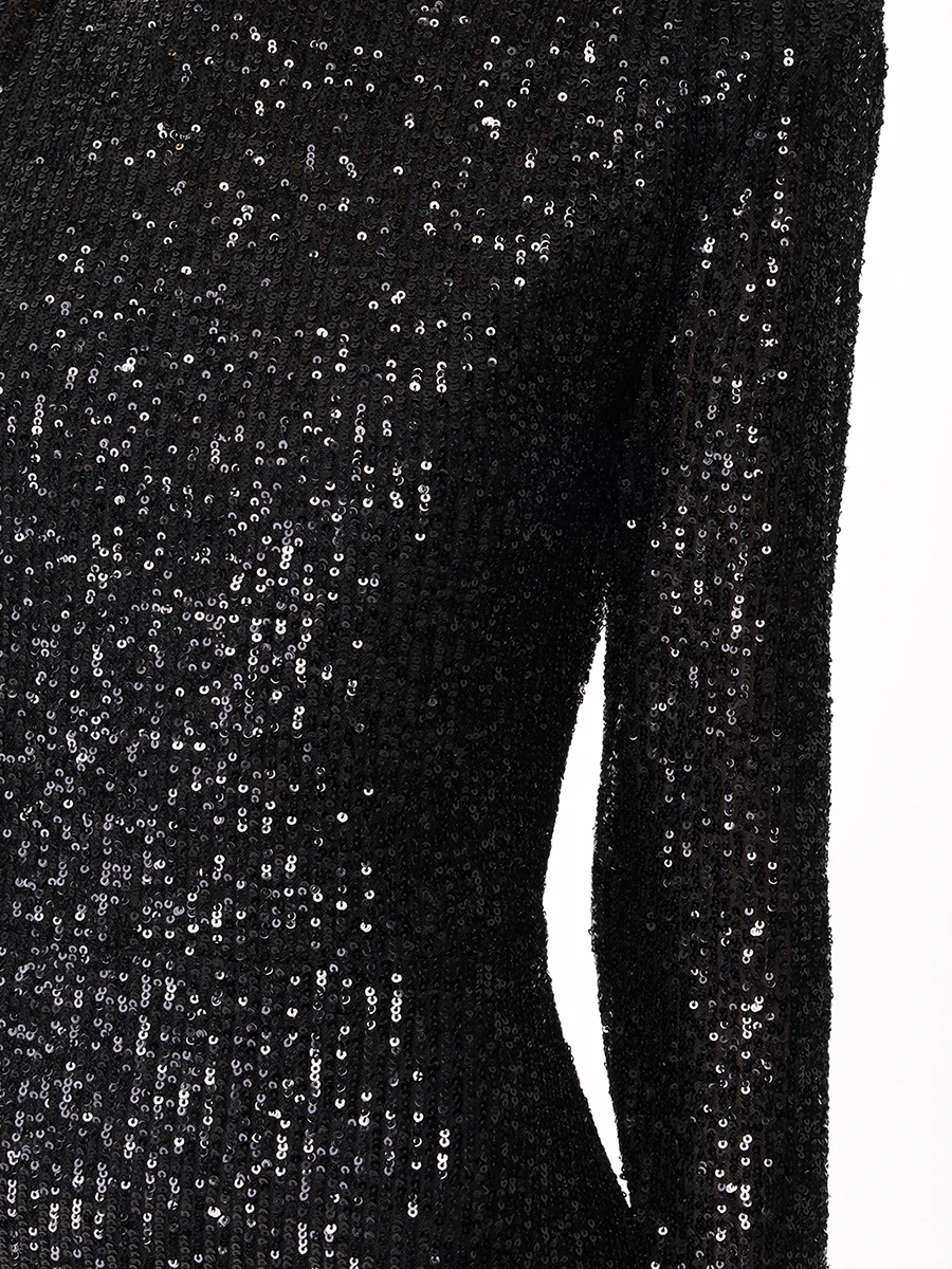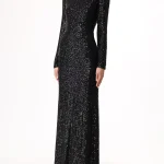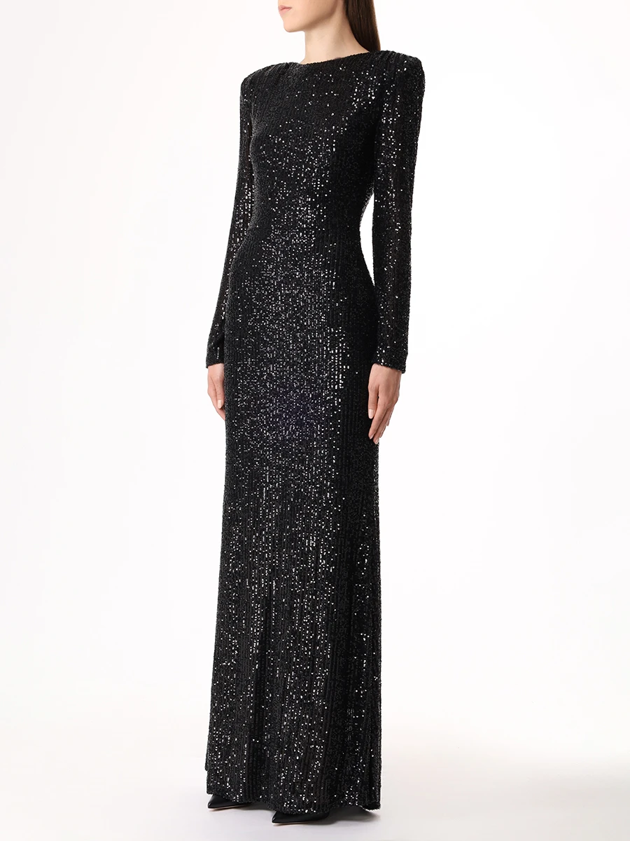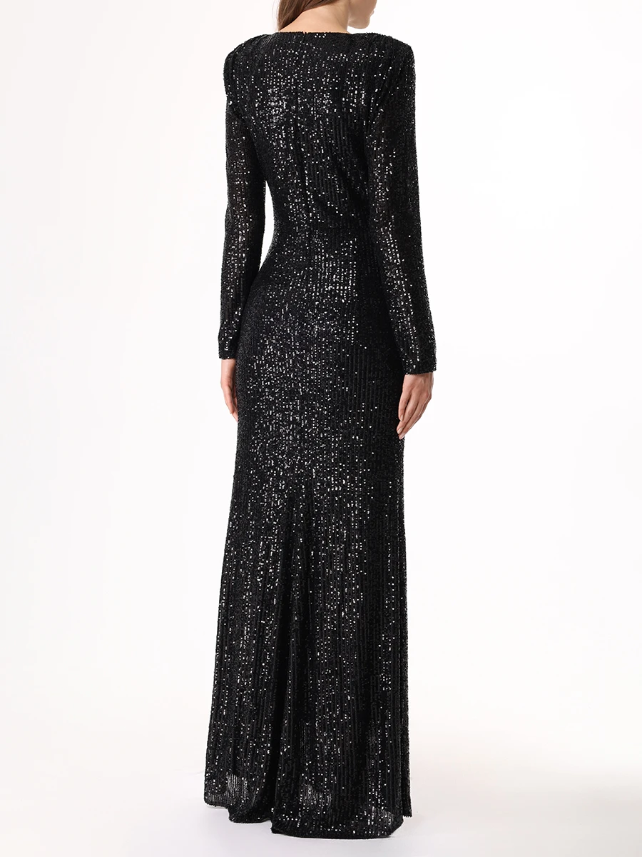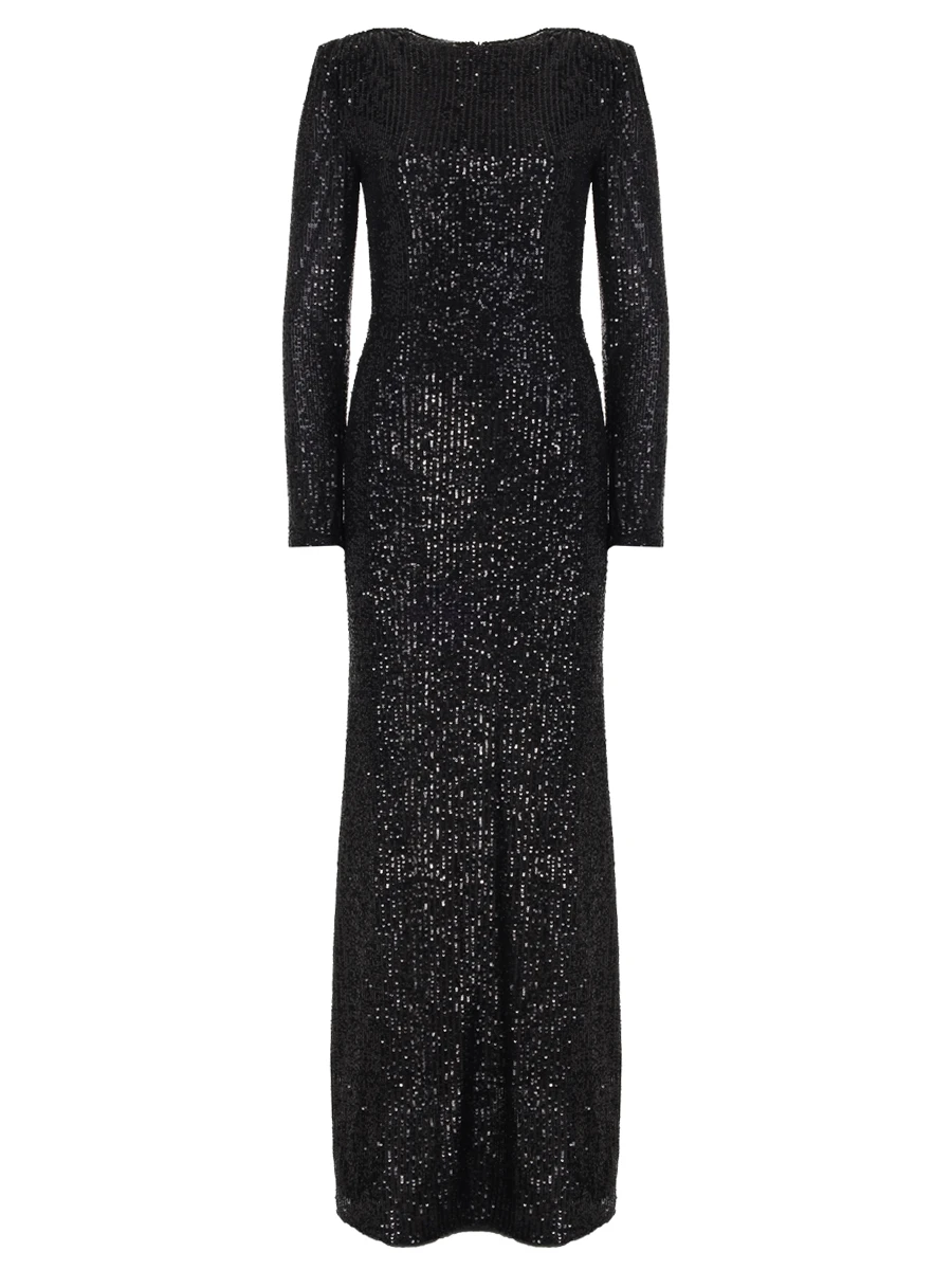 -Черное вечернее платье-макси, расшитое пайетками, от IN THE MOOD FOR LOVE. -Модель в пол с акцентом кроя на талии и бедрах, длинными рукавами, круглым вырезом горловины и застежкой на потайную молнию. -Небольшие пайетки в тон повторяют движения тела, создавая искрящийся эффект.