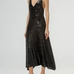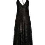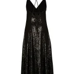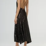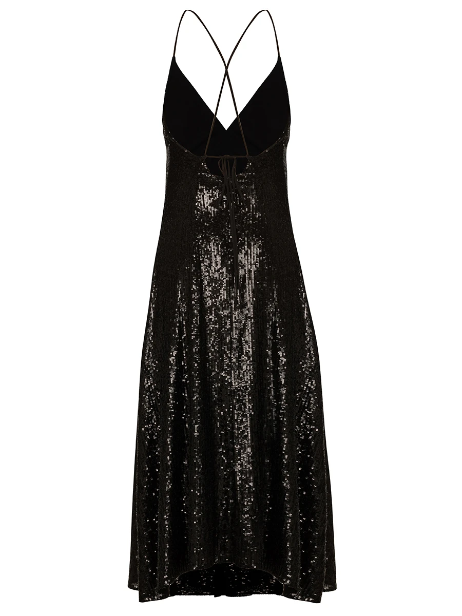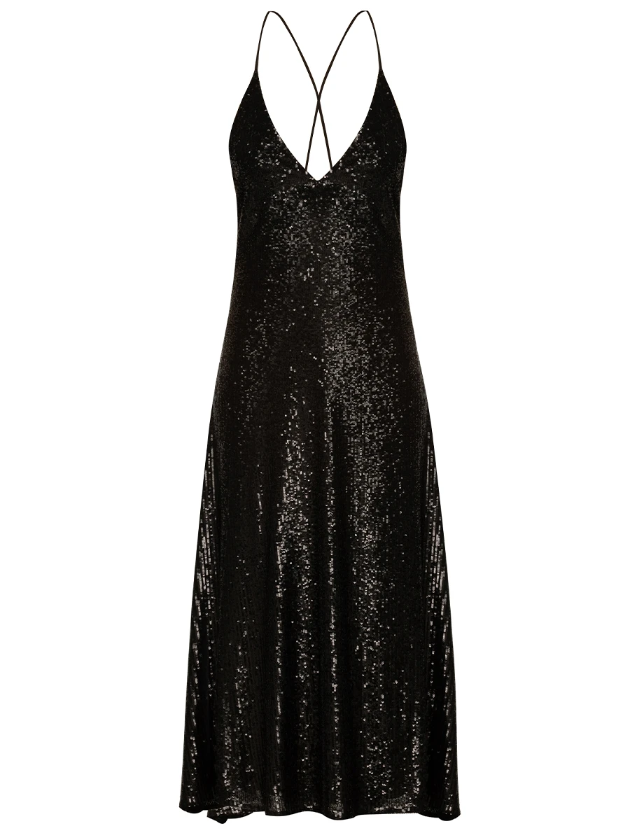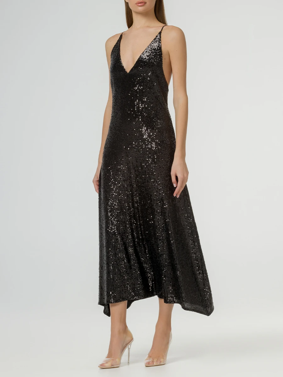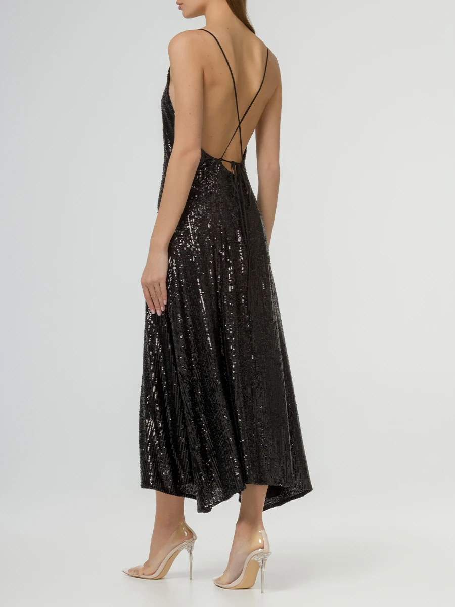 -Черное платье-миди из тонкого трикотажа, расшитого пайетками, от IRKE. -Расклешенная модель с глубоким вырезом декольте, узкими бретелями, перекрестными на спине, застежкой на потайную молнию. -Платье в паре с базовыми лодочками сформируют эффектный вечерний образ, который дополнят сдержанные украшения.
