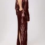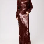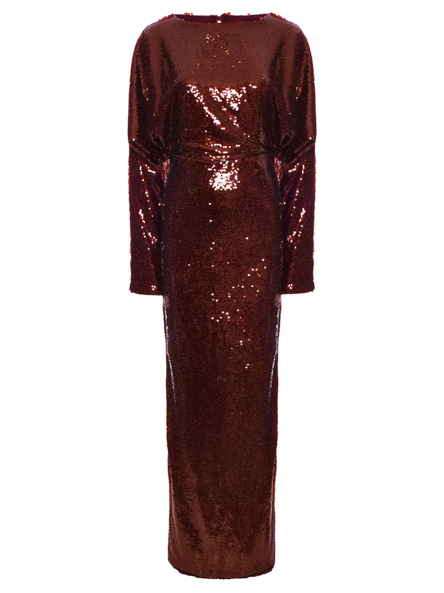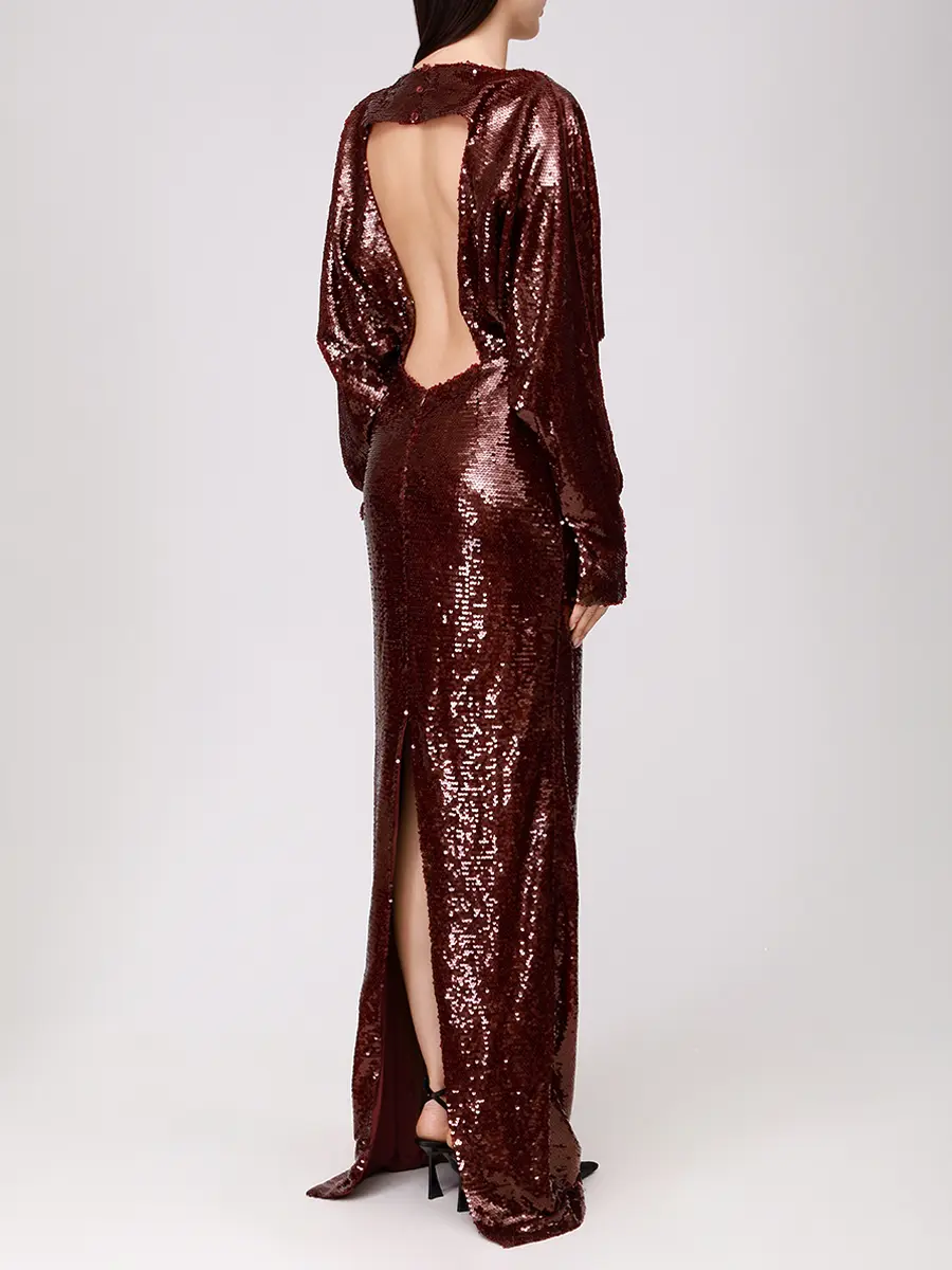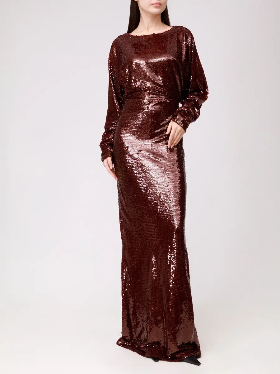 -Бордовое платье с пайетками от PHATEMM. -Модель полуприлегающего кроя со спущенной линией плеча, длинными рукавами, круглым вырезом горловины, глубоким вырезом на спине, высоким разрезом сзади, застежкой на потайную молнию. -Элегантное платье дополнит вечерние образы.