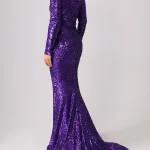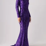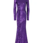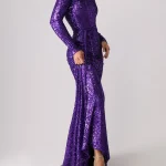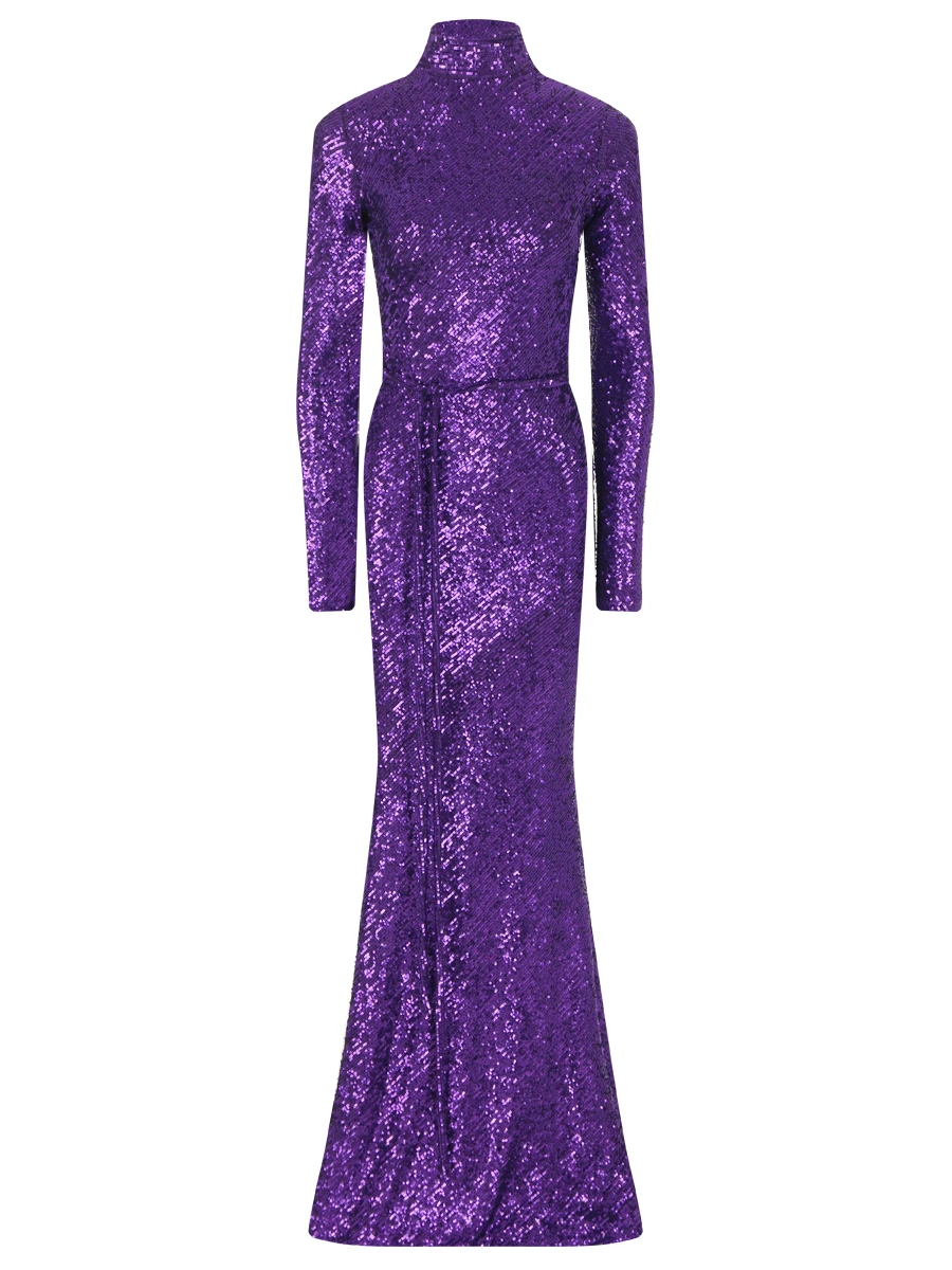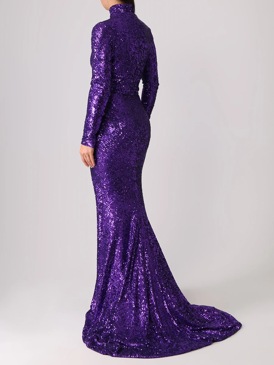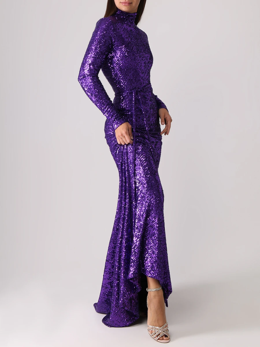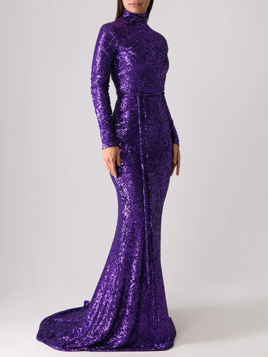 -Платье с пайетками фиолетового цвета от SASHAVERSE. -Длина макси, облегающий силуэт, длинные рукава, воротник-стойка.