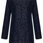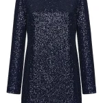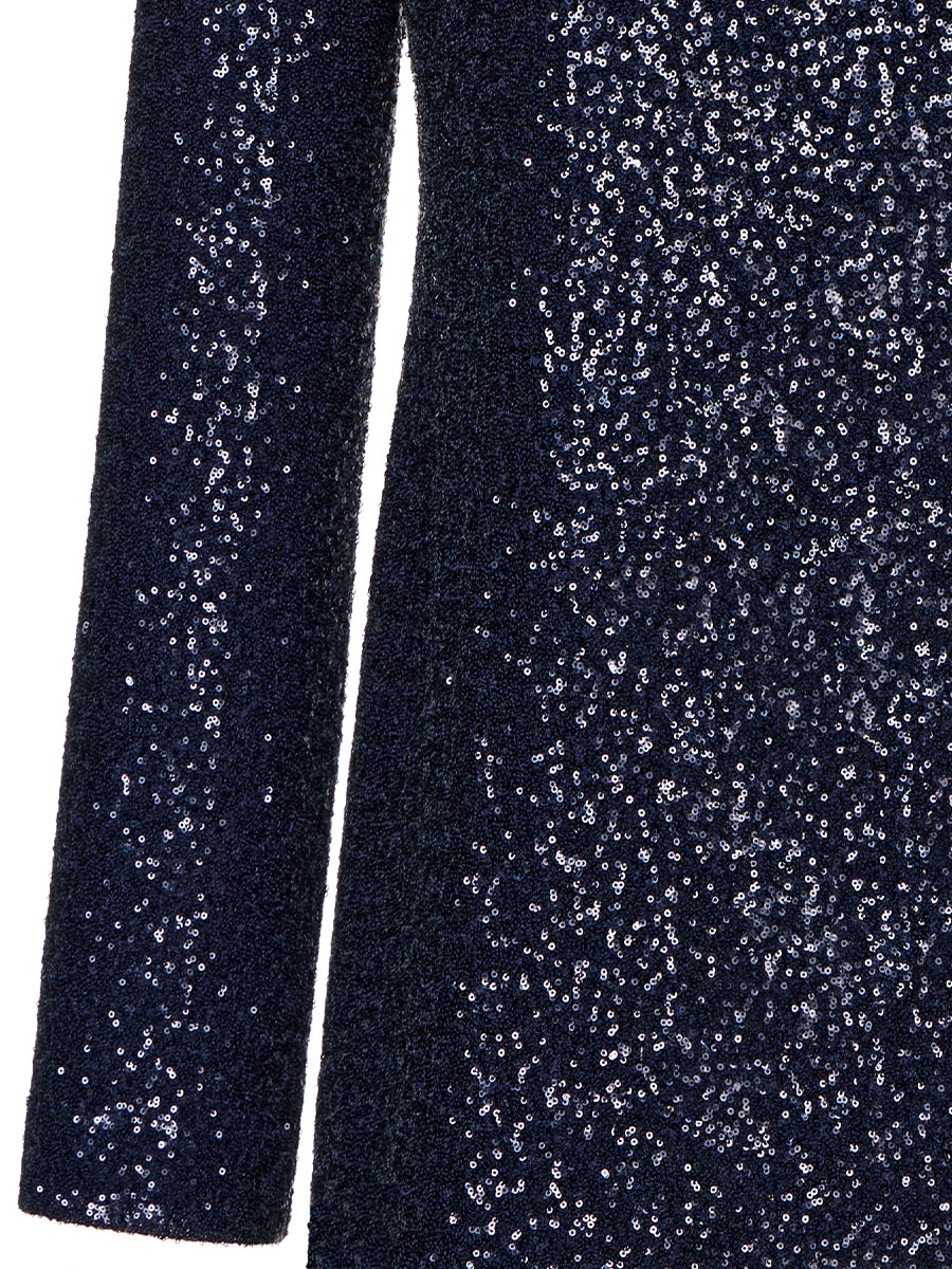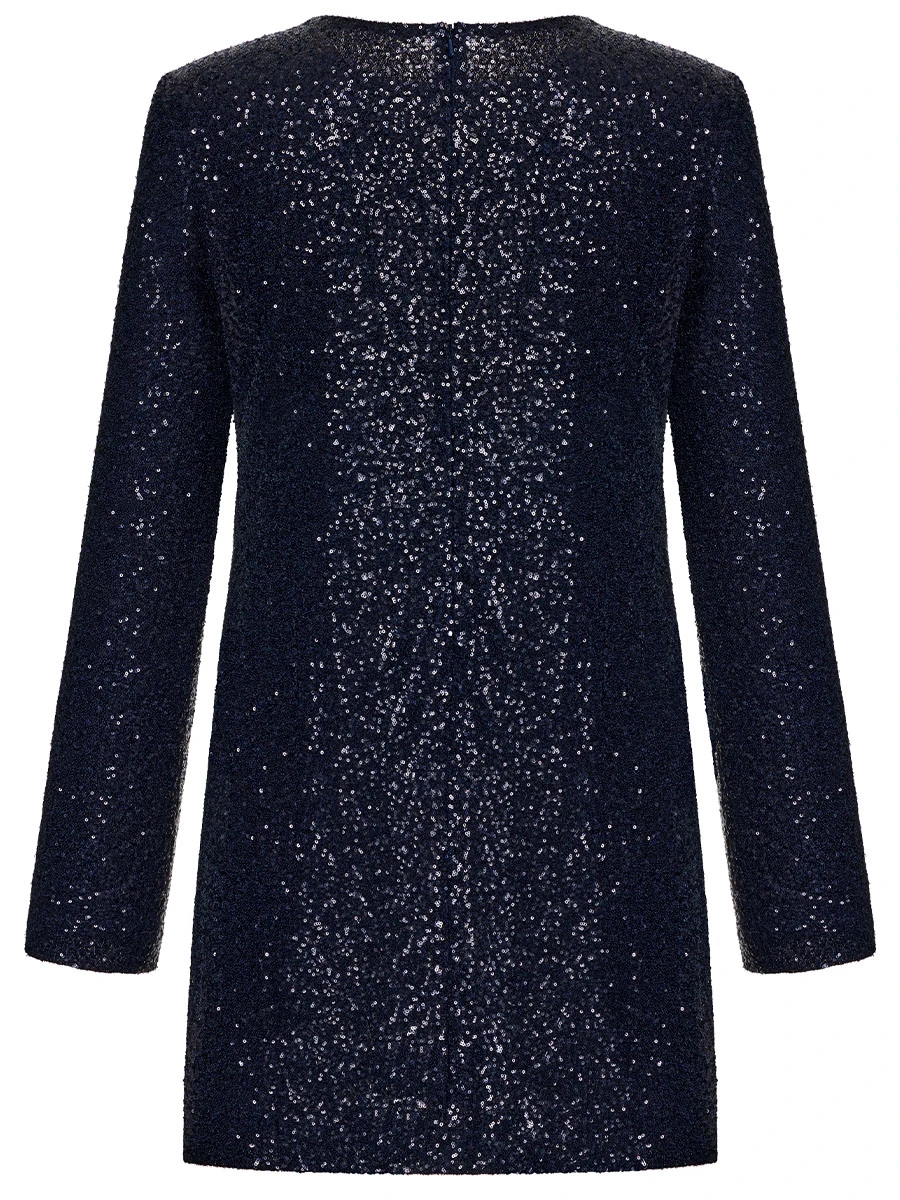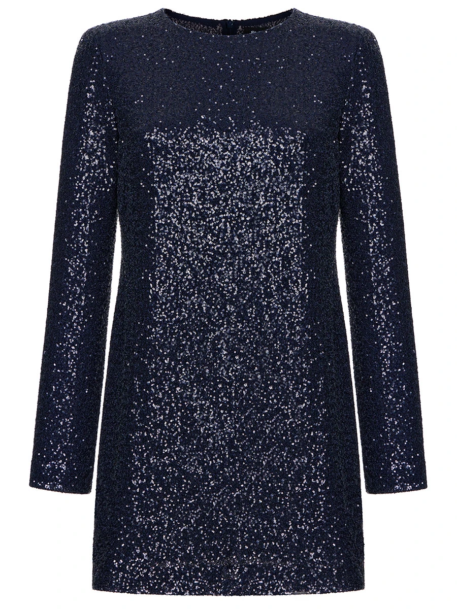 -Синее платье-мини с пайетками от ST. ERME. -Модель полуприлегающего кроя с длинными рукавами, круглым вырезом горловины и застежкой на потайную молнию на спинке.