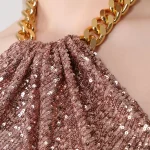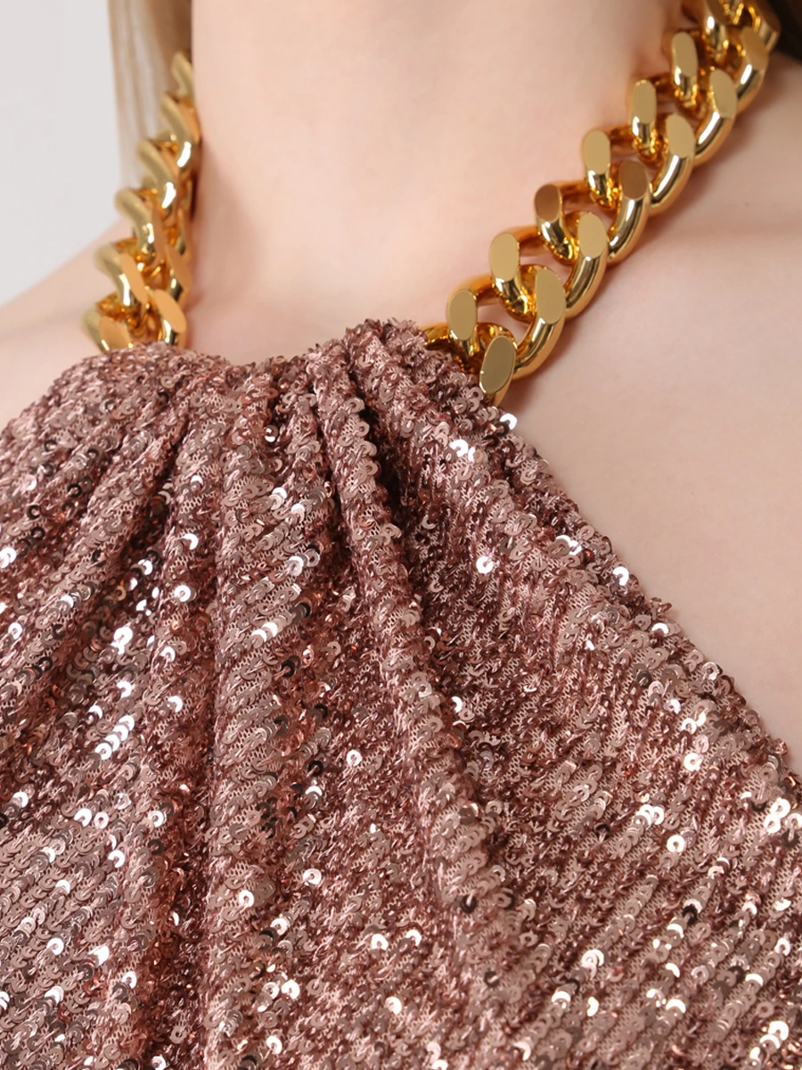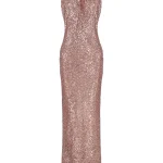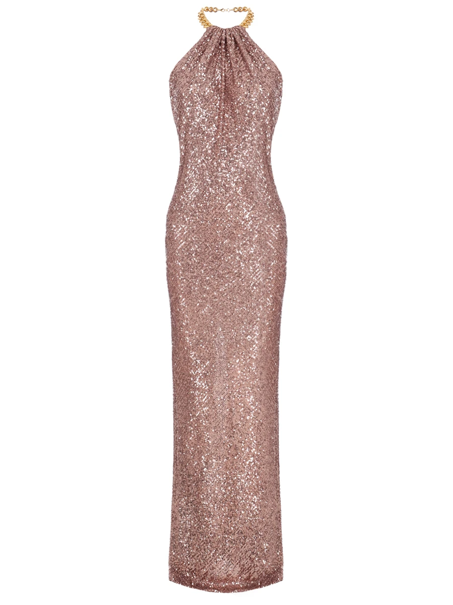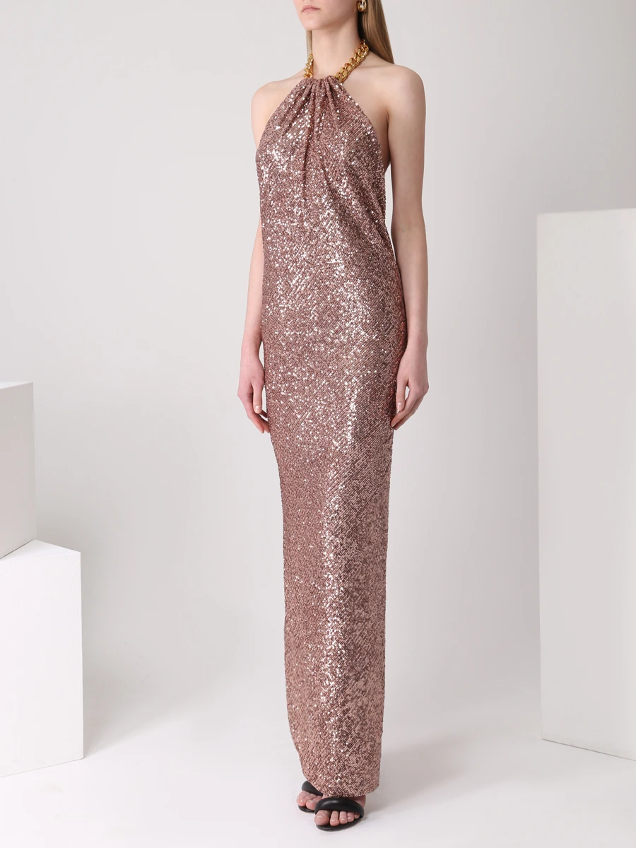 -Платье персикового цвета из мягкого шелковистого текстиля, который практически не ощущается на теле, от TOM FORD. -Пайетки всегда смотрятся выигрышно, даже если украшают вещь лаконичного кроя, поэтому в этом платье однозначно нужно блистать на вечерних мероприятиях. -Модель в пол со спокойным дизайном спереди дополнена массивной золотистой цепочкой на шее, вокруг которой задрапирована ткань, а открытая спинка и высокий разрез добавляют платью провокации.