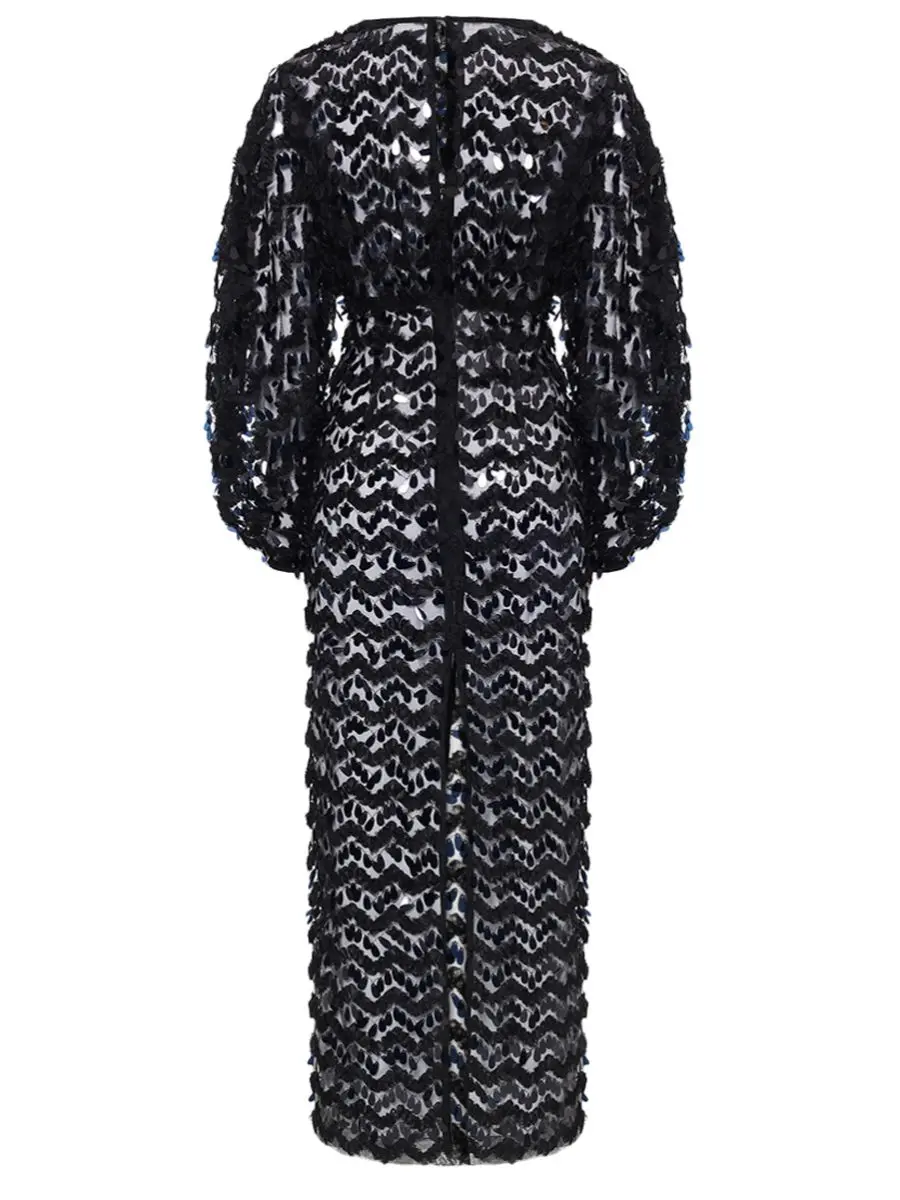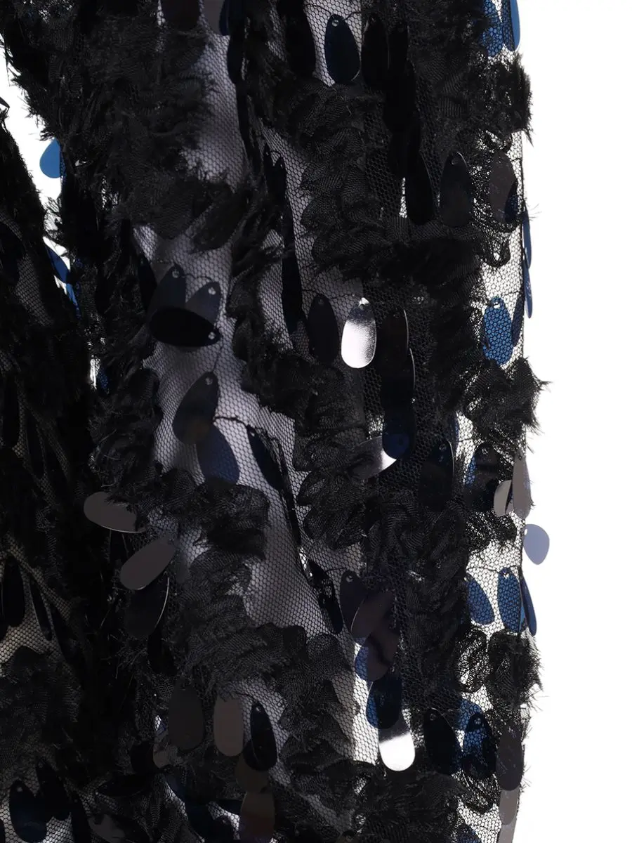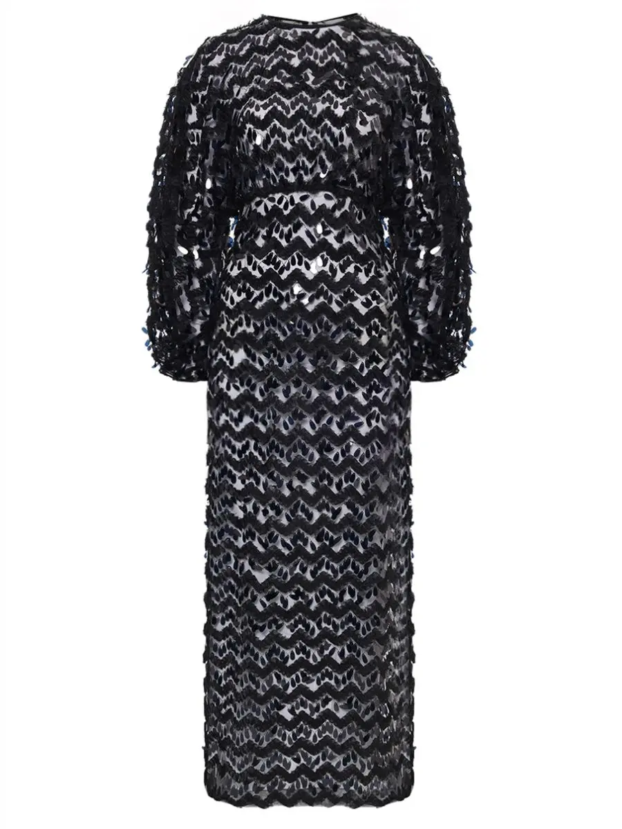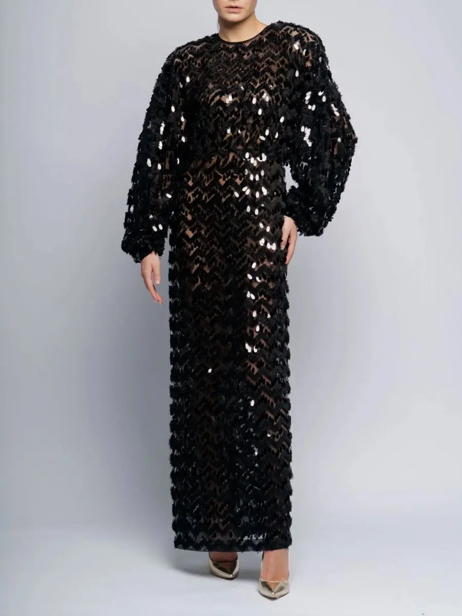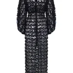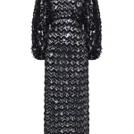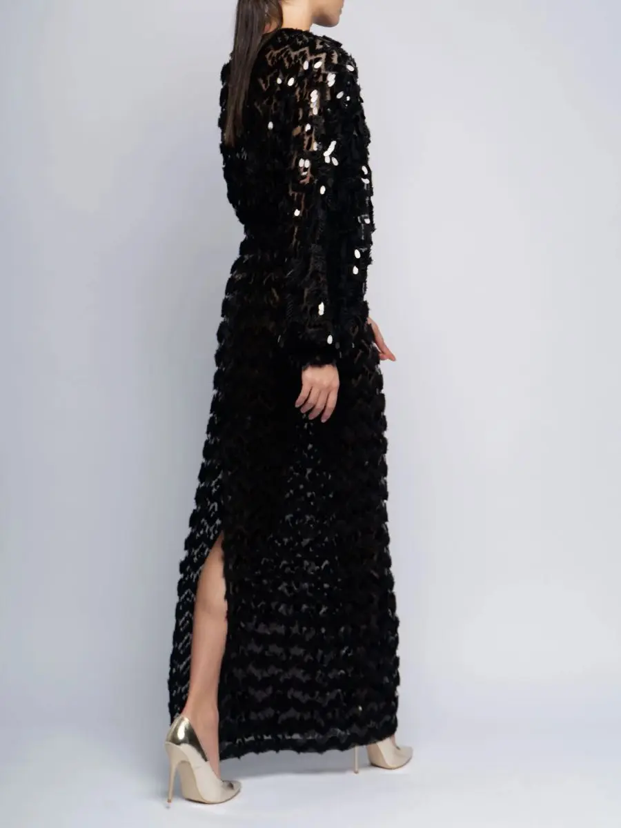 -Черное платье-макси из сетки с пайетками от TOOMATCH. -Модель полуприлегающего силуэта с длинными рукавами, круглым вырезом горловины и прямой юбкой с разрезом сзади. -Лаконичное платье уместно дополнит коктейльные или вечерние мероприятия. Размерная сетка: XS-S: длина рукава с плечом-81, ширина по талии-62, ширина по бедрам-96, длина по спинке от плечевого шва-141, ширина рукава в области локтя-48, ширина рукава по низу-26; M-L: длина рукава с плечом-84, ширина по талии-66, ширина по бедрам-104, длина по спинке от плечевого шва-145, ширина рукава в области локтя-54, ширина рукава по низу-28.