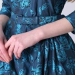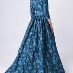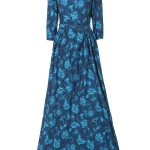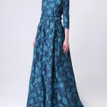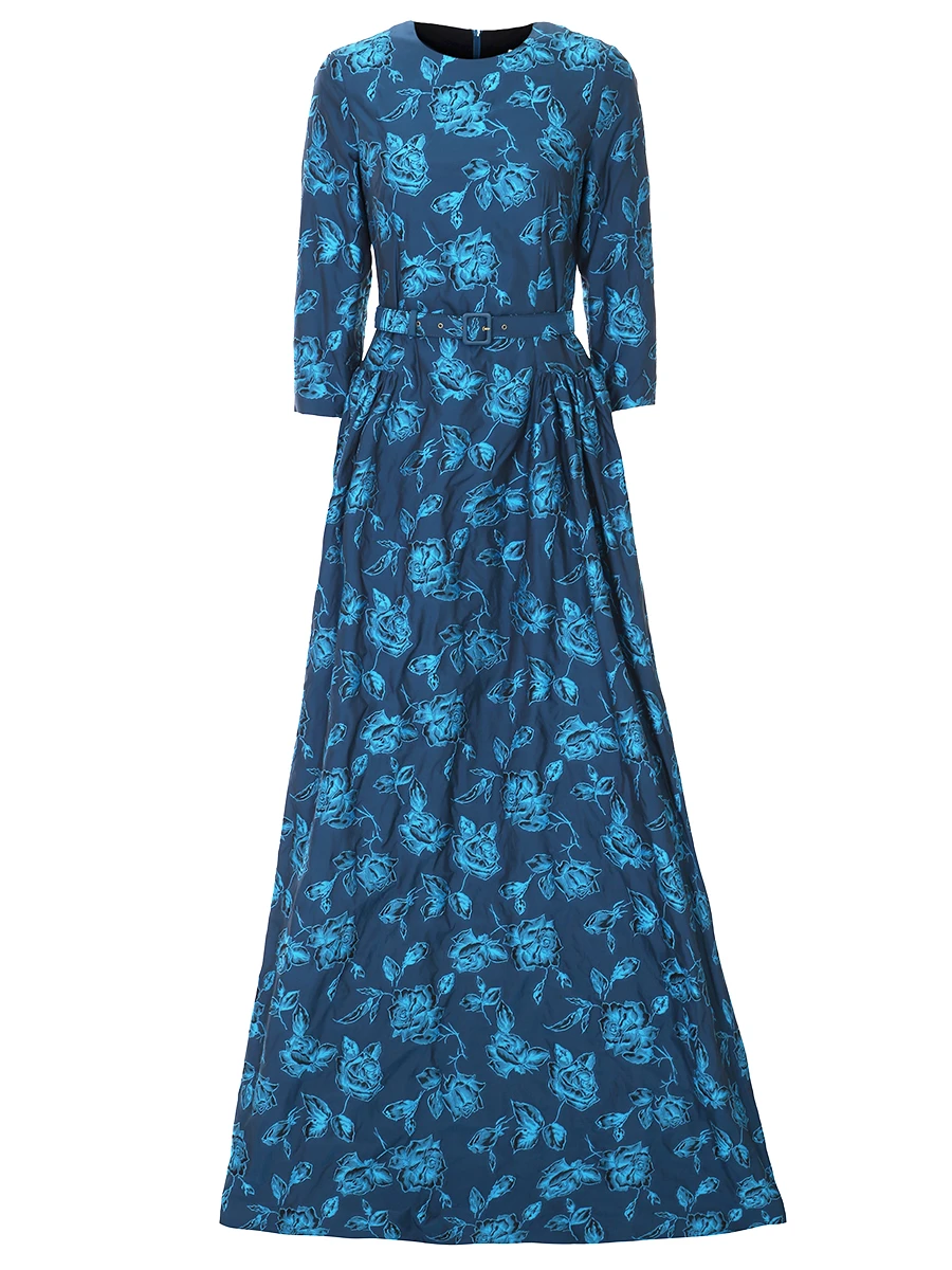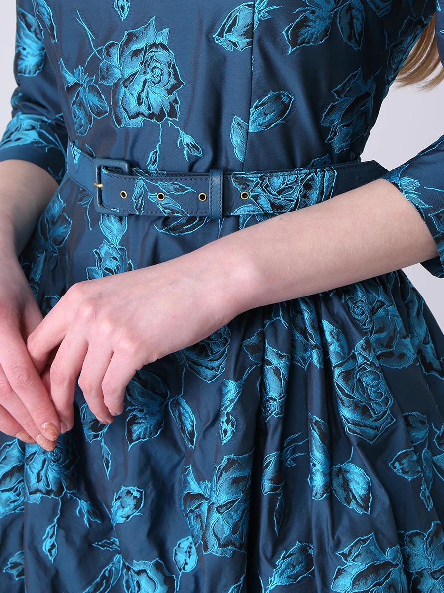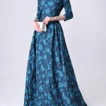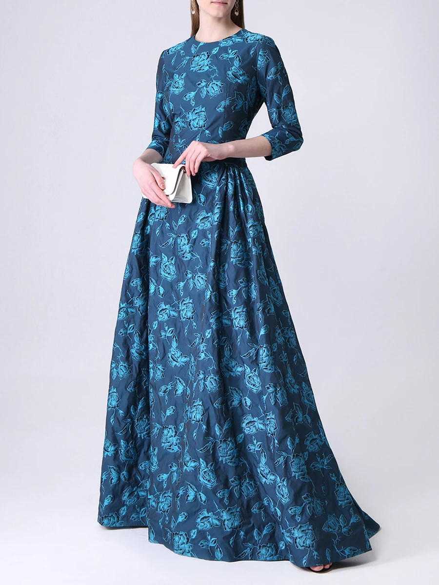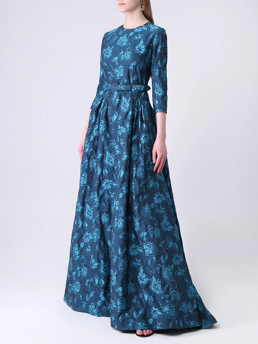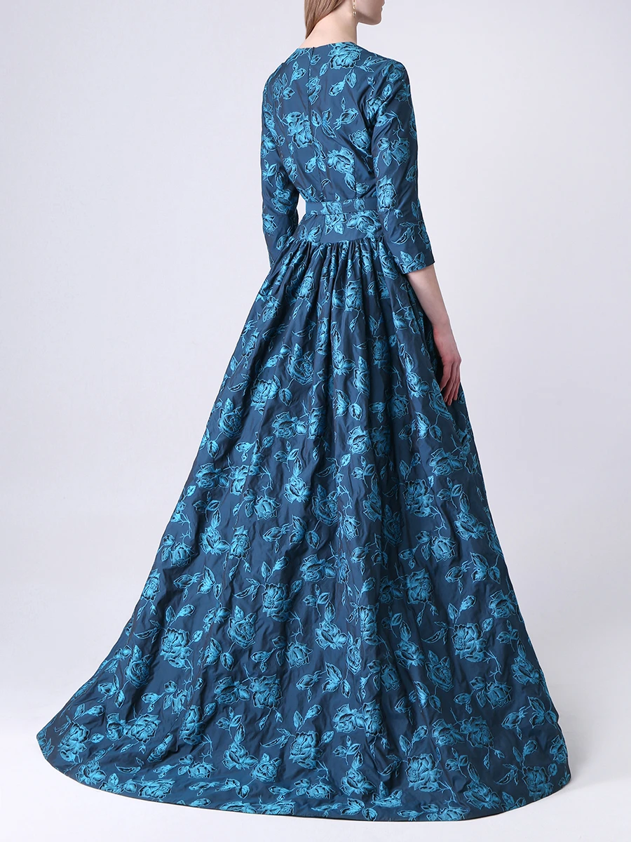 -Изысканное платье в пол цвета морской волны с крупным цветочным принтом от ALEXANDER TEREKHOV. -Приталенный крой с акцентным поясом, расклешенная юбка с небольшим шлейфом, укороченные рукава, круглый вырез горловины, молния на спинке. -Данный товар отправляется только по полной предоплате.