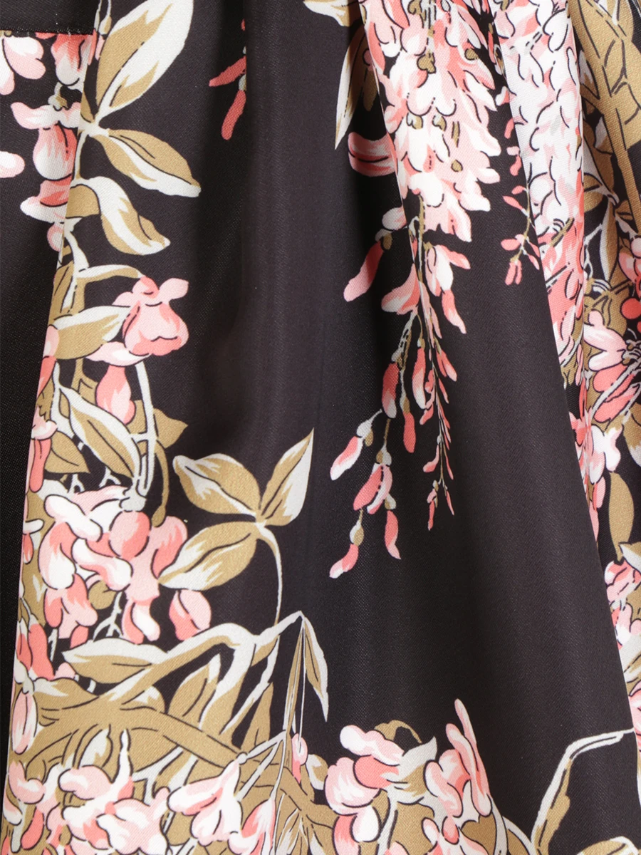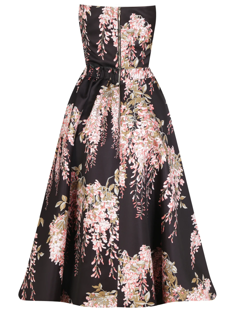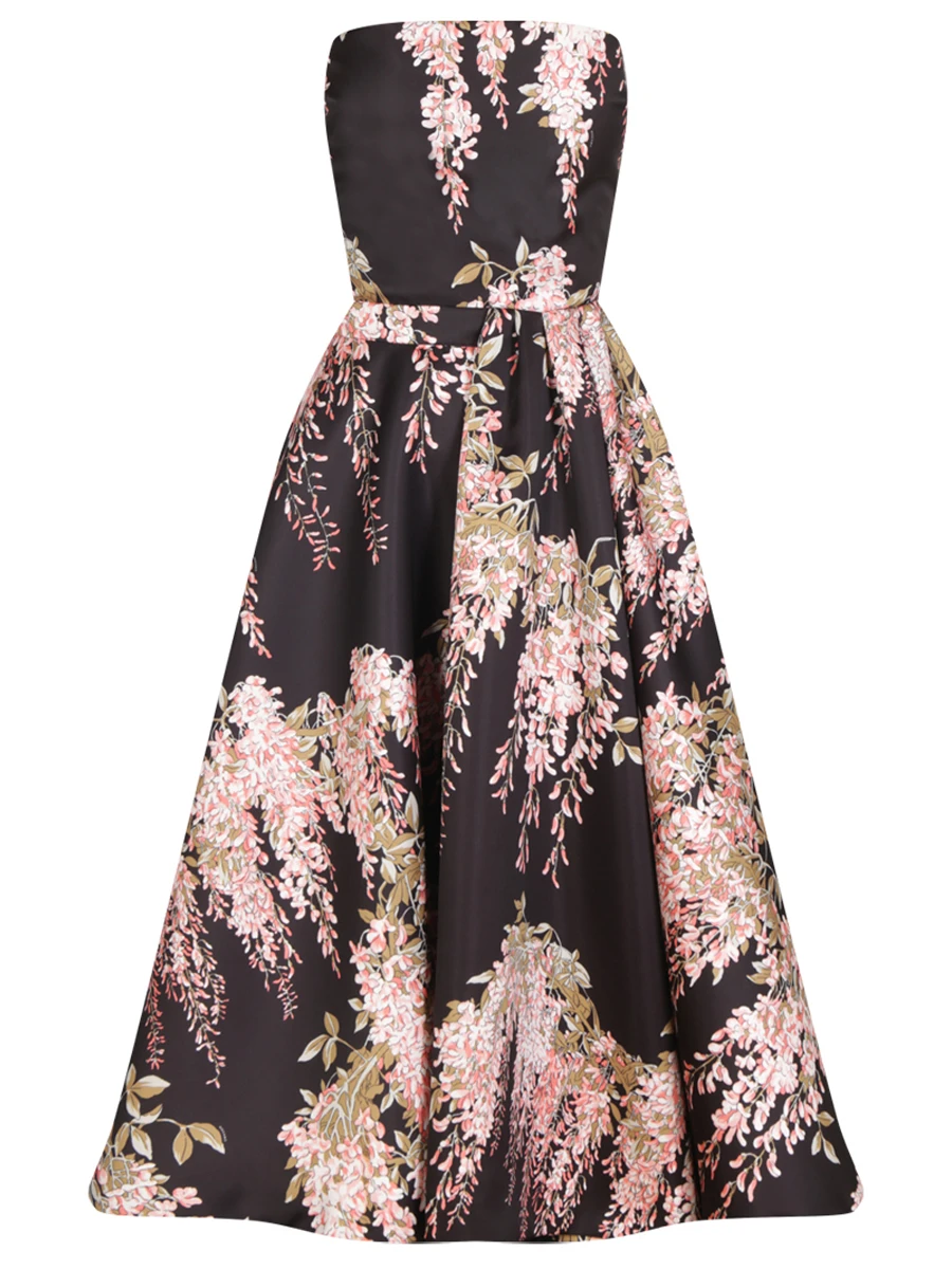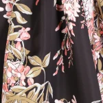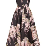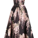 -Коричневое платье с цветочным принтом из костюмной ткани от ROCHAS. -Модель приталенного кроя с эластичным поясом, подчеркивающим фигуру, открытой линией плеча, застежкой на молнию на спинке.