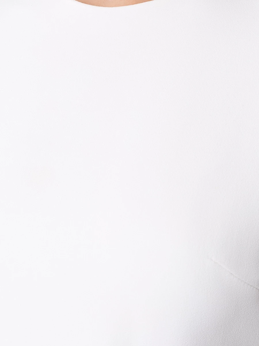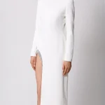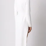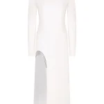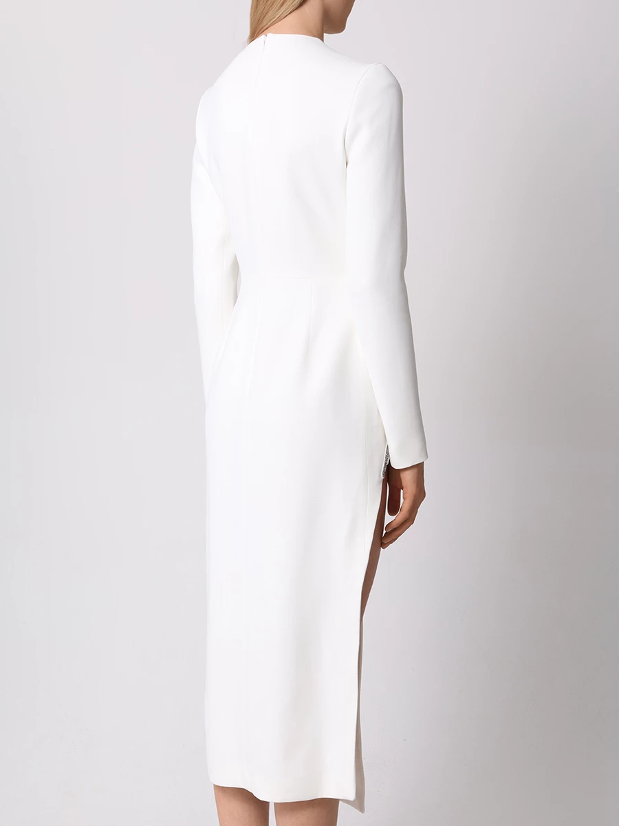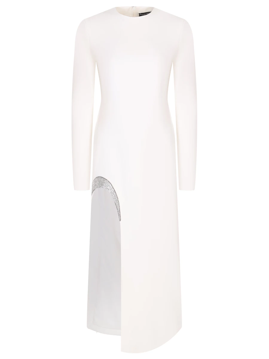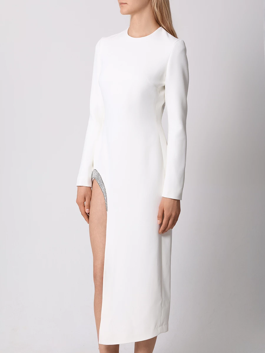 -Белое платье-миди купажированного состава от DAVID KOMA. -Модель с длинными рукавами, акцентом на талии и бедрах, круглым вырезом горловины и застежкой на потайную молнию сзади. -Лаконичный крой дополняет вырез на бедре, подчеркнутый крупными стразами, которые добавляют образу искрящиеся блики.