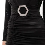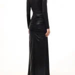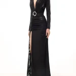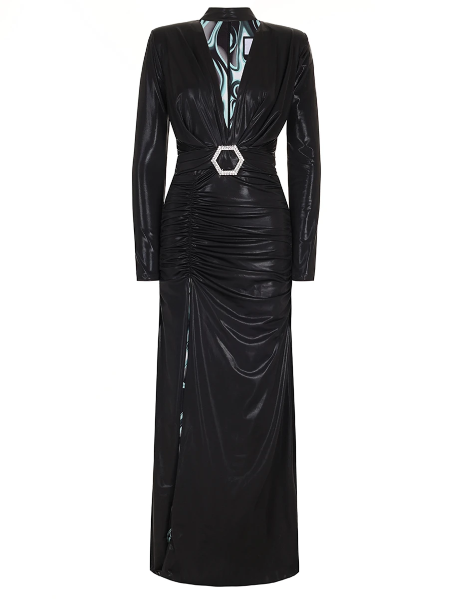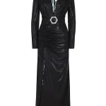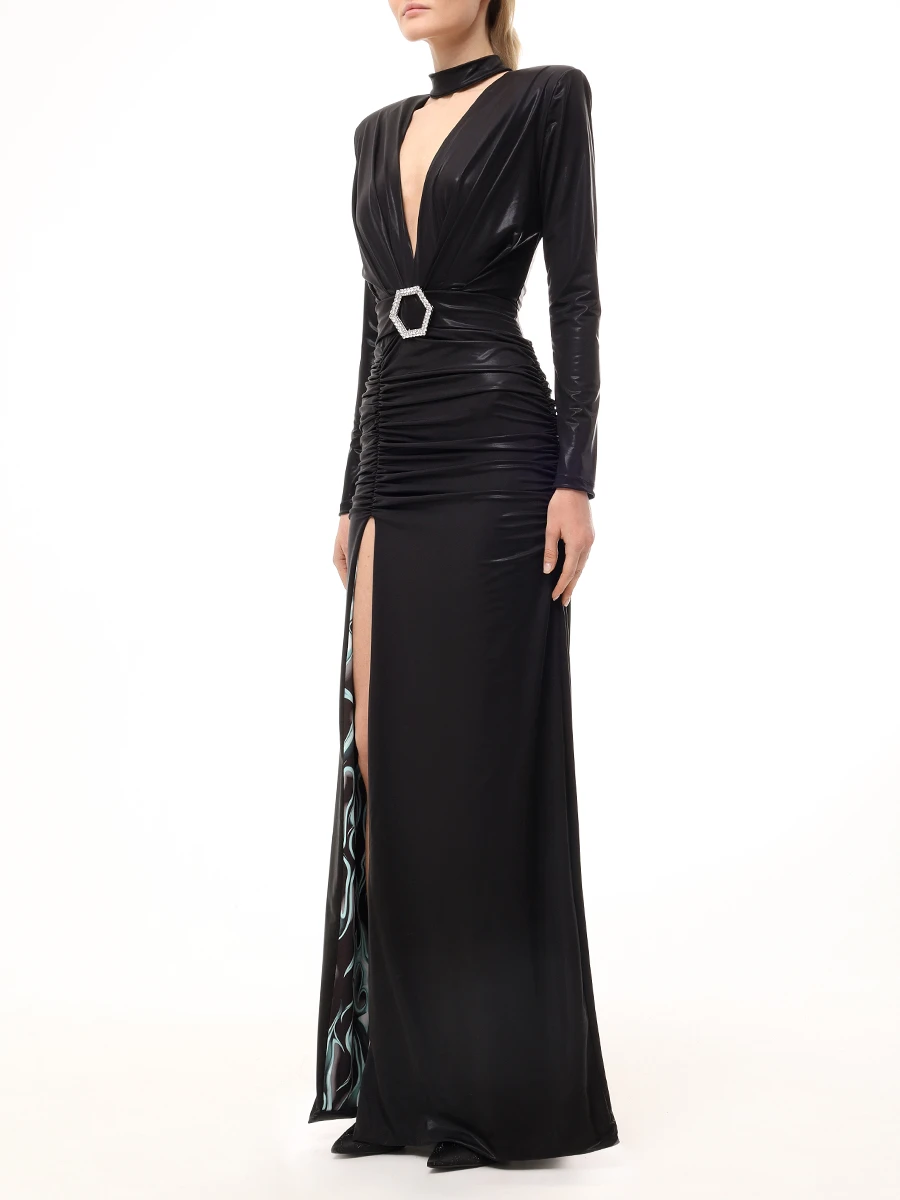 -Черное платье-макси из стрейч-ткани от PHILIPP PLEIN. -Модель с пол с акцентом кроя на талии и бедрах, длинными рукавами, глубоким V-образным вырезом декольте, сборками, высоким разрезом спереди на бедре. -Подчеркивает талию и структурирует силуэт широкий пояс с крупной пряжкой в форме логотипа Hexagon.